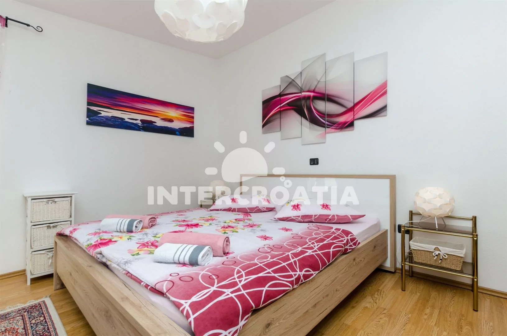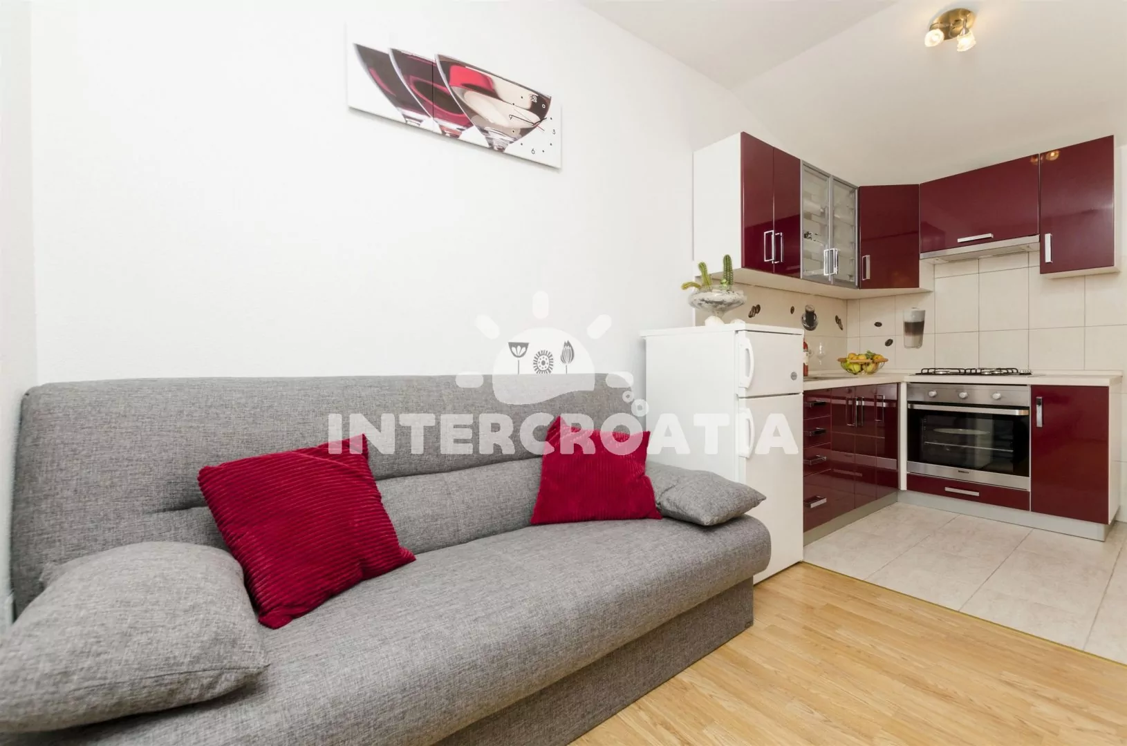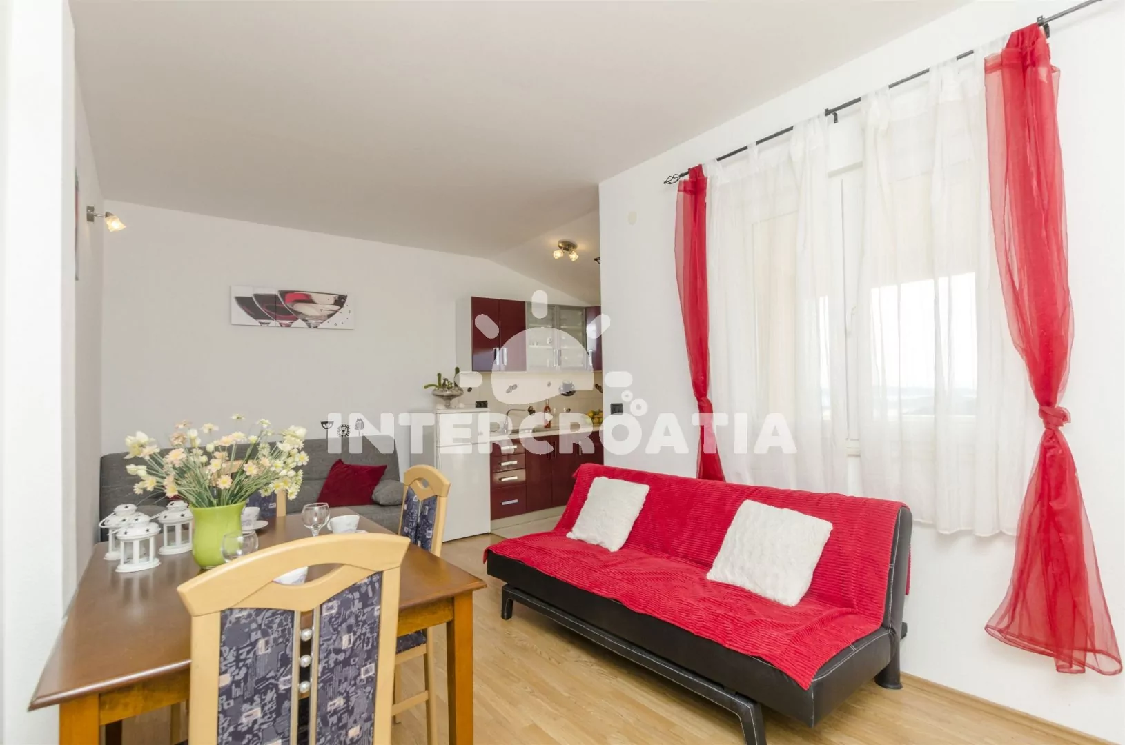 Apartmán (42 m2) s vlastní terasou a výhledem na moře se nachází v 1. patře vily a je vhodný pro 2 až 4 osoby. Obývací pokoj je spojený s kuchyní. Kuchyňská linka je vybavena varnou deskou, digestoří, troubou, rychlovarnou konvicí, mikrovlnnou troubou, kávovarem, toustovačem, nádobím a lednicí s mrazákem. Obývací pokoj s jídelním stolem, dvěma pohovkami (rozložitelná na extra lůžko pro 2 osoby), televizí se satelitním programem, radiem, klimatizací a vstupem na terasu. Ložnice s jedním dvoulůžkem. Koupelna se sprchovým koutem, umyvadlem, fénem, pračkou a wc. Hostům je k dispozici parkování u objektu zdarma.
