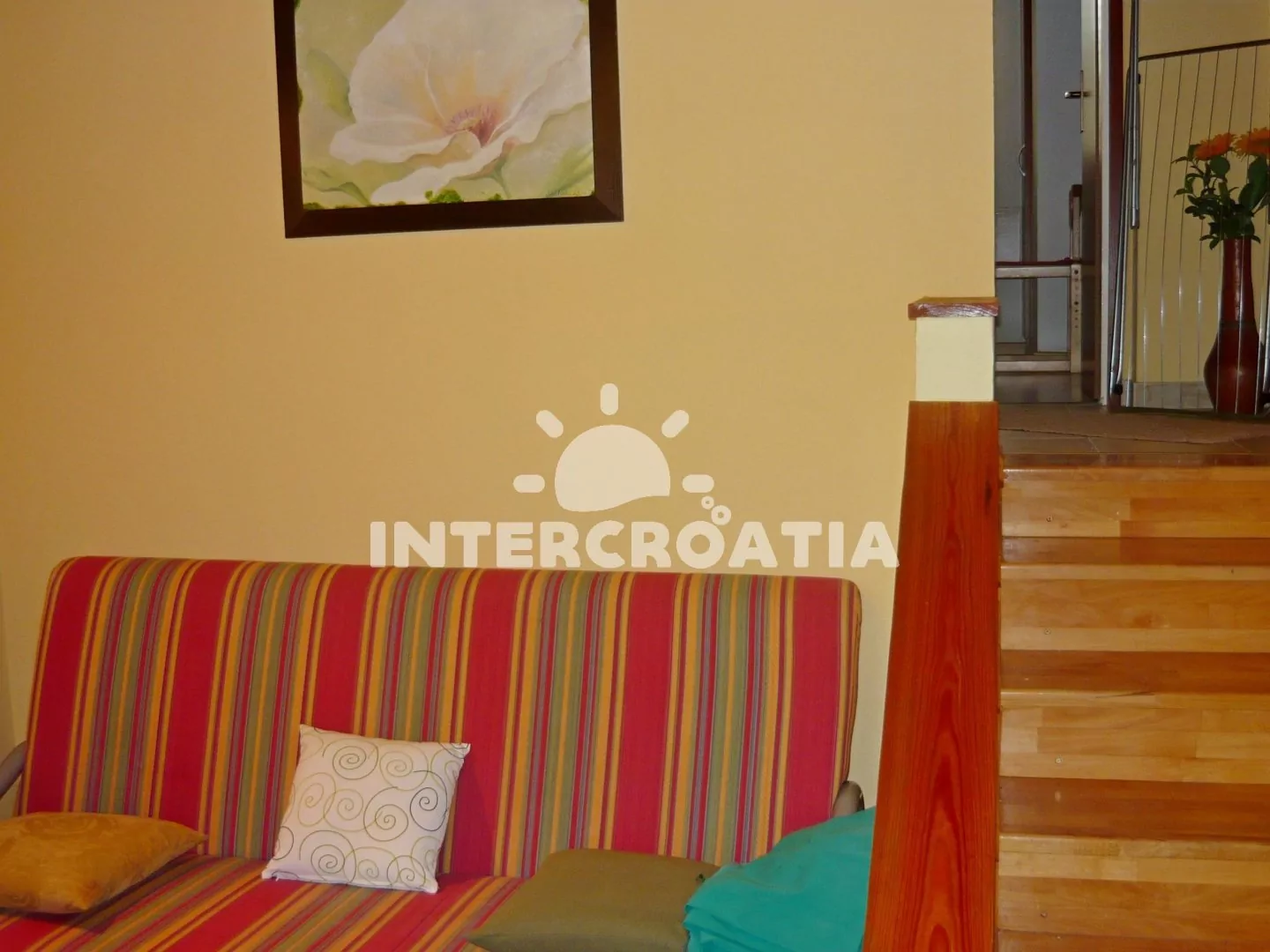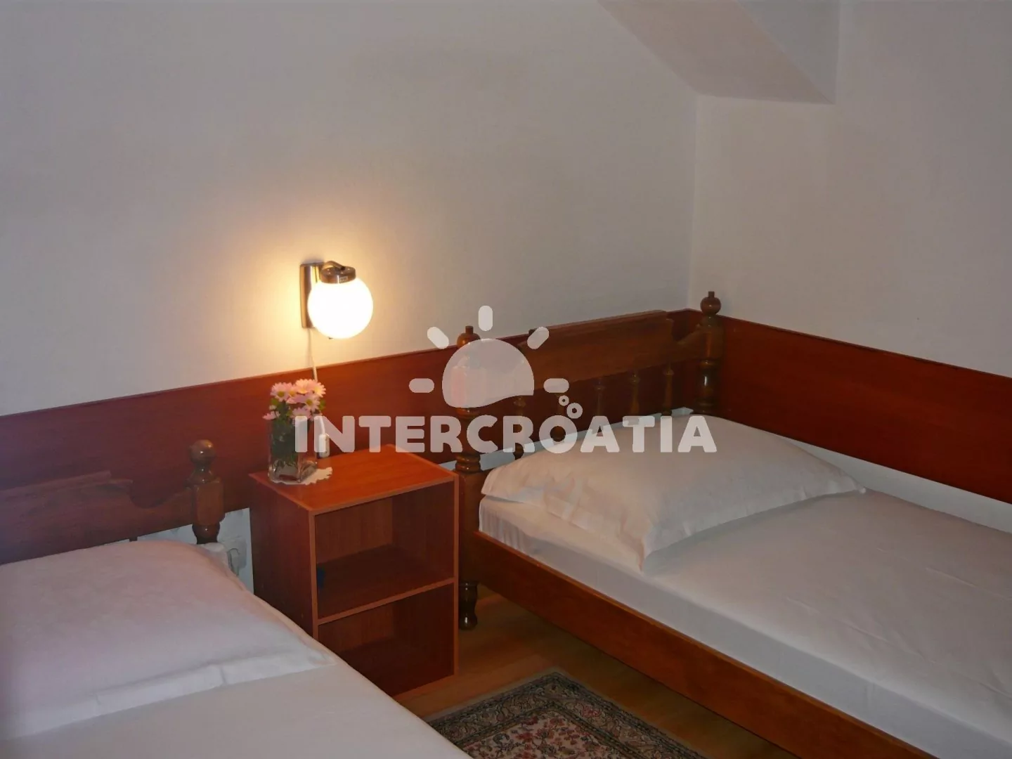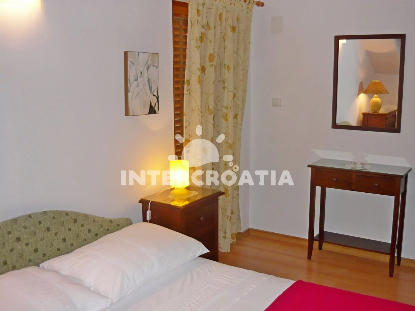 Dvoupatrový apartmán (60 m2) s terasou, venkovním posezením a výhledem na moře je vhodný pro 4 až 5 osob. Obývací pokoj je spojený s kuchyní. Kuchyňská linka je vybavena sporákem s troubou, digestoří, myčkou na nádobí, rychlovarnou konvicí, mikrovlnnou troubou, toustovačem, kávovarem, nádobím a lednicí s mrazákem. Obývací pokoj s jídelním stolem, pohovkou (rozložitelná na extra lůžko pro 1 osobu), televizí se satelitním programem, radiem, klimatizací a vstupem na terasu. První ložnice je vybavena jedním dvoulůžkem. Druhá ložnice s dvěma jednolůžky. Koupelna se sprchovým koutem, umyvadlem, pračkou a wc. Hostům je k dispozici parkování u objektu zdarma.