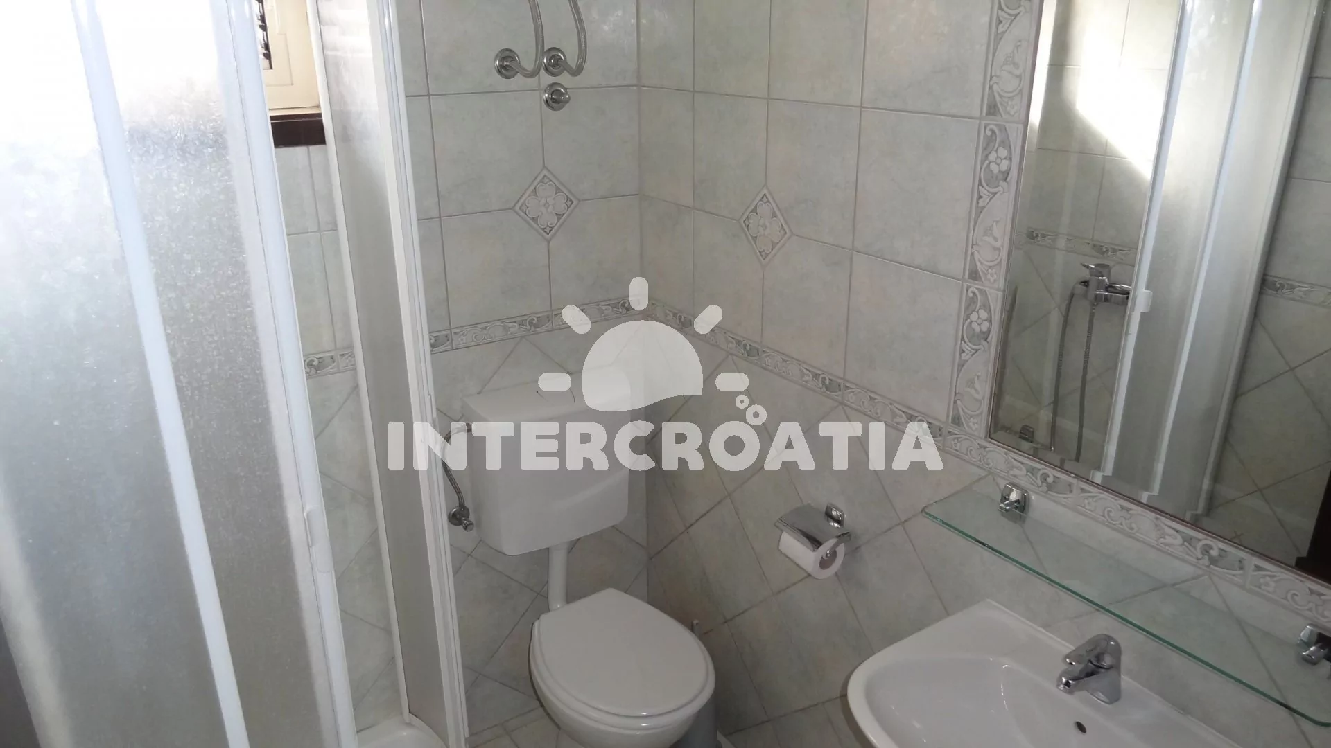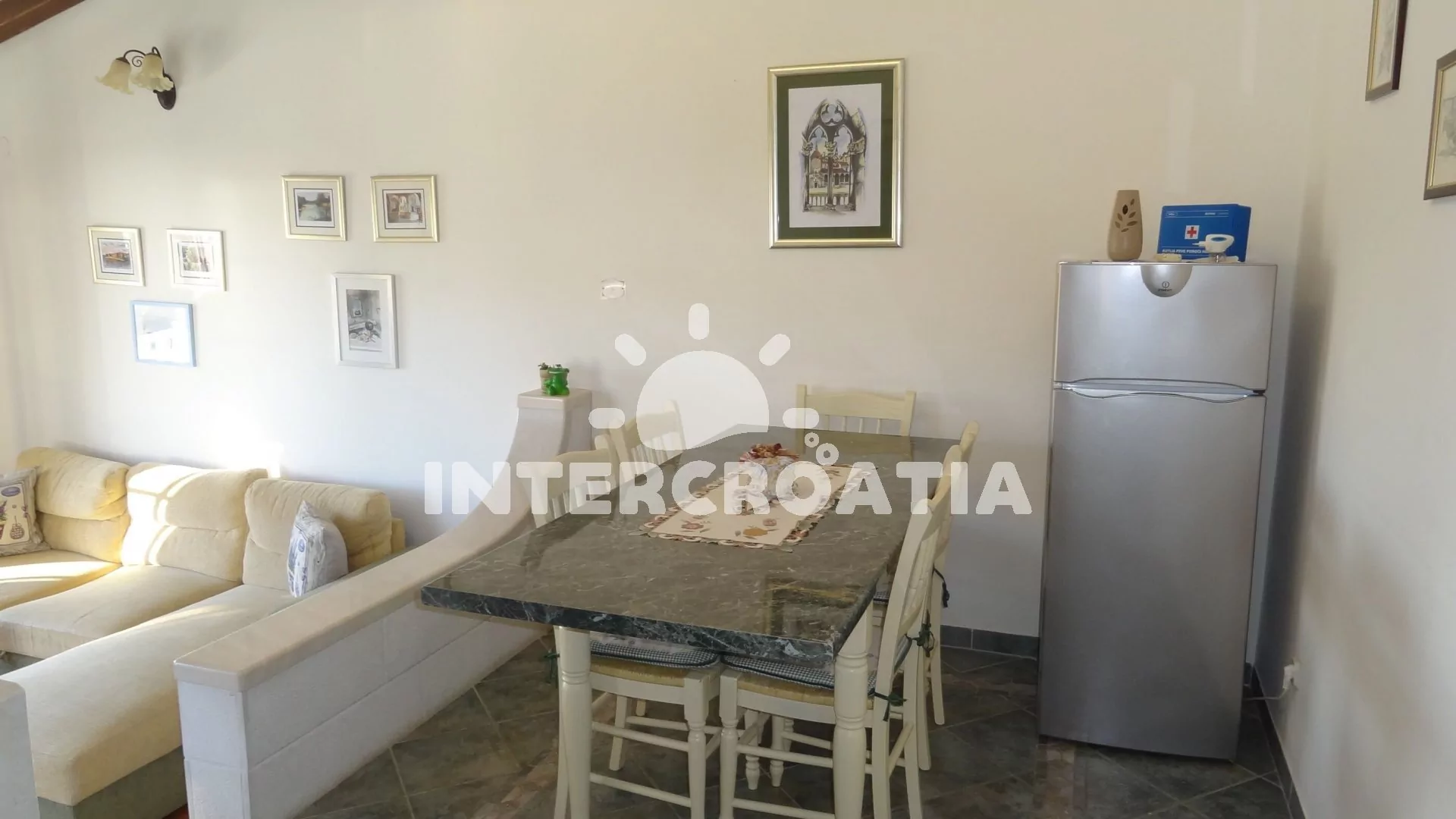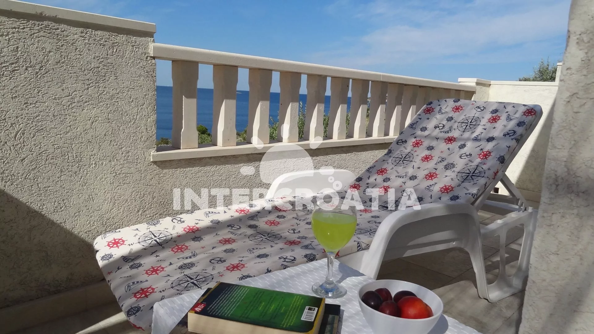 Apartmán (47 m2) s terasou a výhledem na moře se nachází v 1. patře vily. Apartmán má 2 ložnice a je vhodný pro 4 až 5 osob. Obývací pokoj je spojený s kuchyní. Kuchyňská linka je vybavena sporákem s troubou, myčkou na nádobí, mikrovlnnou troubou, kávovarem, rychlovarnou konvicí, nádobím a lednicí s mrazákem. Obývací pokoj s jídelním stolem pro 5 osob, rohovou pohovkou (rozložitelná na extra lůžko pro 1 osobu), televizí se satelitním programem, klimatizací a vstupem na terasu. První ložnice s dvoulůžkem. Druhá ložnice s dvěma jednolůžky. Koupelna se sprchovým koutem, umyvadlem, fénem a wc. Hostům je k dispozici parkování u objektu zdarma.