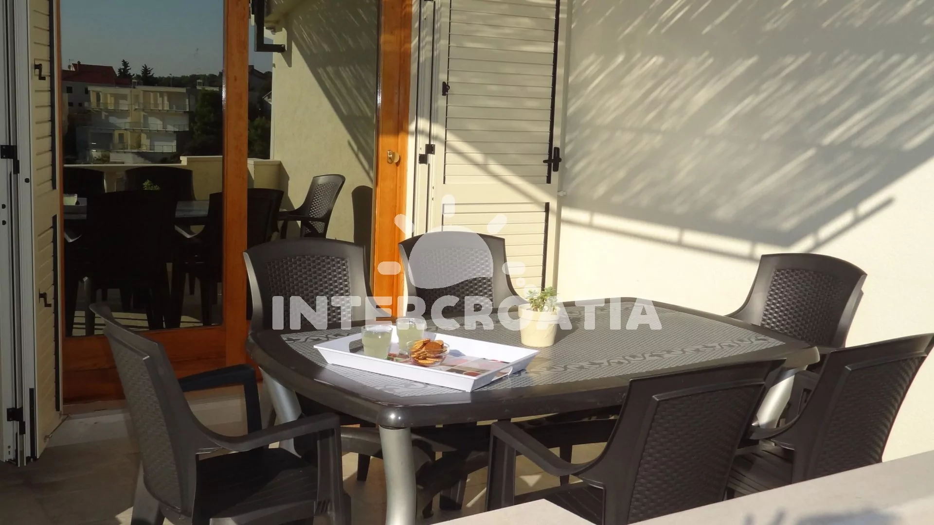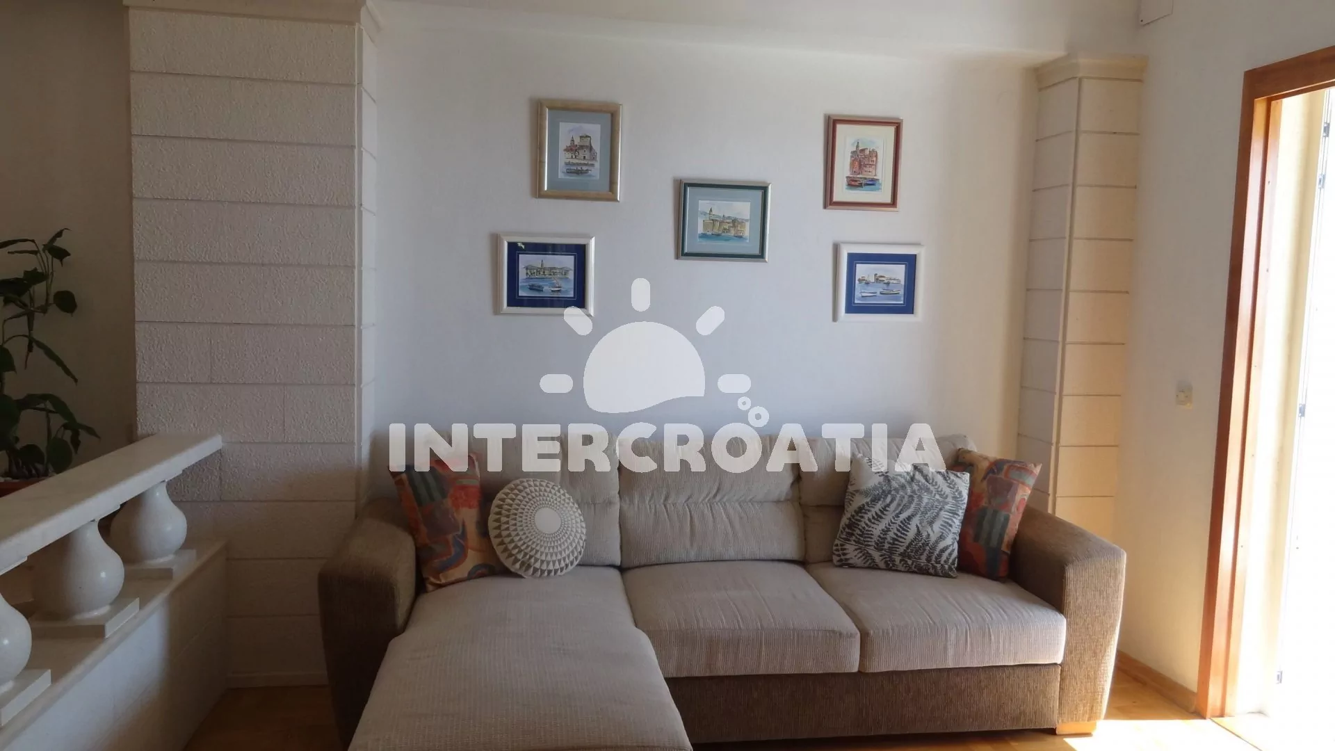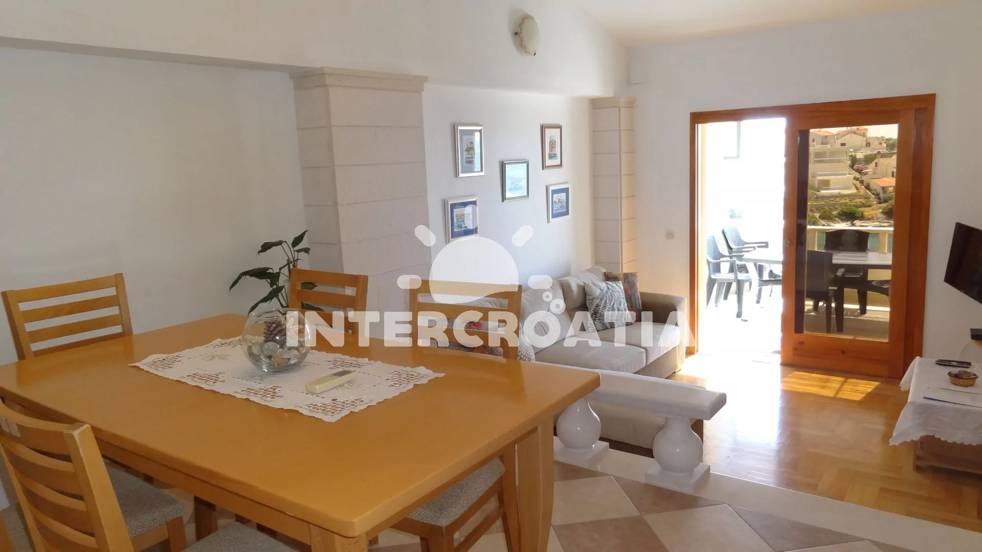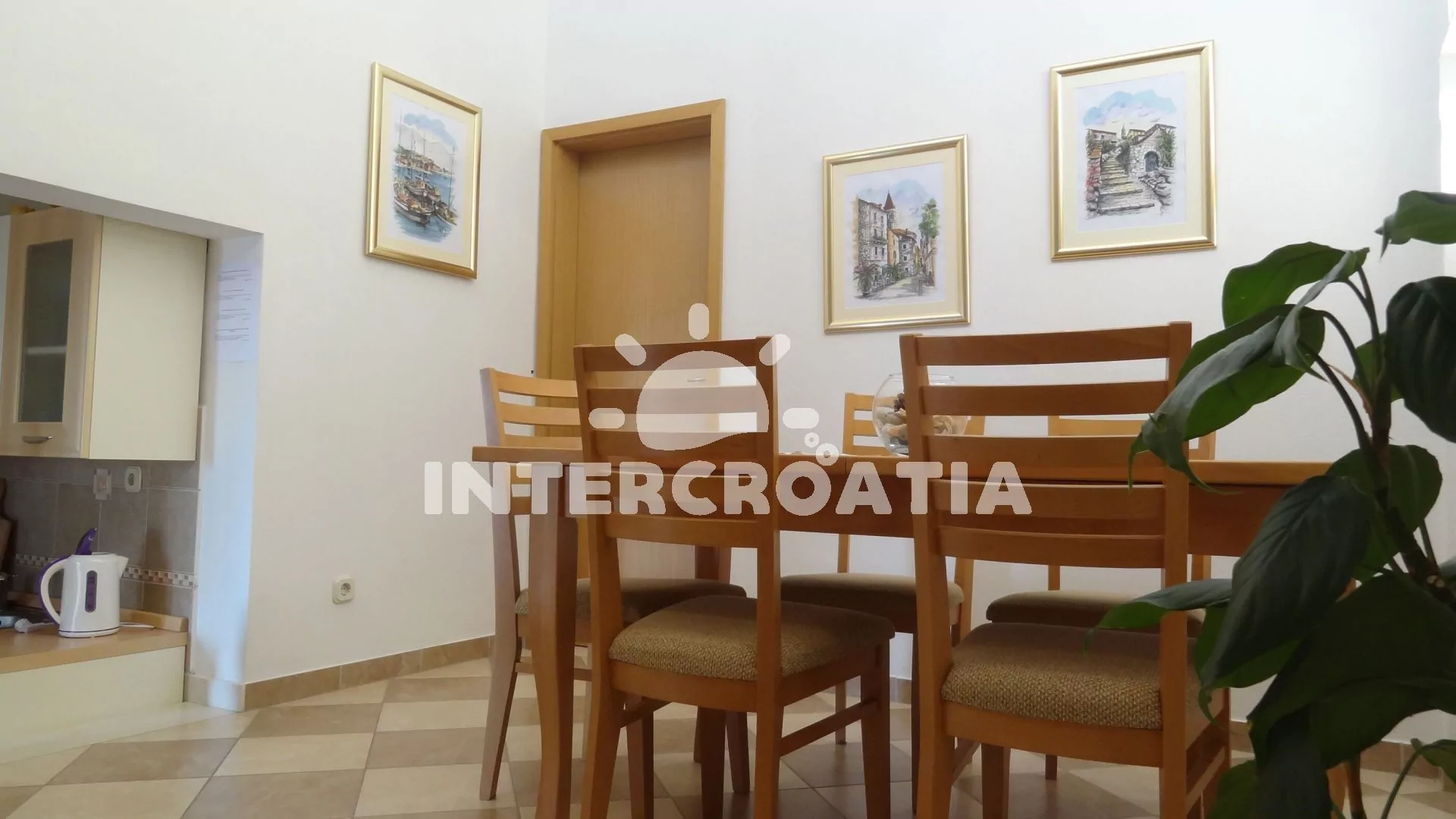 Apartmán (47 m2) s terasou a výhledem na moře se nachází v 1. patře vily. Apartmán má 2 ložnice a je vhodný pro 4 až 5 osob. Obývací pokoj je spojený s kuchyní. Kuchyňská linka je vybavena sporákem s troubou, myčkou na nádobí, mikrovlnnou troubou, kávovarem, rychlovarnou konvicí, nádobím a lednicí s mrazákem. Obývací pokoj s jídelním stolem pro 5 osob, rohovou pohovkou (rozložitelná na extra lůžko pro 1 osobu), televizí se satelitním programem, klimatizací a vstupem na terasu. První ložnice s dvoulůžkem. Druhá ložnice s dvěma jednolůžky. Koupelna se sprchovým koutem, umyvadlem, fénem a wc. Hostům je k dispozici parkování u objektu zdarma.