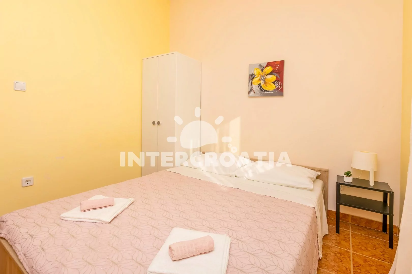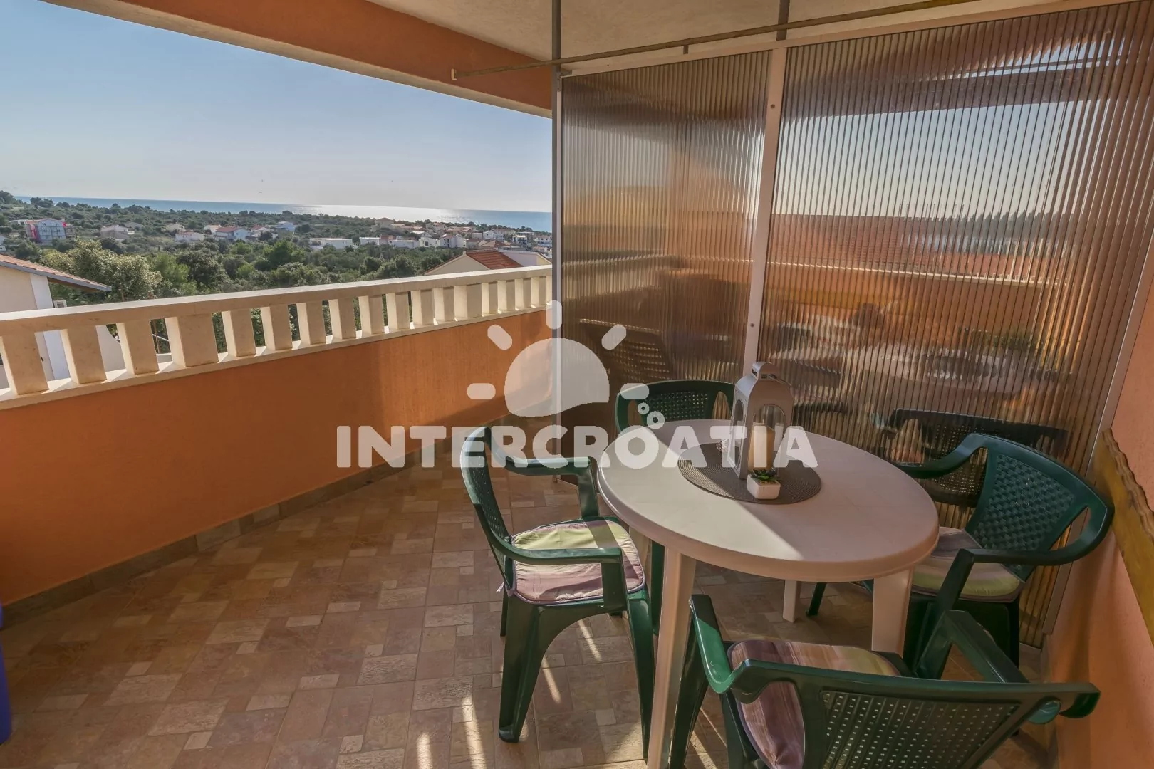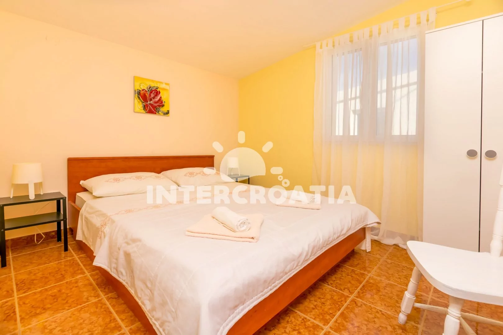 Apartmán (40 m2) se sdílenou terasou (oddělená paravánem), venkovním posezením a výhledem na moře se nachází ve 2. patře domu. Apartmán má 2 ložnice a je vhodný pro až 4 osoby. Obývací pokoj je spojený s kuchyní. Kuchyňská linka je vybavena sporákem s troubou, digestoří, rychlovarnou konvicí, nádobím a lednicí s mrazákem. Obývací pokoj s jídelním stolem, pohovkou, televizí se satelitním programem, klimatizací a vstupem na terasu. První i druhá ložnice je vybavena vždy s jedním dvoulůžkem. Koupelna se sprchovým koutem, umyvadlem, fénem a wc. Hostům je k dispozici parkování u objekt zdarma.