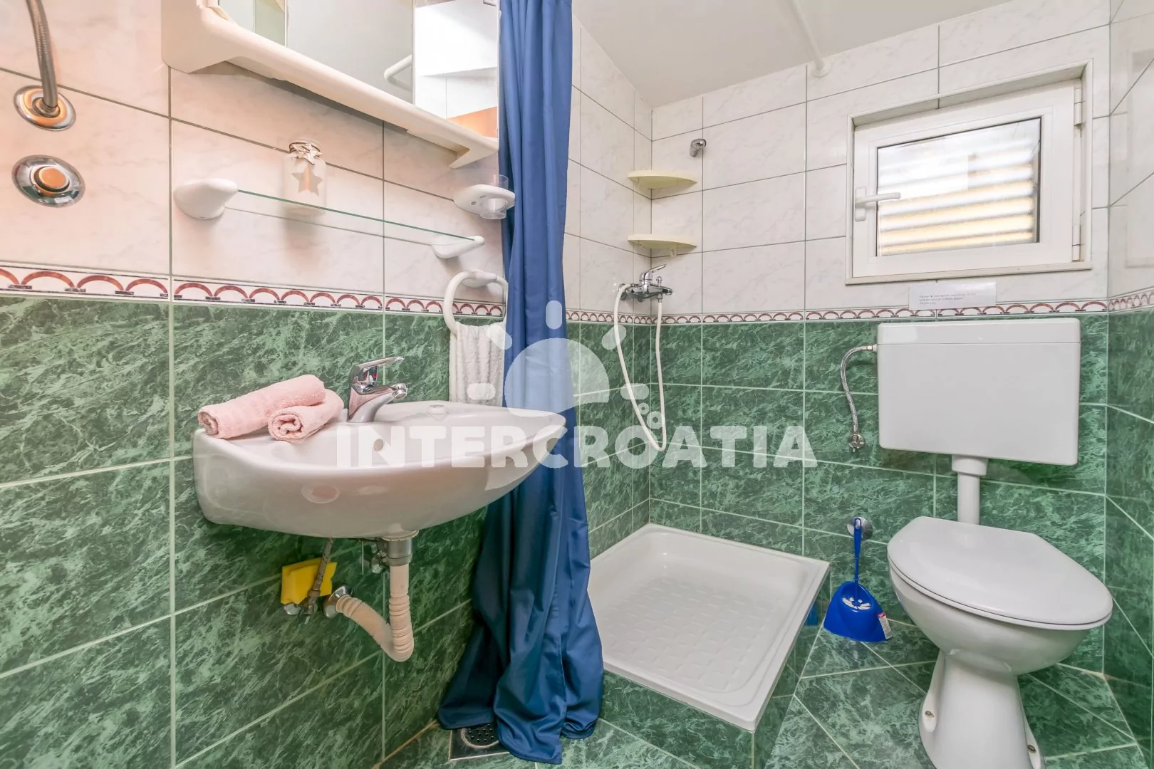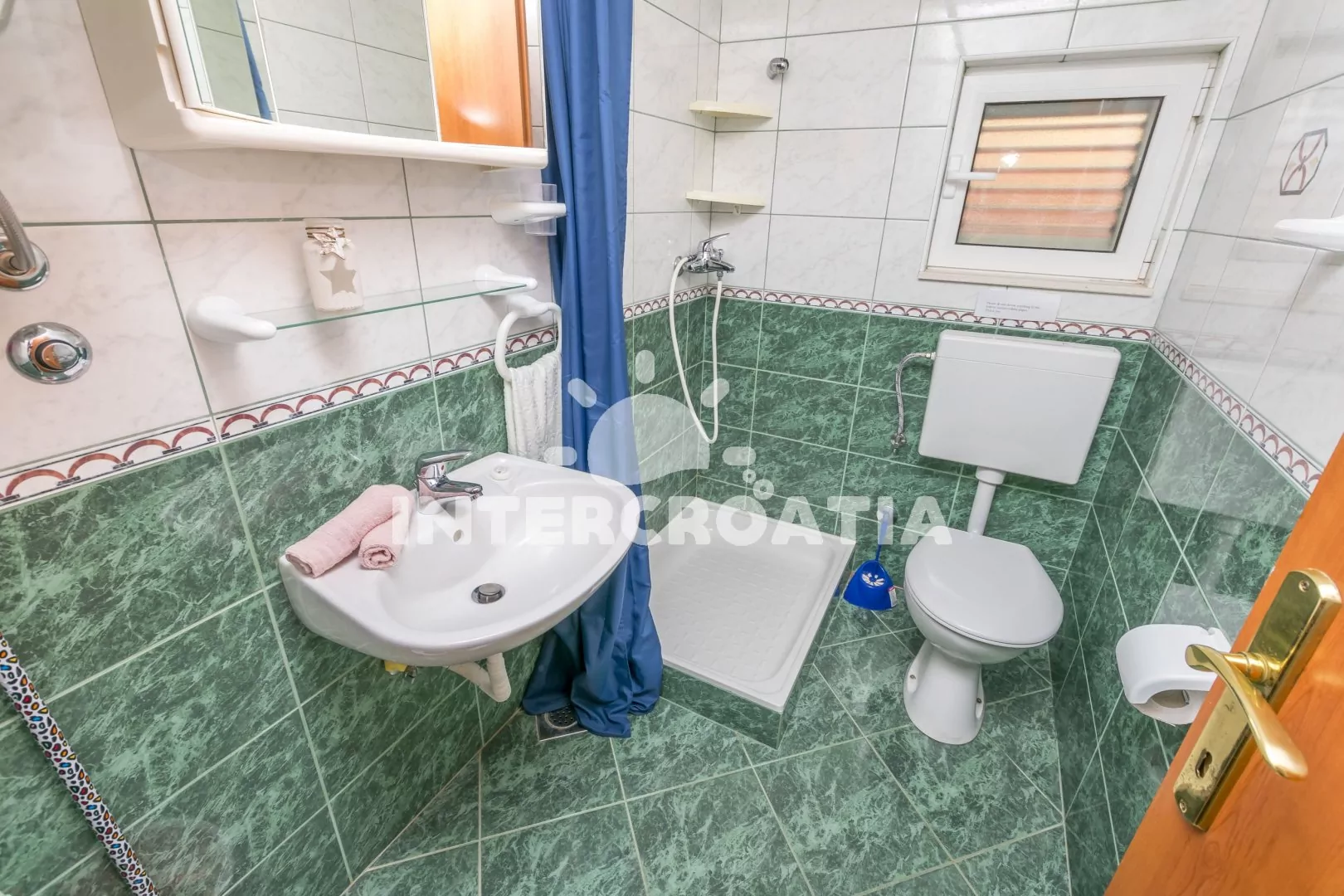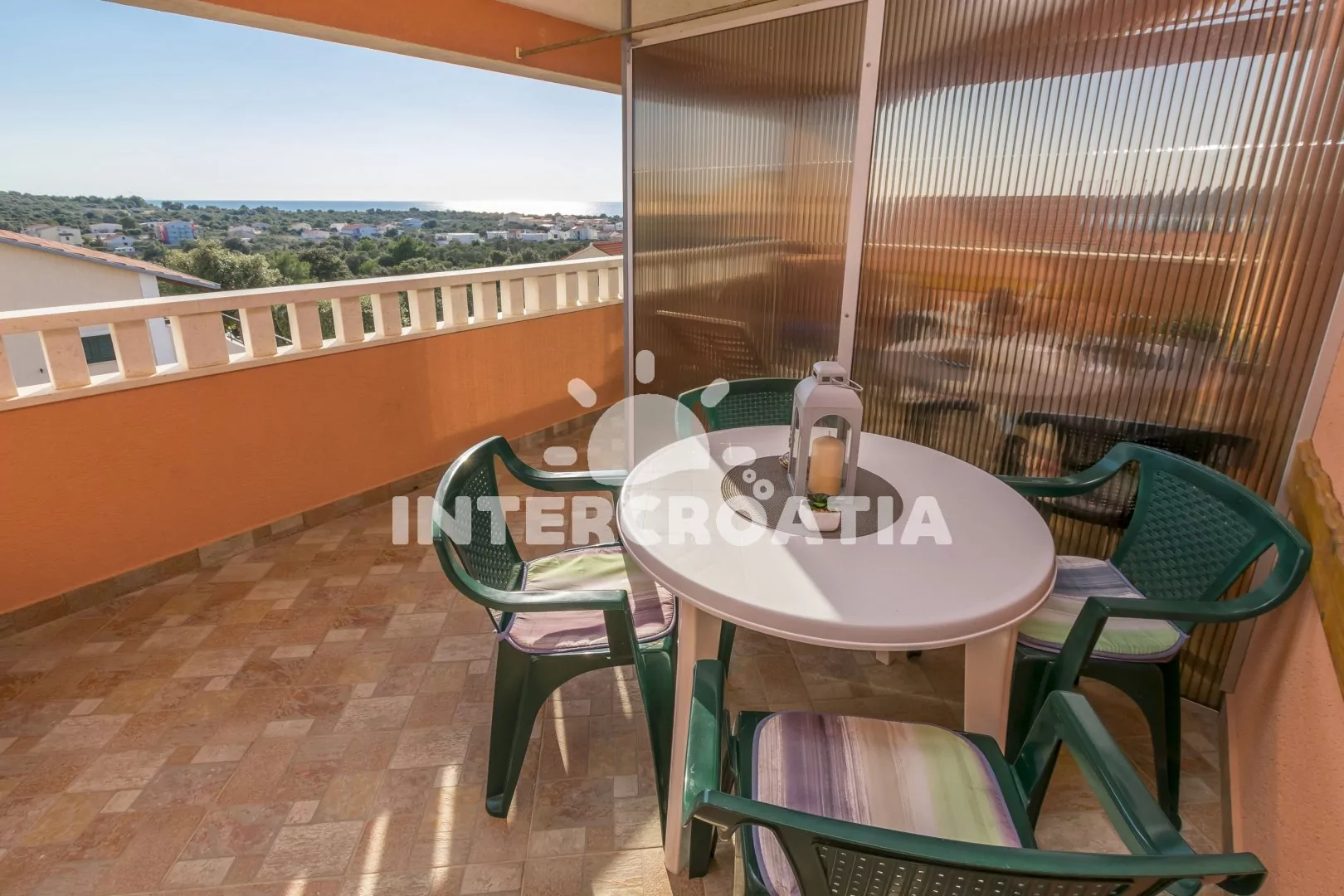 Apartmán (40 m2) se sdílenou terasou (oddělená paravánem), venkovním posezením a výhledem na moře se nachází ve 2. patře domu. Apartmán má 2 ložnice a je vhodný pro až 4 osoby. Obývací pokoj je spojený s kuchyní. Kuchyňská linka je vybavena sporákem s troubou, digestoří, rychlovarnou konvicí, nádobím a lednicí s mrazákem. Obývací pokoj s jídelním stolem, pohovkou, televizí se satelitním programem, klimatizací a vstupem na terasu. První i druhá ložnice je vybavena vždy s jedním dvoulůžkem. Koupelna se sprchovým koutem, umyvadlem, fénem a wc. Hostům je k dispozici parkování u objekt zdarma.