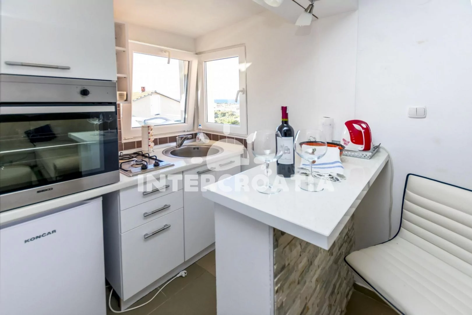 Apartmán (34 m2) s terasou, posezením a výhledem na moře se nachází v 1. patře domu. Apartmán má 1 ložnici a je vhodný pro 2 až 4 osoby. Obývací pokoj je spojený s kuchyní. Kuchyňská linka je vybavena dvouplotýnkovým vařičem, troubou, rychlovarnou konvicí, nádobím a lednicí s mrazákem. Obývací pokoj s jídelním stolem, pohovkou (rozložitelná na extra lůžko pro 2 osoby), televizí, klimatizací a vstupem na terasu. Ložnice s jedním dvoulůžkem. Koupelna se sprchovým koutem, umyvadlem, fénem a wc. Hostům je k dispozici parkování u objektu zdarma.