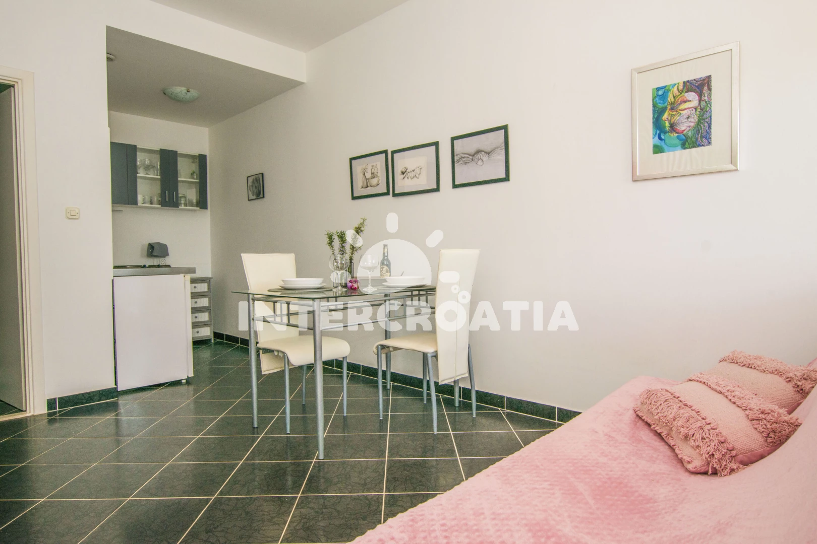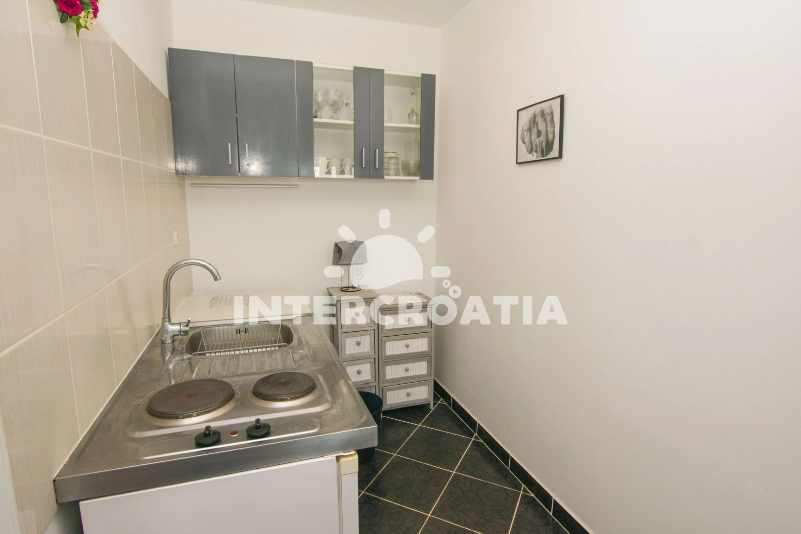 Vzdálenosti: Moře 20 m, pláž 20 m (oblázky), supermarket 300 m, veřejná doprava 500 m, lékárna 500 m, ambulance 500 m, centrum 700 m, restaurace 700 m, letiště (Zadar) 20 km,