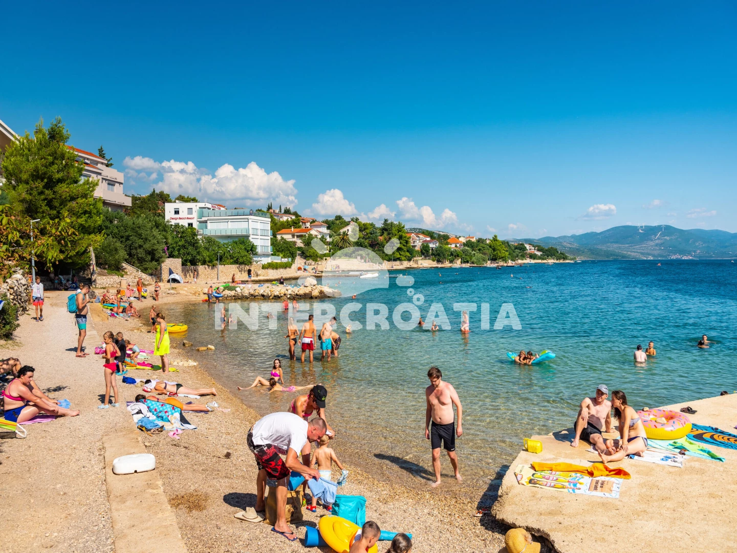 Apartmán se nachází 250 m od moře a pláže. Pláž je oblázková a betonové desky. Apartmán disponuje bazénem s lehátky pro ubytované hosty. U objektu je k dispozici společná zahrada s posezením a grilem. Parkování je před domem.