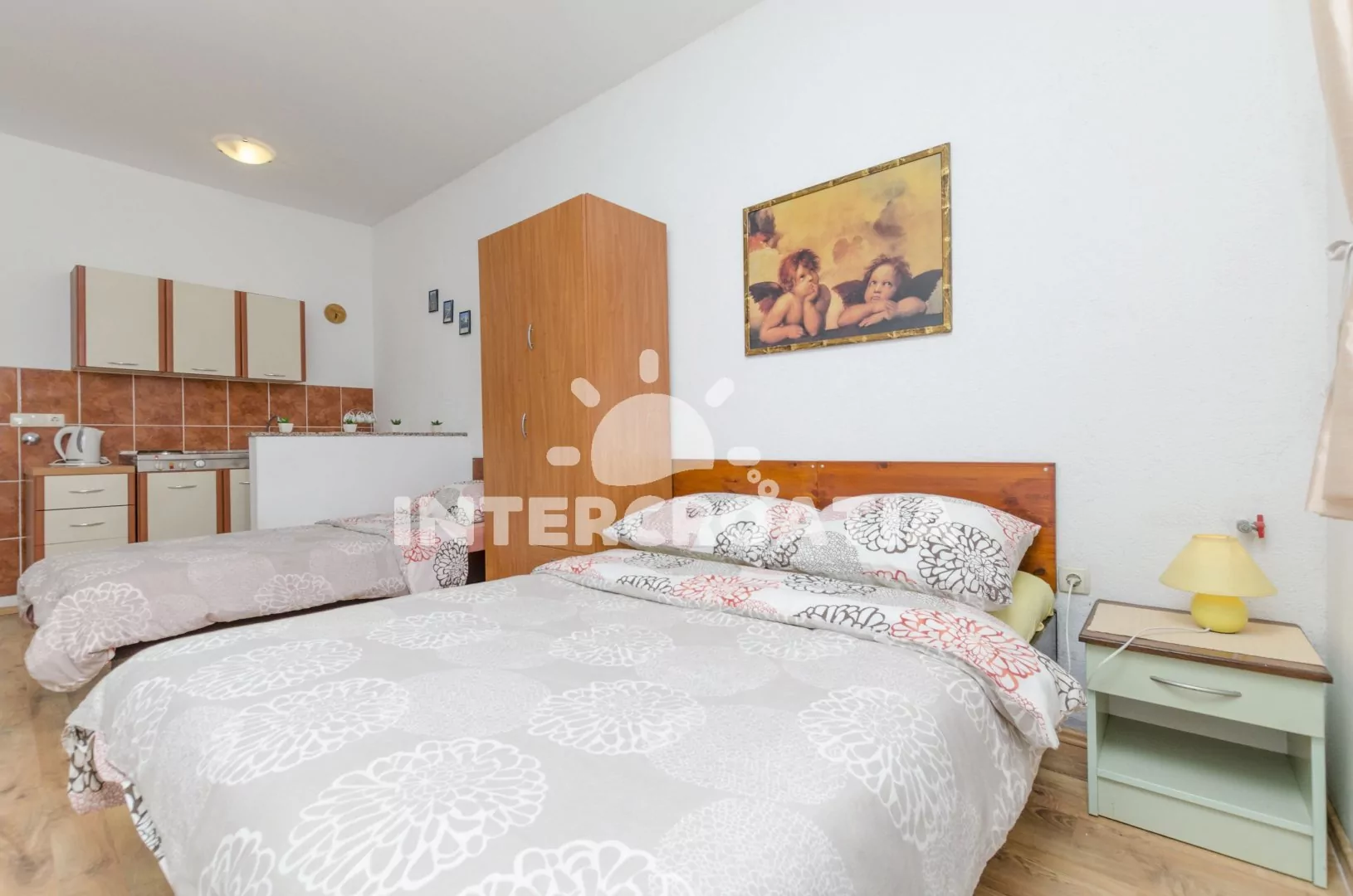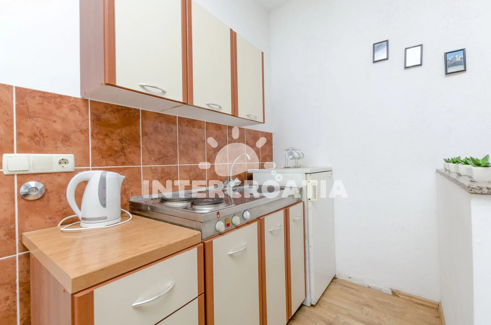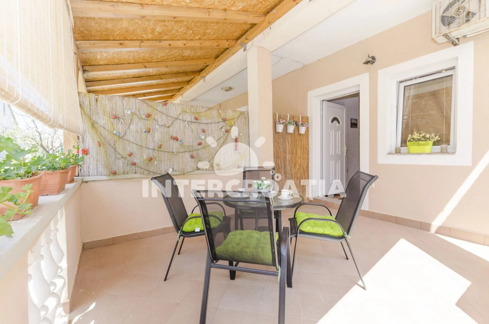 Apartmán s vlastní pergolou a posezením se nachází v přízemí domu a je vhodný pro 3 osoby. Obývací místnost je spojena s kuchyní. Kuchyňská linka je vybavena dvouplotýnkovým sporákem, nádobím a lednicí s mrazákem. Obývací místnost s jídelním stolem pro 3 osoby, televizí se satelitním programem, dvoulůžkem, jedním jednolůžkem, klimatizací a vstupem na terasu. Koupelna se sprchovým koutem, umyvadlem a wc. Hostům je k dispozici parkování u objektu zdarma.