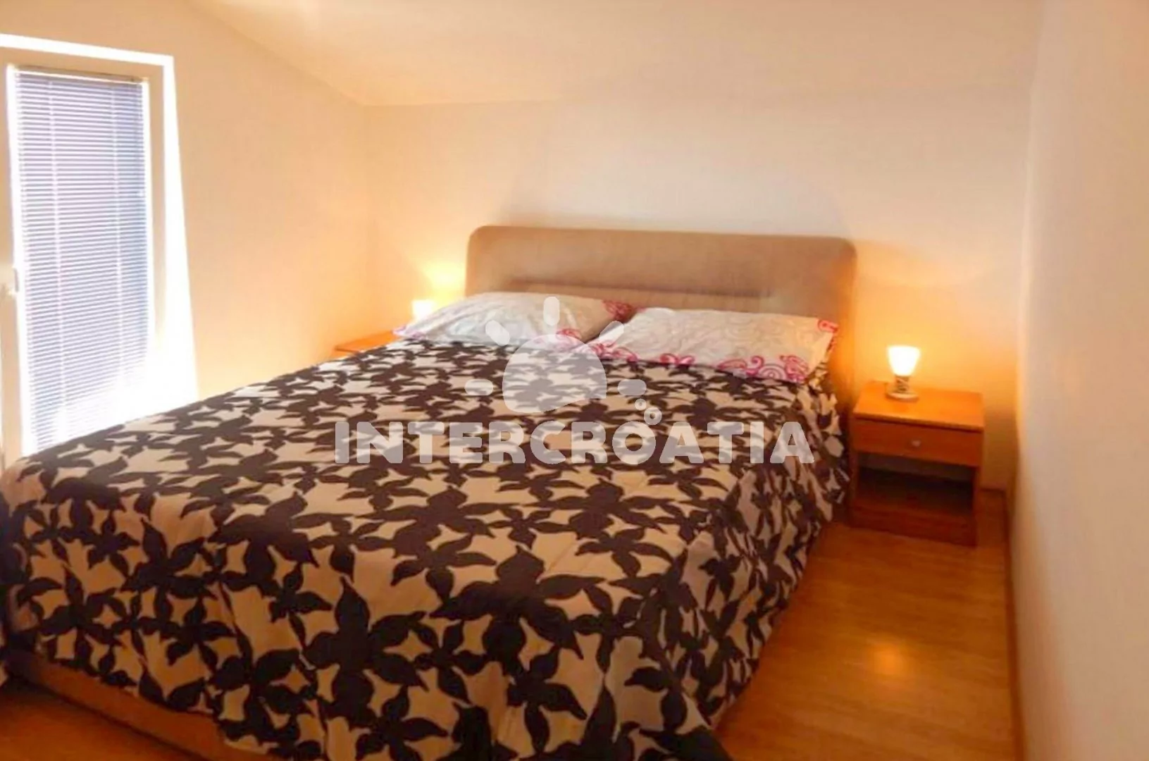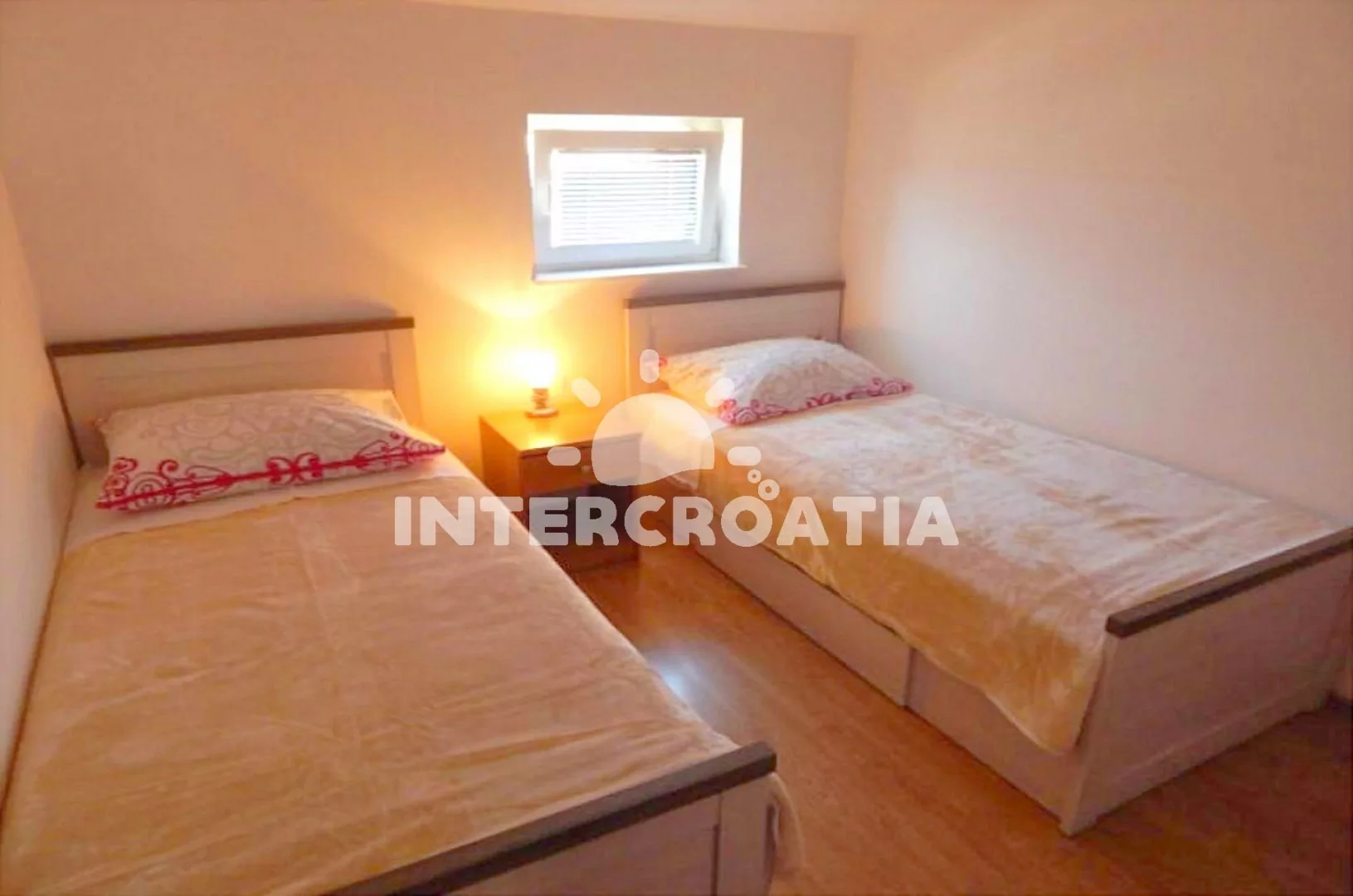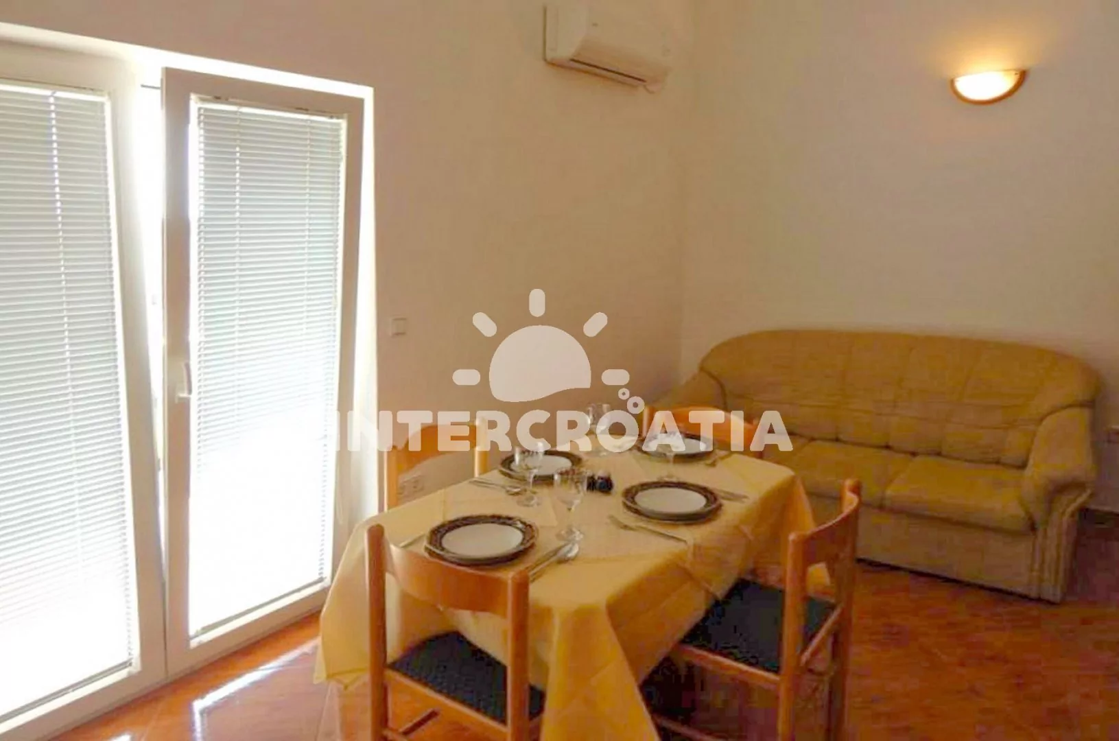 Apartmán (42 m2) s terasou a venkovním posezením se nachází v 1. patře domu. Apartmán má 2 ložnice a je vhodný pro 4 osoby. Obývací pokoj je spojený s kuchyní. Kuchyňská linka je vybavena varnou deskou, nádobím a lednicí s mrazákem. Obývací pokoj s jídelním stolem pro 4 osoby, pohovkou, televizí se satelitním programem, klimatizací a vstupem na terasu. První ložnice s dvoulůžkem a vstupem na terasu. Druhá ložnice s dvěma jednolůžky. Koupelna se sprchovým koutem, umyvadlem a wc. Hostům je k dispozici parkování u objektu zdarma.
