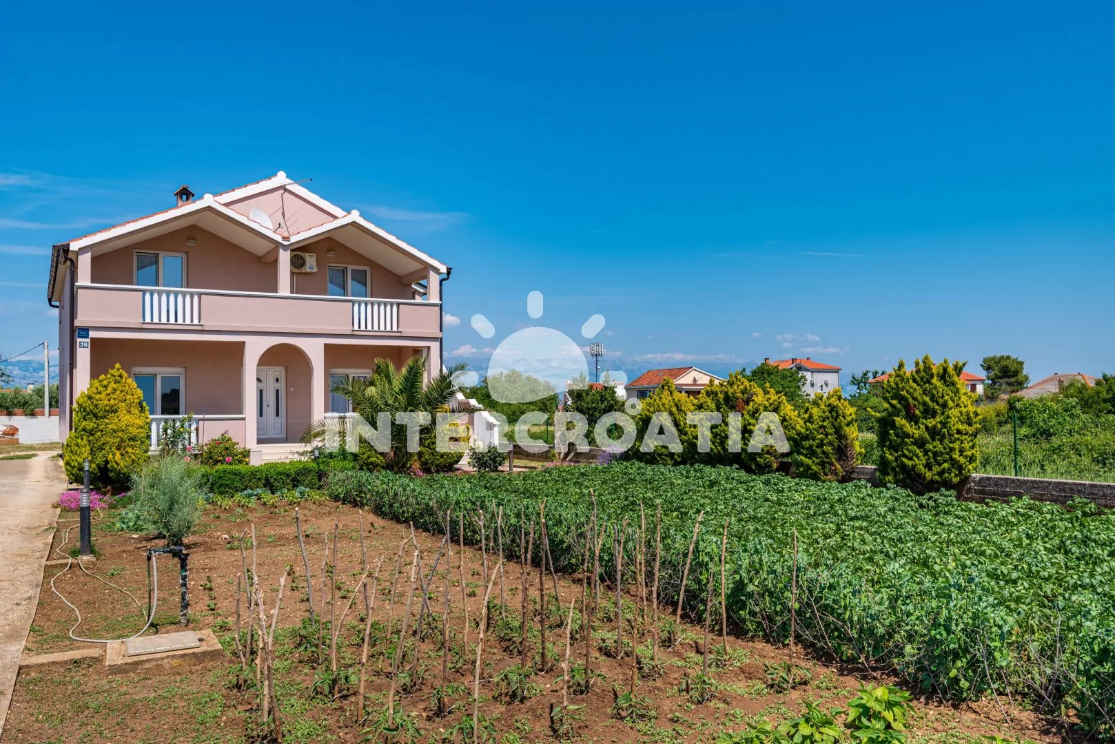Samostatně stojící apartmánový dům 250 m od moře, 700 m pěší chůzí od menší písečné pláže a 1 km od velké písečné pláže. Dům nabízí ubytování ve 2 klimatizovaných apartmánech s lodžiemi a venkovním posezením. U domu zahrada s bazénem, solární sprchou, lehátky, zelení a grilem. Parkovací místa u objektu.