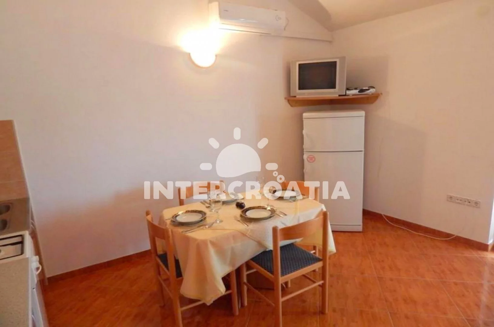 Apartmán (33 m2) s terasou a venkovním posezením se nachází v 1. patře domu. Apartmán je vhodný pro 2 až 4 osoby. Obývací pokoj je spojený s kuchyní. Kuchyňská linka je vybavena varnou deskou, nádobím a lednicí s mrazákem. Obývací pokoj s jídelním stolem pro 4 osoby, pohovkou (rozložitelná na extra lůžko pro 2 osoby), televizí se satelitním programem, klimatizací a vstupem na terasu. Ložnice s jedním dvoulůžkem. Koupelna se sprchovým koutem, umyvadlem a wc. Hostům je k dispozici parkování u objektu zdarma.