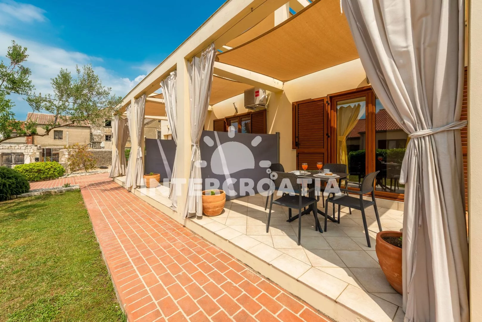 Velmi dobře umístěný a samostatně stojící apartmánový dům kousek od břehu moře. Dům nabízí ubytování ve 4 moderně zařízených a klimatizovaných apartmánech s lodžiemi. Na zahradě k dispozici společná terasa s pergolou, posezením a zděným grilem. Parkovací místa pro automobily u domu.