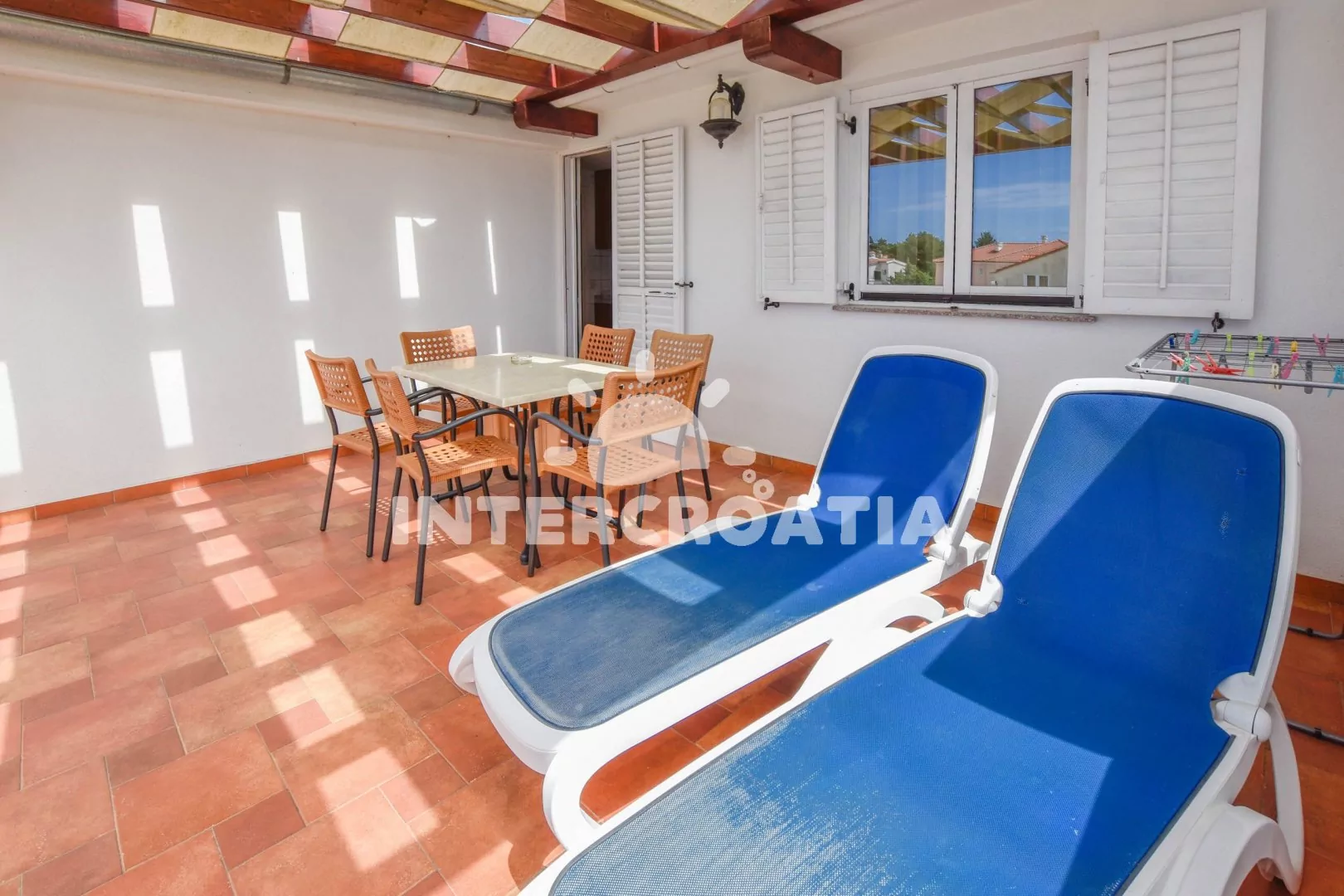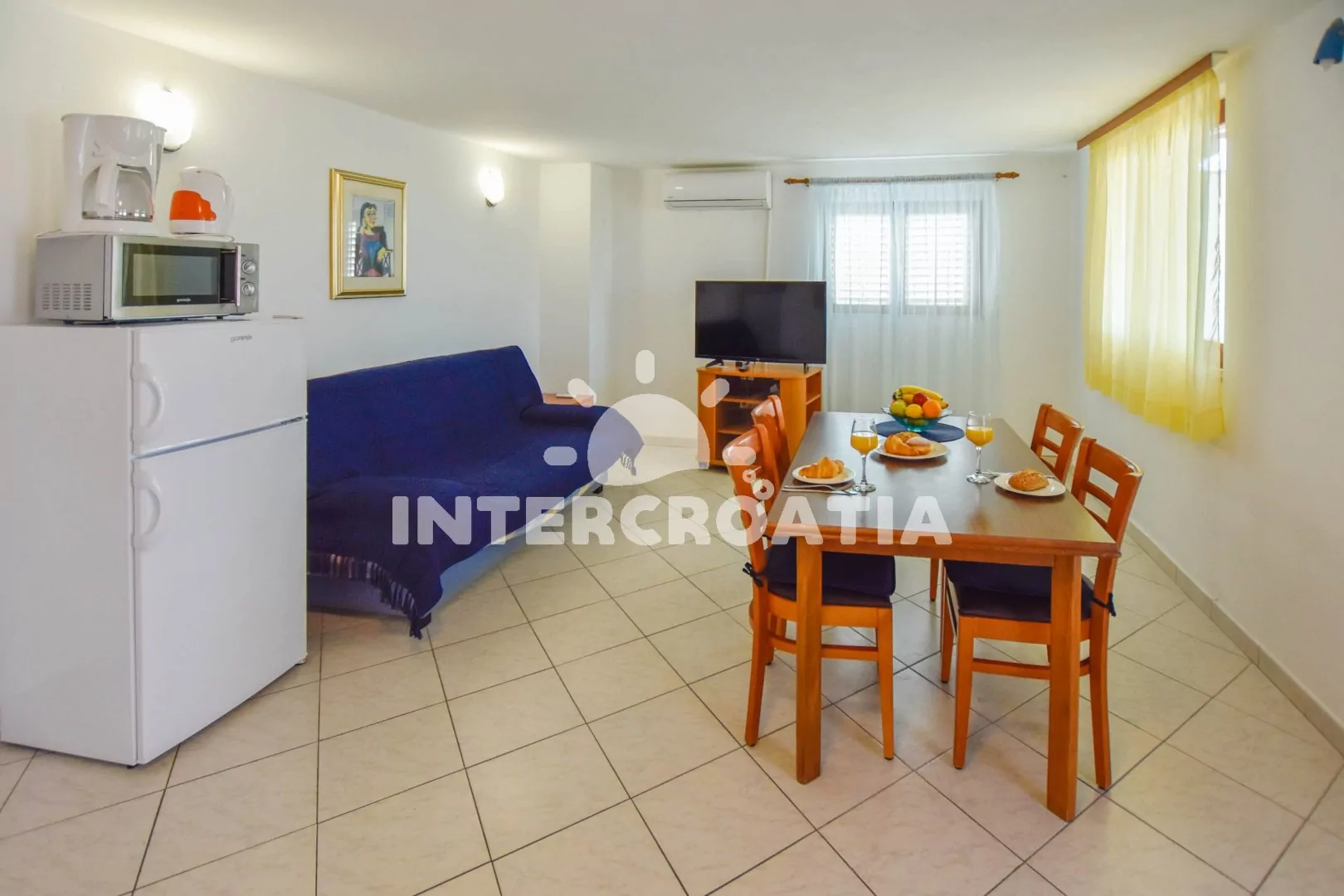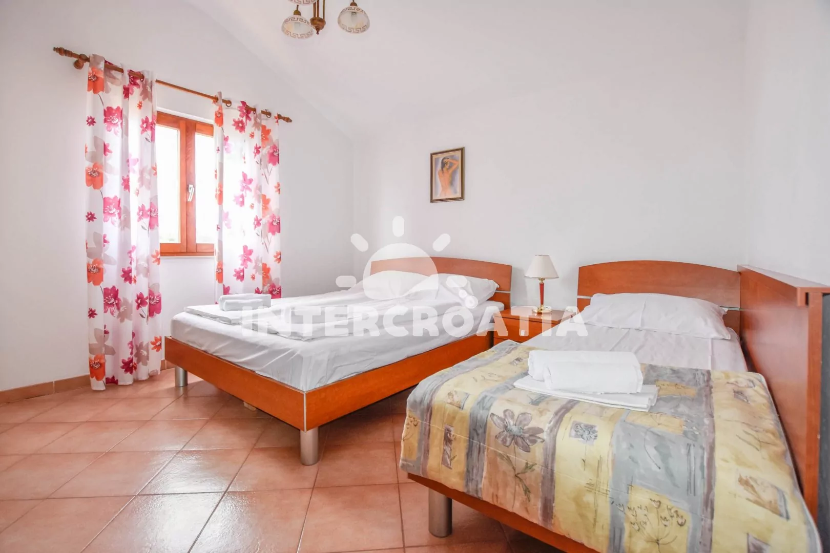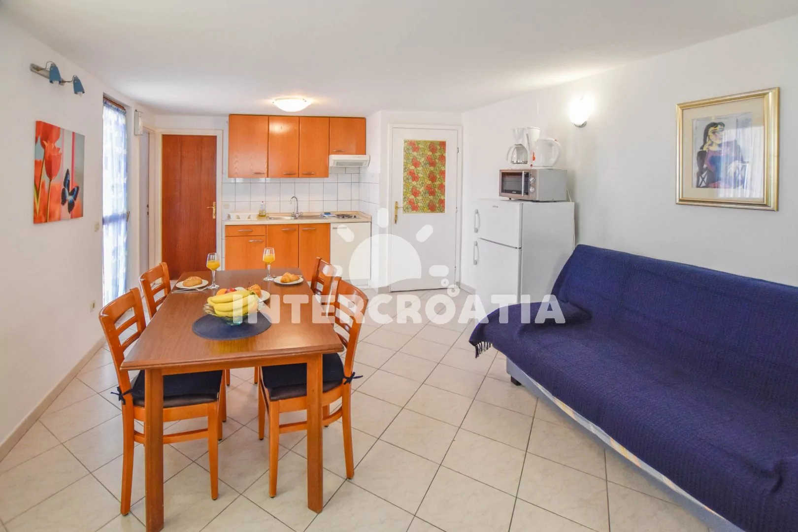 Apartmán (65 m2) s vlastní terasou, výhledem na moře a do klidné ulice se nachází ve 2. patře vily. Apartmán je vhodný pro 3 až 5 osob. Obývací pokoj je spojený s kuchyní. Kuchyňská linka je vybavena dvouplotýnkovým vařičem, digestoří, rychlovarnou konvicí, mikrovlnnou troubou, nádobím a lednicí s mrazákem. Obývací pokoj s jídelním stolem pro 4 osoby, pohovkou (rozložitelná na extra lůžko pro 2 osoby), televizí, klimatizací a vstupem na terasu. Ložnice s dvoulůžkem a jednolůžkem. Koupelna s vanou, sprchovou zástěnou, umyvadlem a wc. Hostům je k dispozici parkování u objektu zdarma.