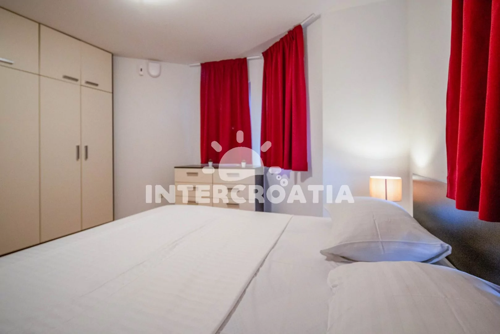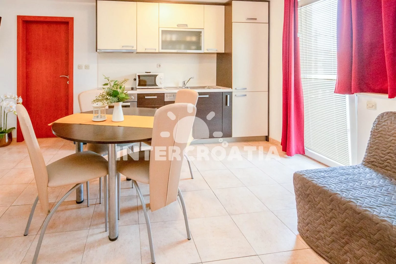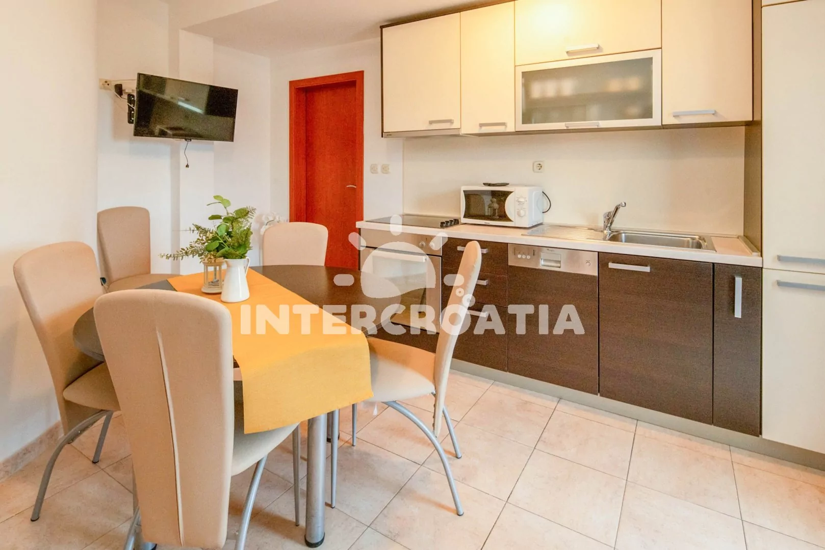 Apartmán (64 m2) s terasou, posezením a výhledem do klidné ulice se nachází v 1. patře domu. Apartmán má 2 ložnice a je vhodný pro 4 osoby. Obývací pokoj je spojený s kuchyní. Kuchyňská linka je vybavena sklokeramickou varnou deskou, digestoří, vestavěnou troubou, myčkou na nádobí, mikrovlnnou troubou, rychlovarnou konvicí, kávovarem, nádobím a lednicí s mrazákem. Obývací pokoj s jídelním stolem pro 4 osoby, pohovkou, televizí se satelitním programem, klimatizací a vstupem na terasu. První i druhá ložnice je vybavena vždy s jedním dvoulůžkem. Koupelna se sprchovým koutem, umyvadlem a wc. Hostům je k dispozici parkování u objektu zdarma.