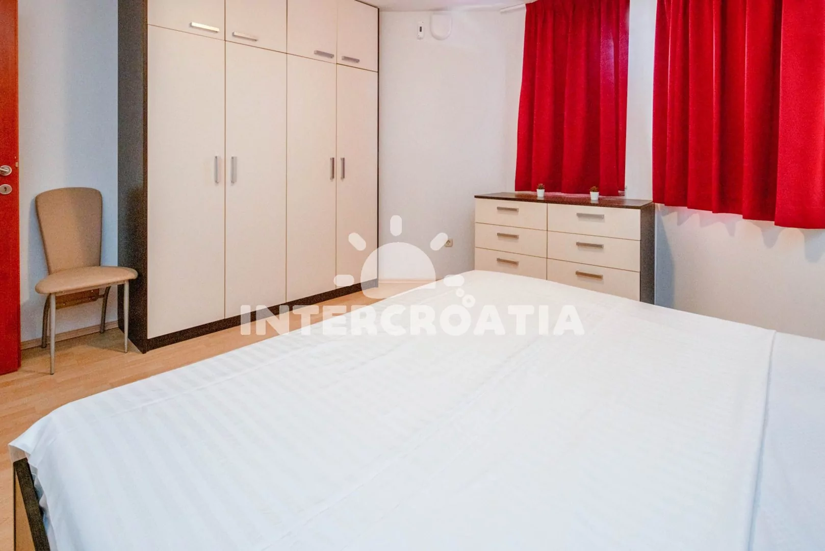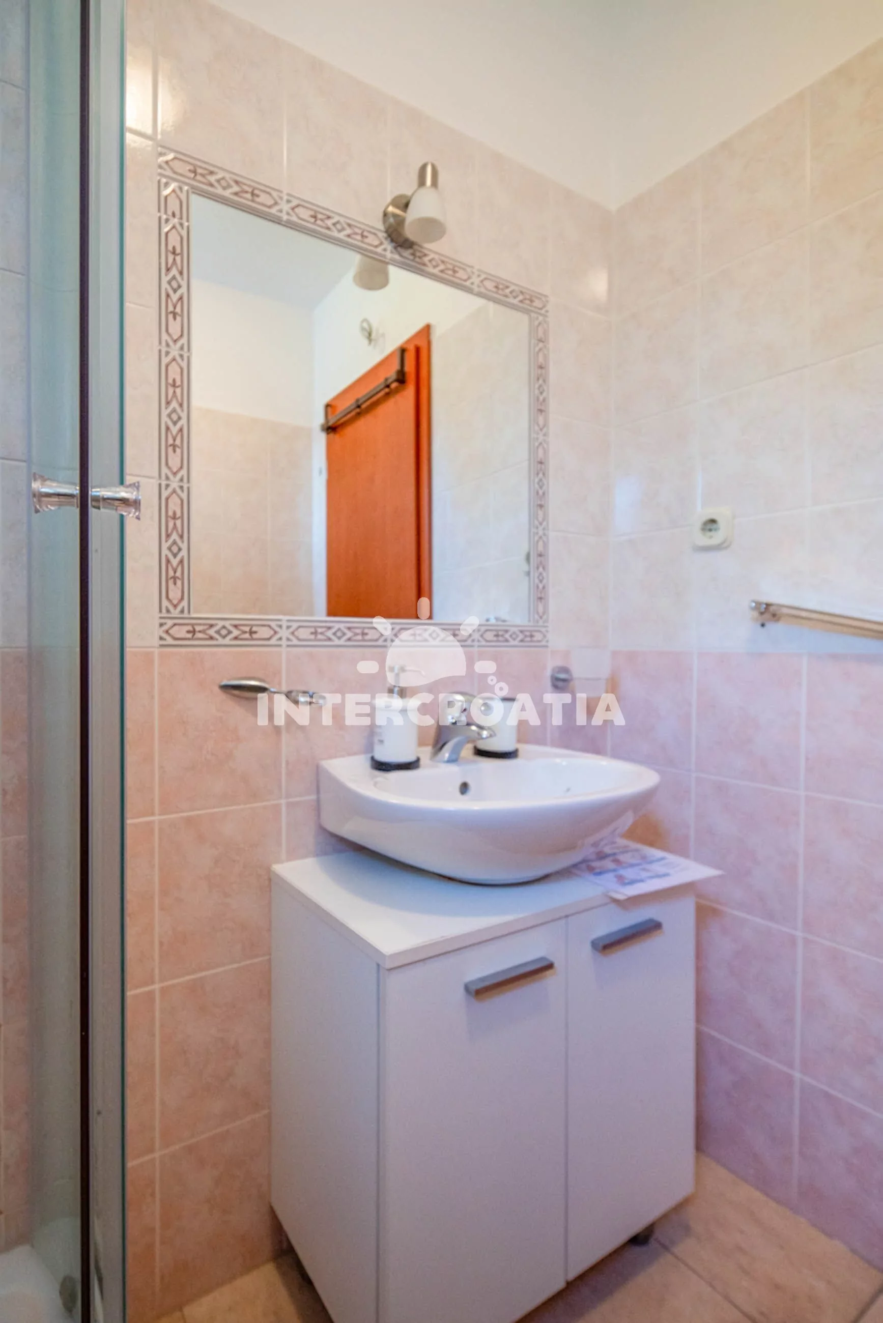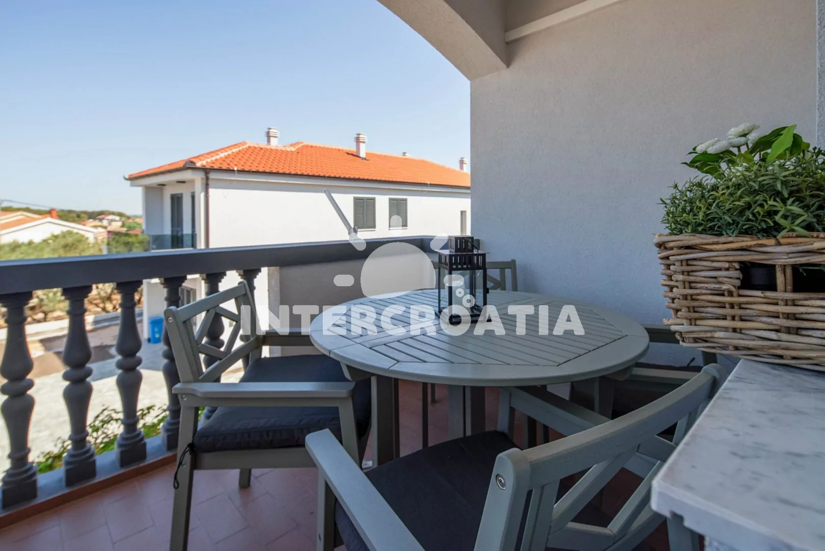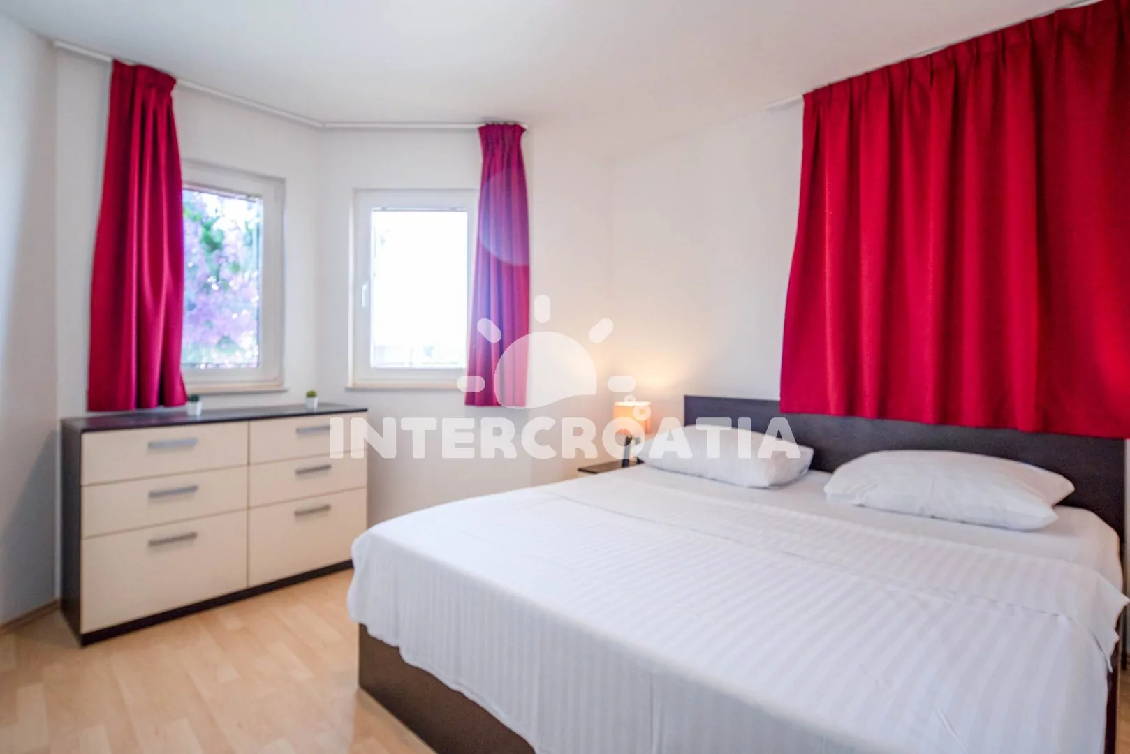 Apartmán (64 m2) s terasou, posezením a výhledem do klidné ulice se nachází v 1. patře domu. Apartmán má 2 ložnice a je vhodný pro 4 osoby. Obývací pokoj je spojený s kuchyní. Kuchyňská linka je vybavena sklokeramickou varnou deskou, digestoří, vestavěnou troubou, myčkou na nádobí, mikrovlnnou troubou, rychlovarnou konvicí, kávovarem, nádobím a lednicí s mrazákem. Obývací pokoj s jídelním stolem pro 4 osoby, pohovkou, televizí se satelitním programem, klimatizací a vstupem na terasu. První i druhá ložnice je vybavena vždy s jedním dvoulůžkem. Koupelna se sprchovým koutem, umyvadlem a wc. Hostům je k dispozici parkování u objektu zdarma.