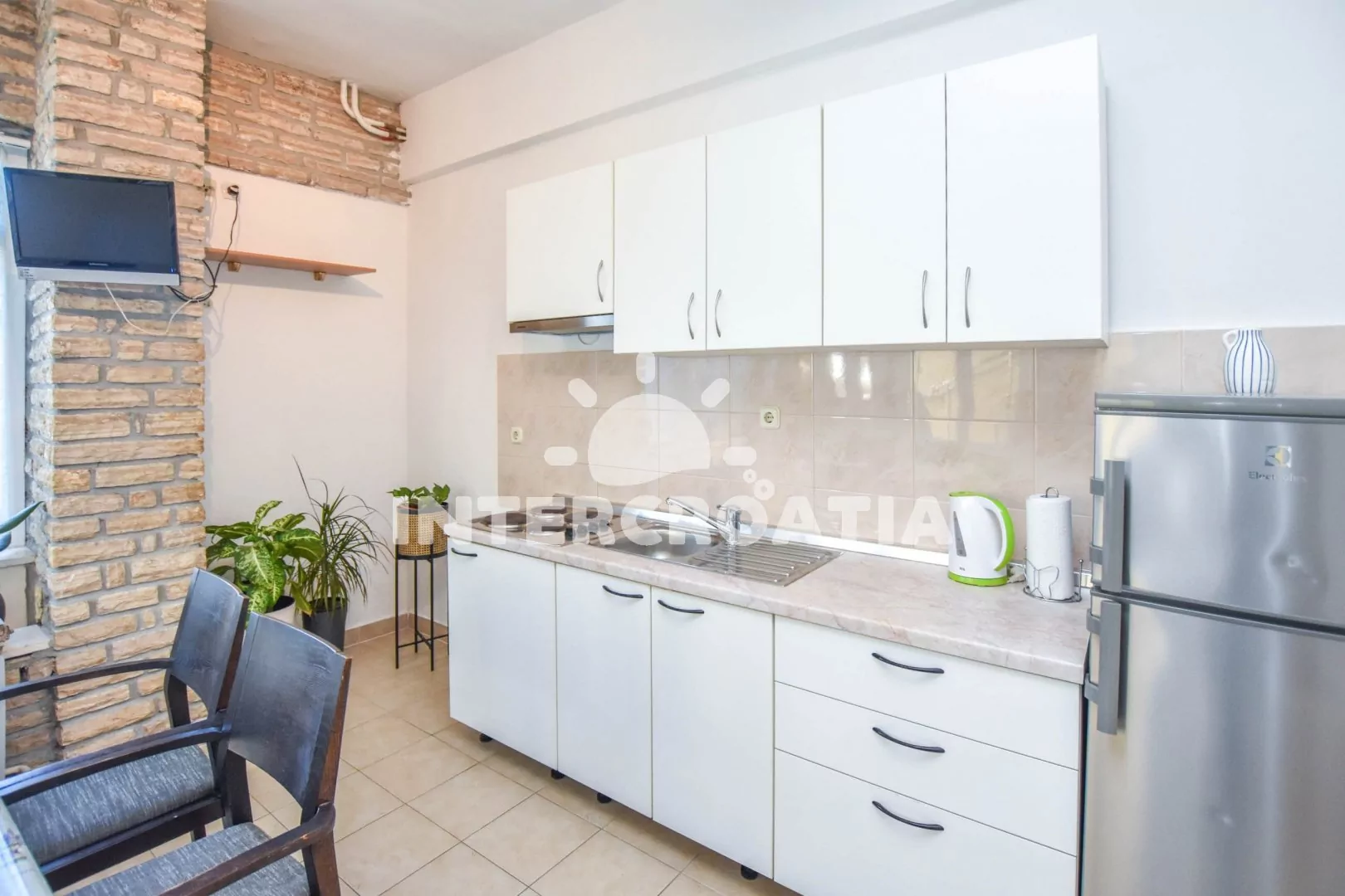 Apartmán (55 m2) s výhledem do dvora a zahrady se nachází v přízemí vily. Apartmán má 2 ložnice a je vhodný pro 4 až 6 osob. Obývací pokoj je spojený s kuchyní. Kuchyňská linka je vybavena varnou…