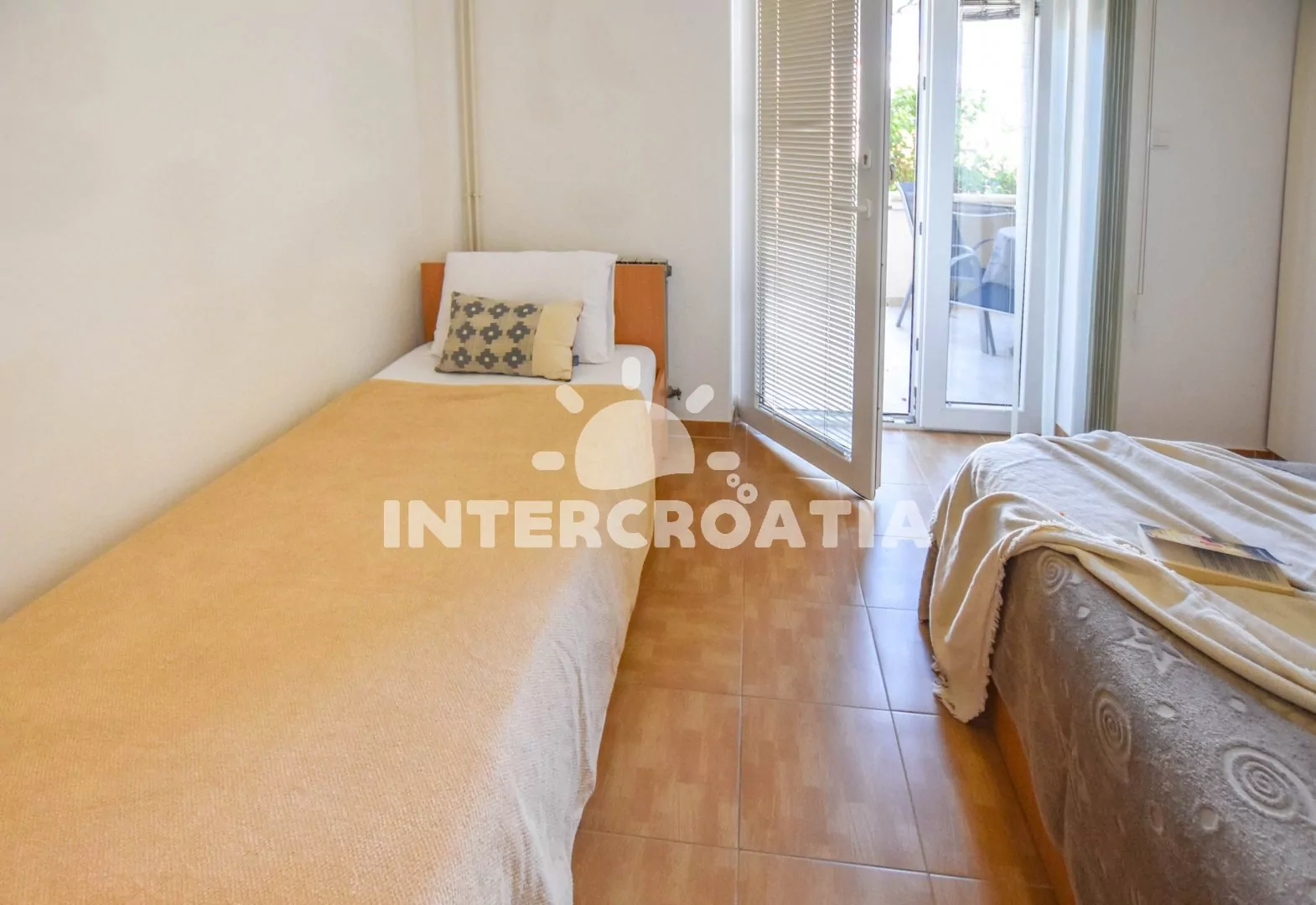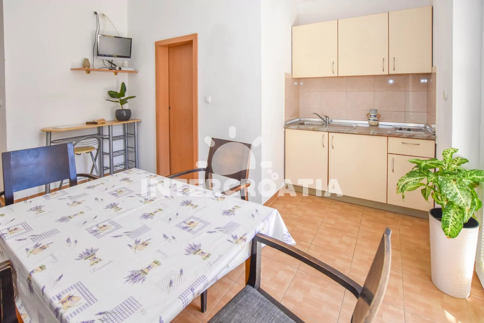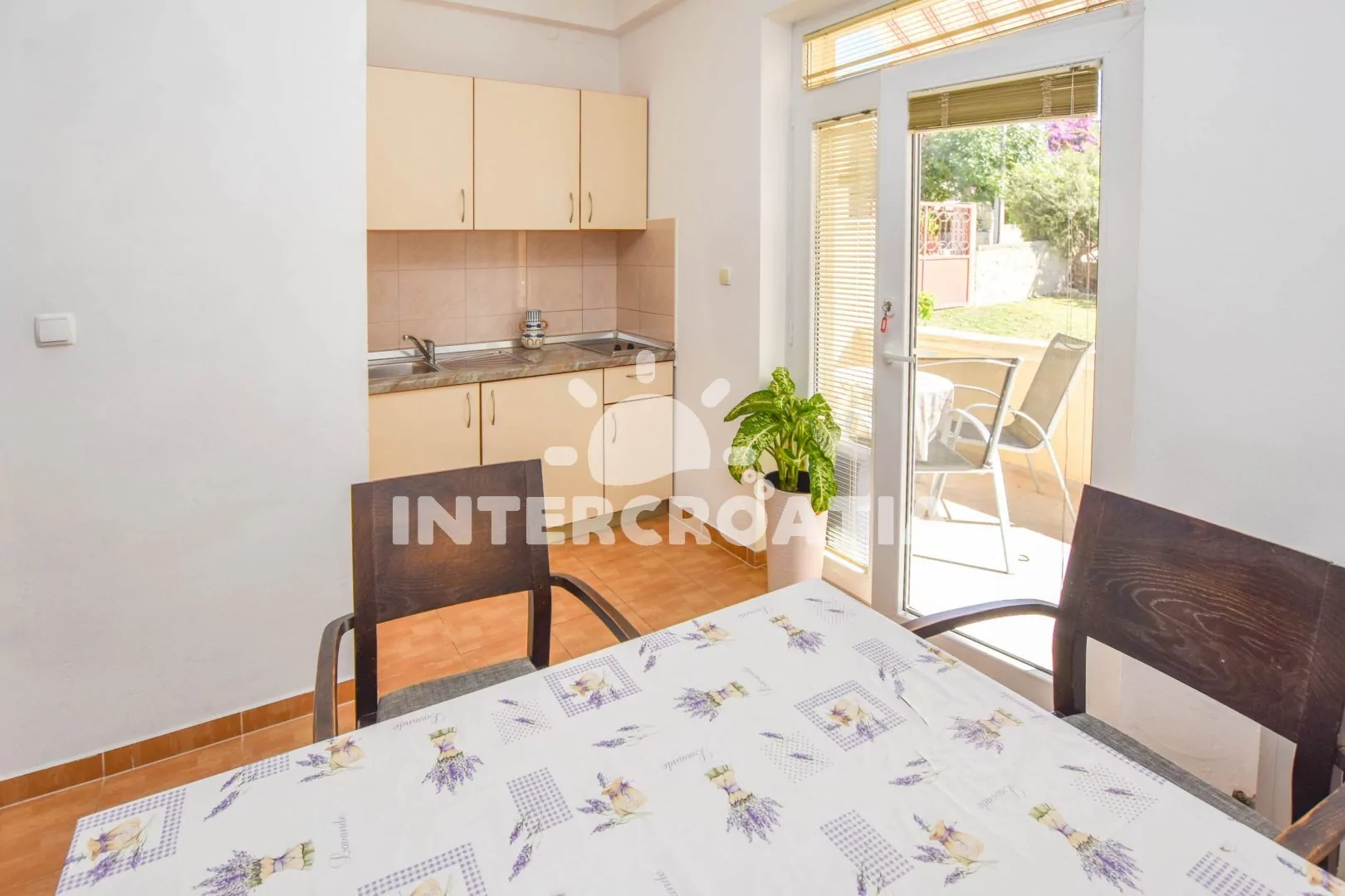Apartmán (45 m2) s terasou a venkovním posezením se nachází v přízemí vily. Apartmán má 2 ložnice a je vhodný pro až 5 osob. Obývací místnost je spojena s kuchyní. Kuchyňská linka je vybavena dvouplotýnkovým vařičem, nádobím a lednicí s mrazákem. Obývací místnost s jídelním stolem, televizí, klimatizací a vstupem na terasu. První ložnice s dvoulůžkem, jednolůžkem a vstupem na terasu. Druhá ložnice s dvěma jednolůžky. Koupelna se sprchovým koutem, umyvadlem a wc. Hostům je k dispozici parkování u objektu zdarma.