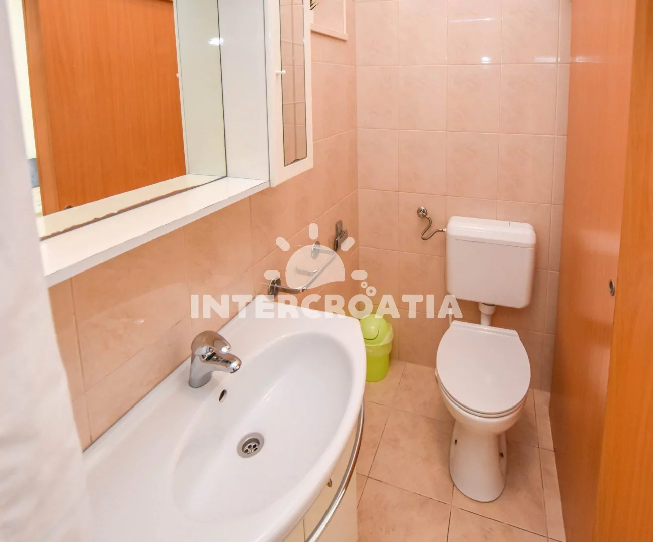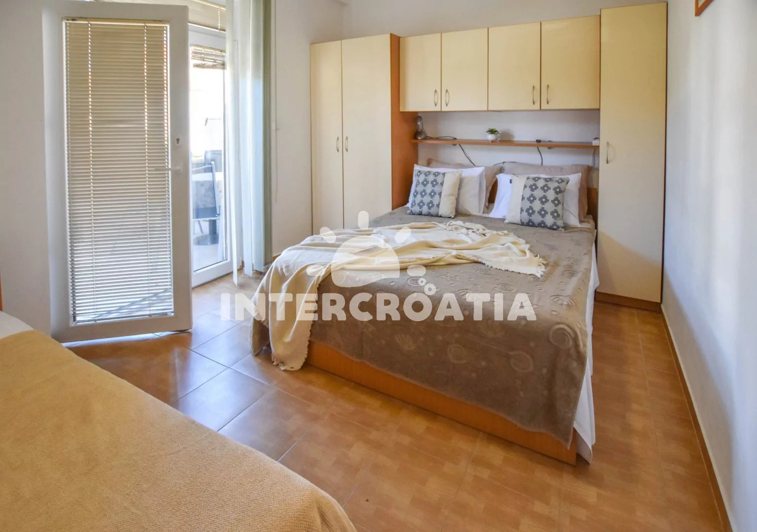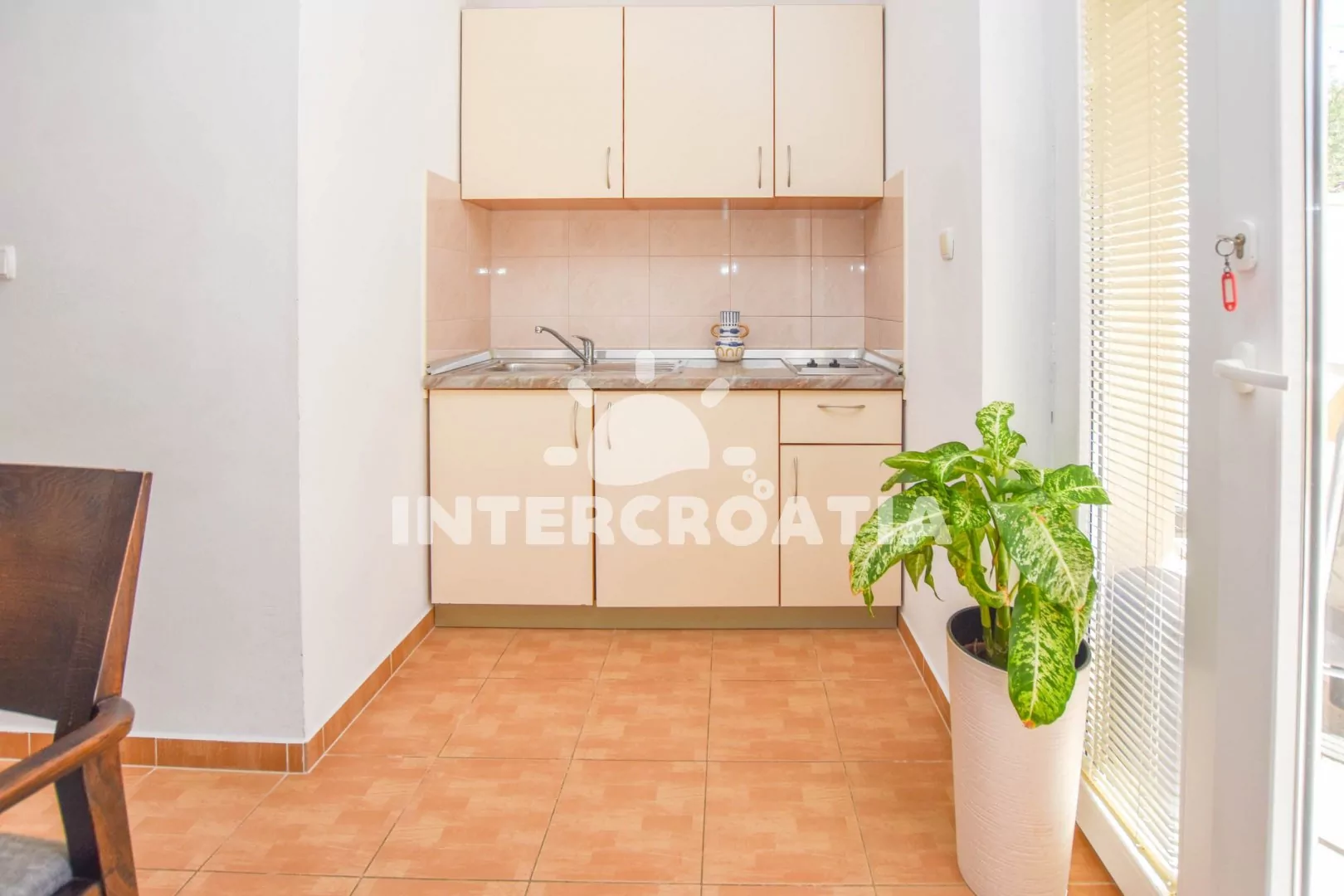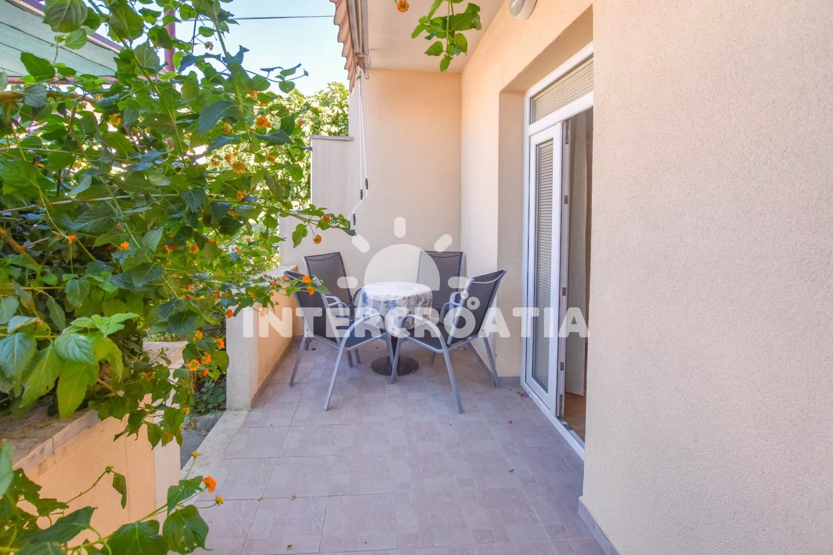 Apartmán (45 m2) s terasou a venkovním posezením se nachází v přízemí vily. Apartmán má 2 ložnice a je vhodný pro až 5 osob. Obývací místnost je spojena s kuchyní. Kuchyňská linka je vybavena dvouplotýnkovým vařičem, nádobím a lednicí s mrazákem. Obývací místnost s jídelním stolem, televizí, klimatizací a vstupem na terasu. První ložnice s dvoulůžkem, jednolůžkem a vstupem na terasu. Druhá ložnice s dvěma jednolůžky. Koupelna se sprchovým koutem, umyvadlem a wc. Hostům je k dispozici parkování u objektu zdarma.