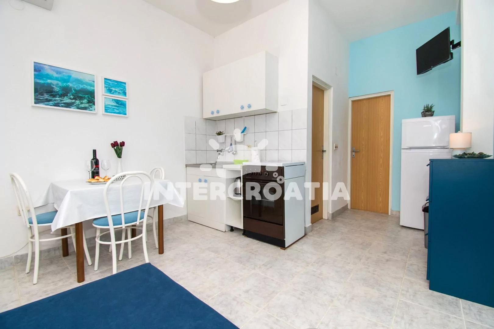 Apartmán (28 m2) s terasou a venkovní posezením se nachází v 1. paře domu. Apartmán má 1 ložnici a je vhodný pro 2 až 4 osoby. Obývací pokoj je spojený s kuchyní. Kuchyňská linka je vybavena sporákem s troubou, rychlovarnou konvicí, nádobím a lednicí s mrazákem. Obývací pokoj s jídelním stolem, pohovkou (rozložitelná na extra lůžko pro 2 osoby), televizí, klimatizací a vstupem na terasu. Ložnice s jedním dvoulůžkem. Koupelna se sprchovým koutem, umyvadlem a wc. Hostům je k dispozici parkování u objektu zdarma.