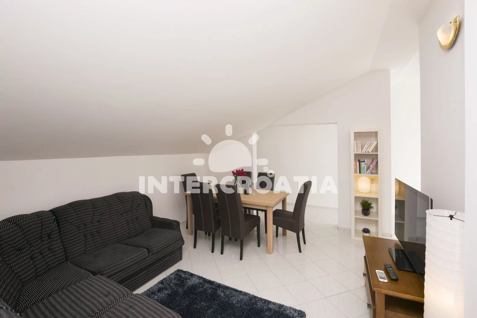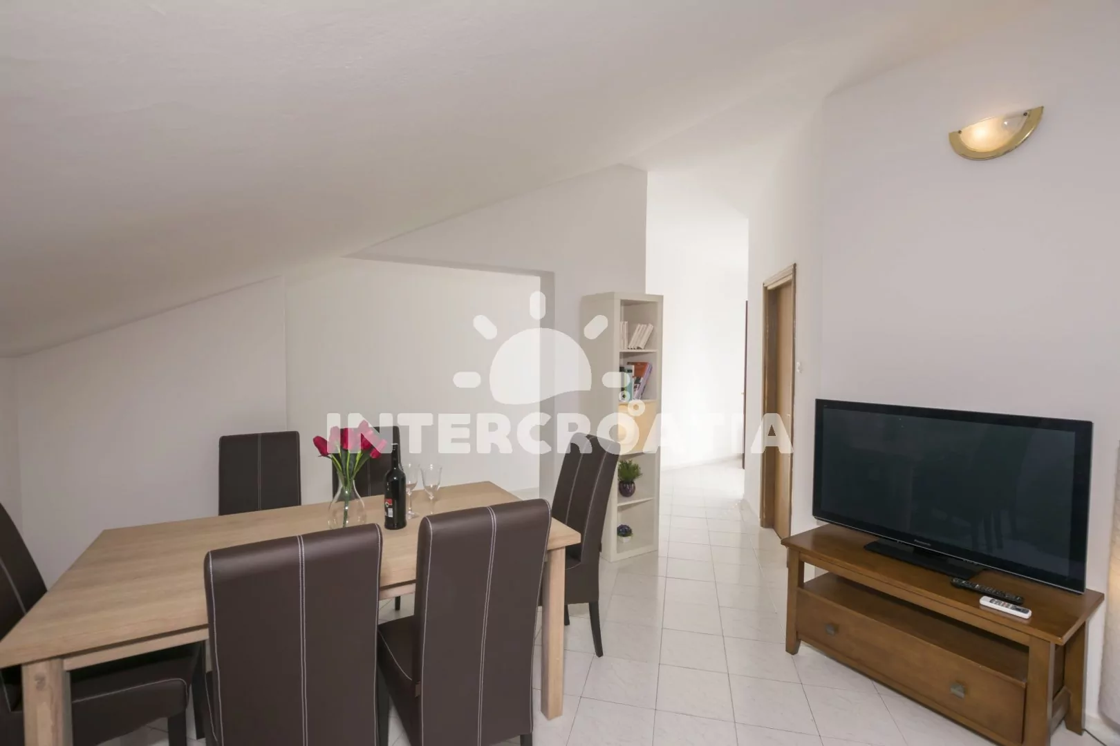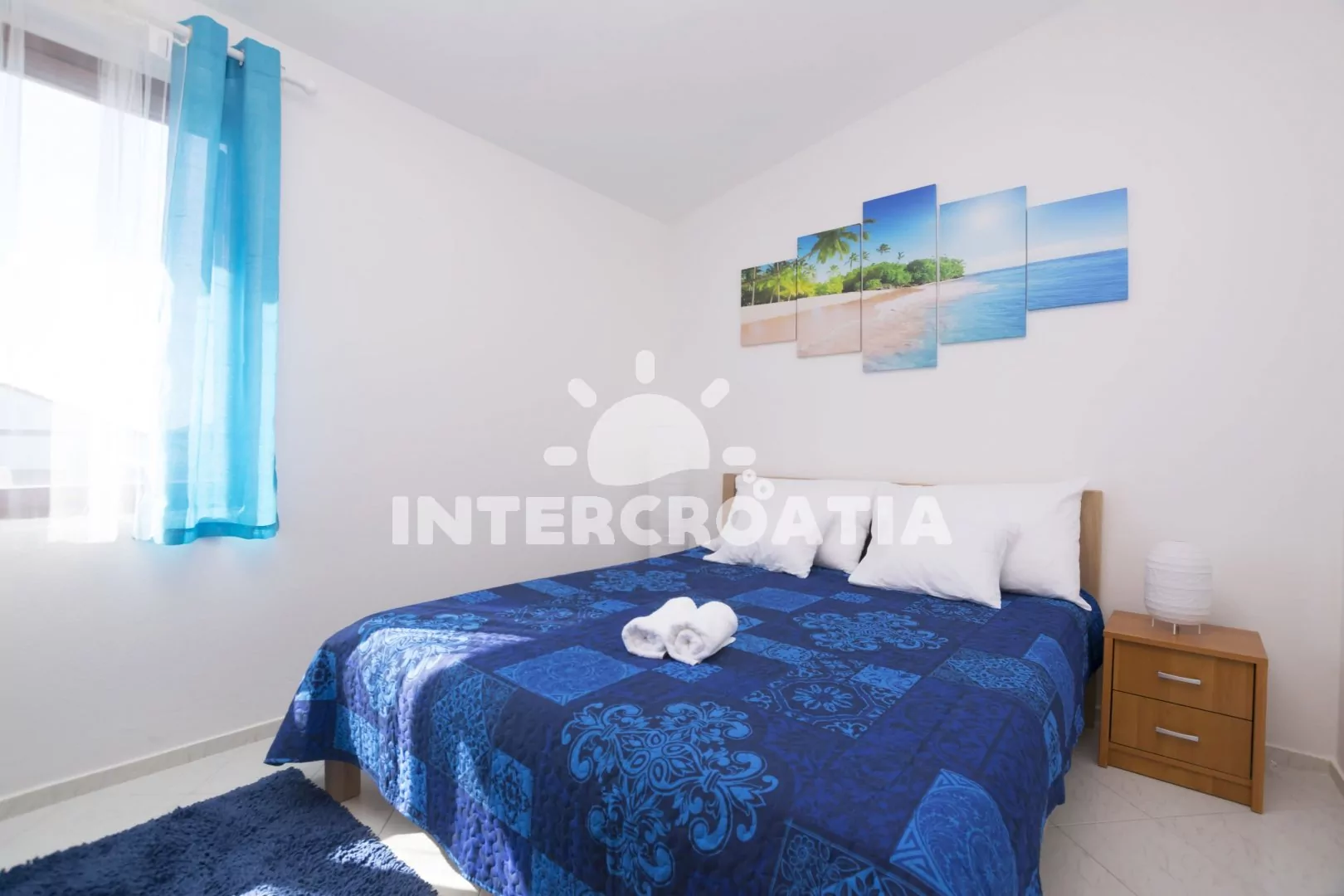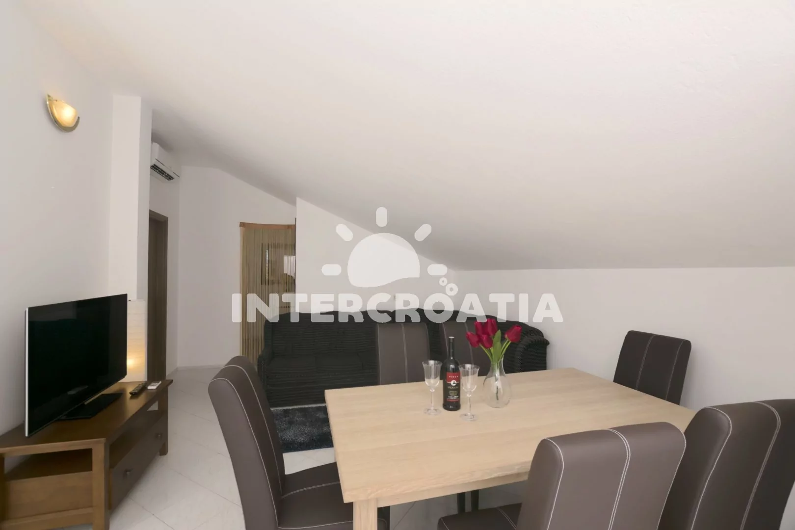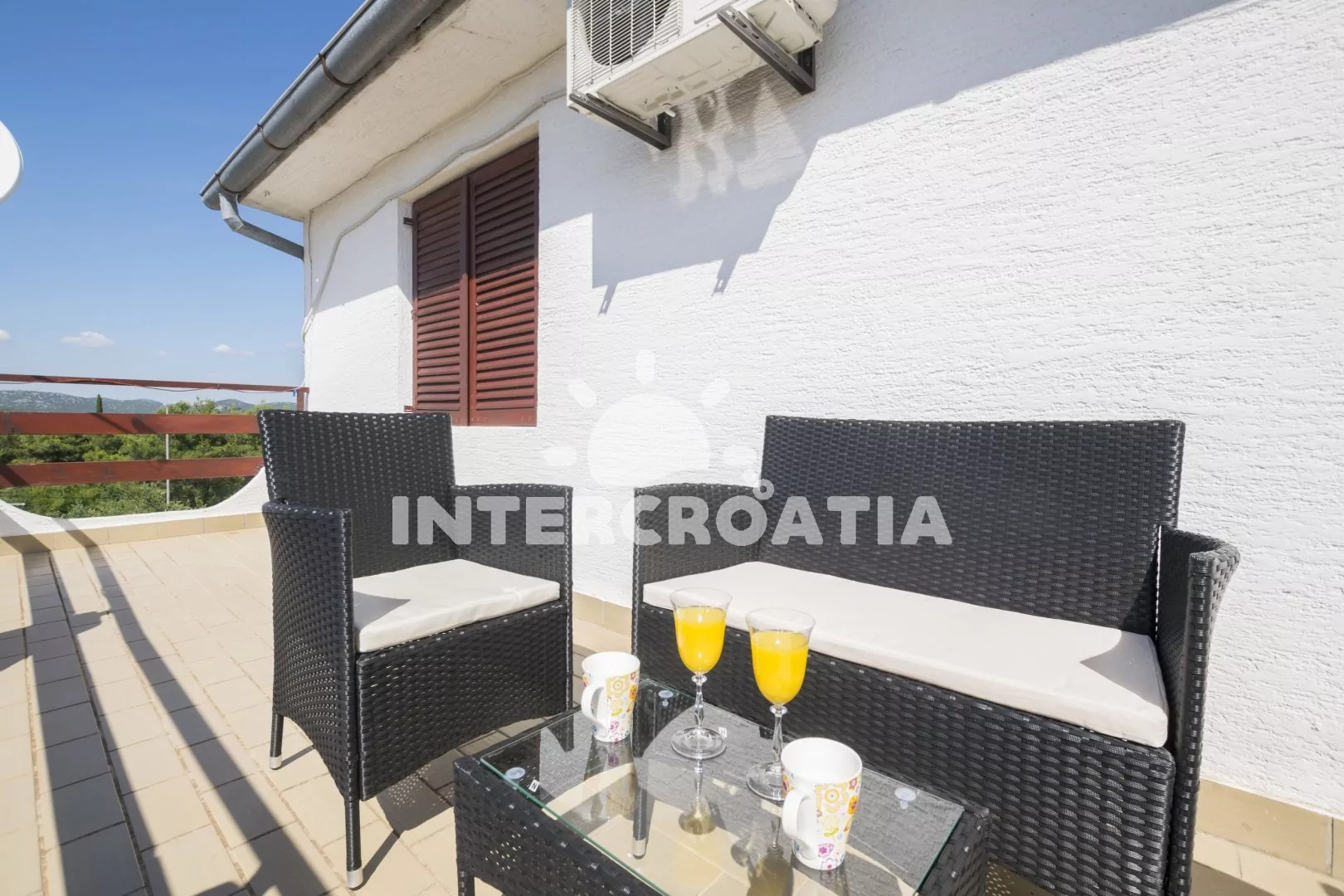 Apartmán (75 m2) s výhledem na moře je umístěný v druhém patře vilky a je vhodný pro 4 až 6 osob. Kuchyňský kout se sporákem, troubou, rychlovarnou konvicí, mikrovlnnou troubou, nádobím a lednicí s mrazákem. Obývací pokoj s jídelním stolem pro 6 osob, rohovou pohovkou (rozložitelná na extra lůžko pro 2 osoby), televizí se satelitním programem a klimatizací. První i druhá ložnice je vybavena vždy s jedním dvoulůžkem. Koupelna se sprchovým koutem, umyvadlem a wc. Hostům je k dispozici parkování u objektu zdarma.