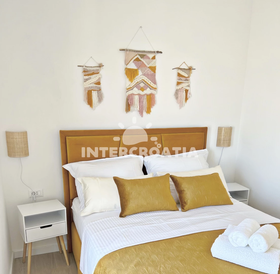 Apartmán (60 m2) s terasou a venkovním posezením se nachází ve 2. patře domu. Apartmán má 2 ložnice a je vhodný pro až 4 osoby. Obývací pokoj je spojený s kuchyní. Kuchyňská linka je vybavena sklokeramickou varnou deskou, digestoří, vestavěnou troubou, myčkou na nádobí, rychlovarnou konvicí, toustovačem, kávovarem, nádobím a lednicí s mrazákem. Obývací pokoj s jídelním stolem, pohovkou, televizí se satelitním programem, klimatizací a vstupem na terasu. První ložnice s dvoulůžkem. Druhá ložnice s dvoulůžkem. Koupelna se sprchovým koutem, umyvadlem, fénem, pračkou a wc. Hostům je k dispozici parkování u objektu zdarma.