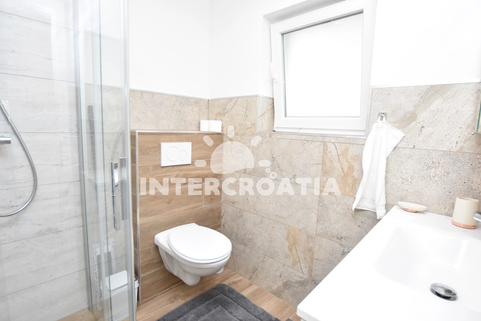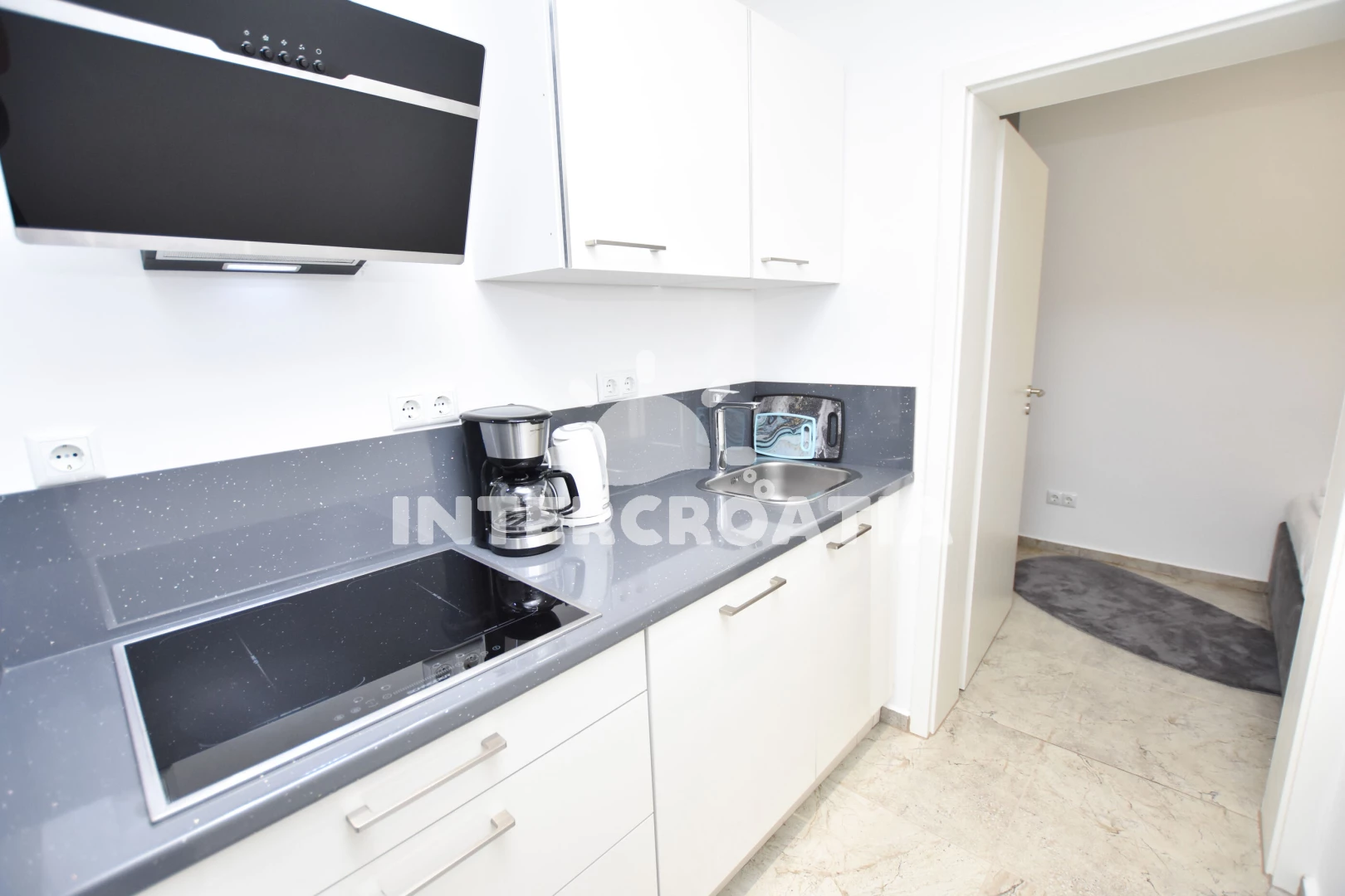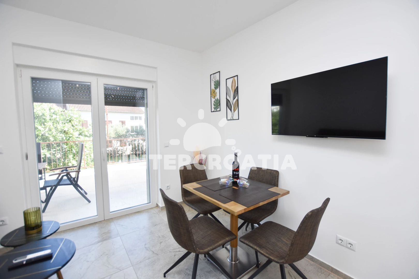 Apartmán (30 m2) s terasou a venkovním posezením se nachází v přízemí domu. Apartmán má 1 ložnici a je vhodný pro 2 osoby. Obývací pokoj je spojený s kuchyní. Kuchyňská linka je vybavena sklokeramickou varnou deskou, digestoří, vestavěnou troubou, myčkou na nádobí, rychlovarnou konvicí, kávovarem, toustovačem, nádobím a lednicí s mrazákem. Obývací pokoj s jídelním stolem, pohovkou, televizí, klimatizací a vstupem na terasu. Ložnice s dvoulůžkem a klimatizací. Koupelna se sprchovým koutem, umyvadlem, fénem a wc. Hostům je k dispozici parkování u objektu zdarma.