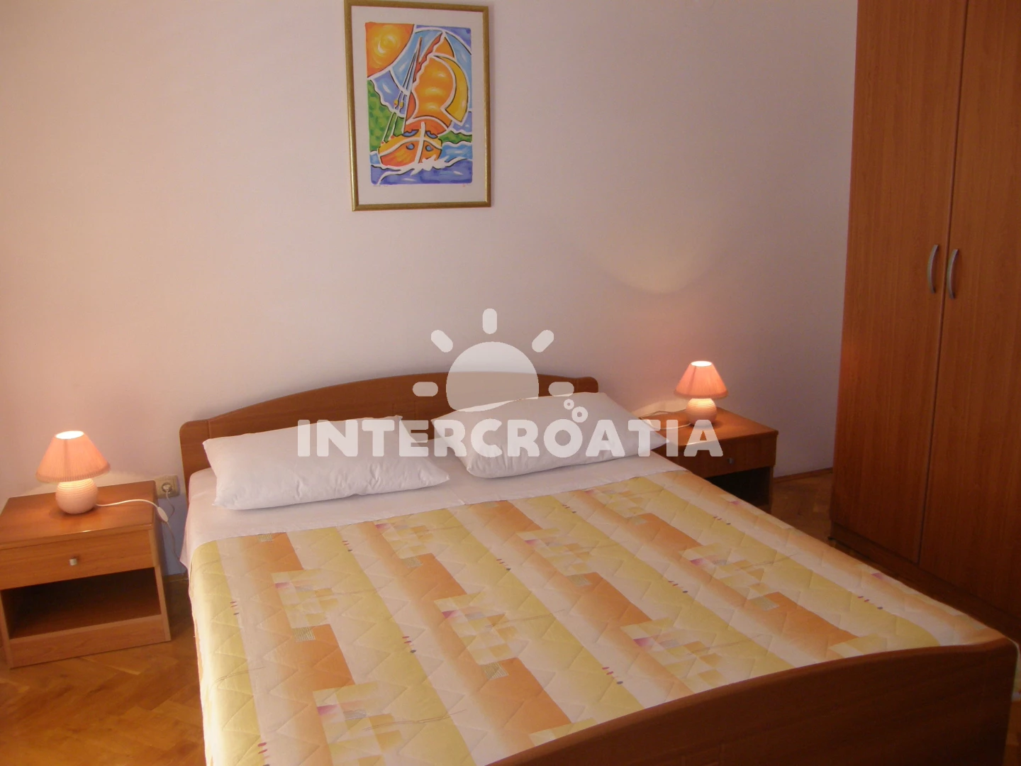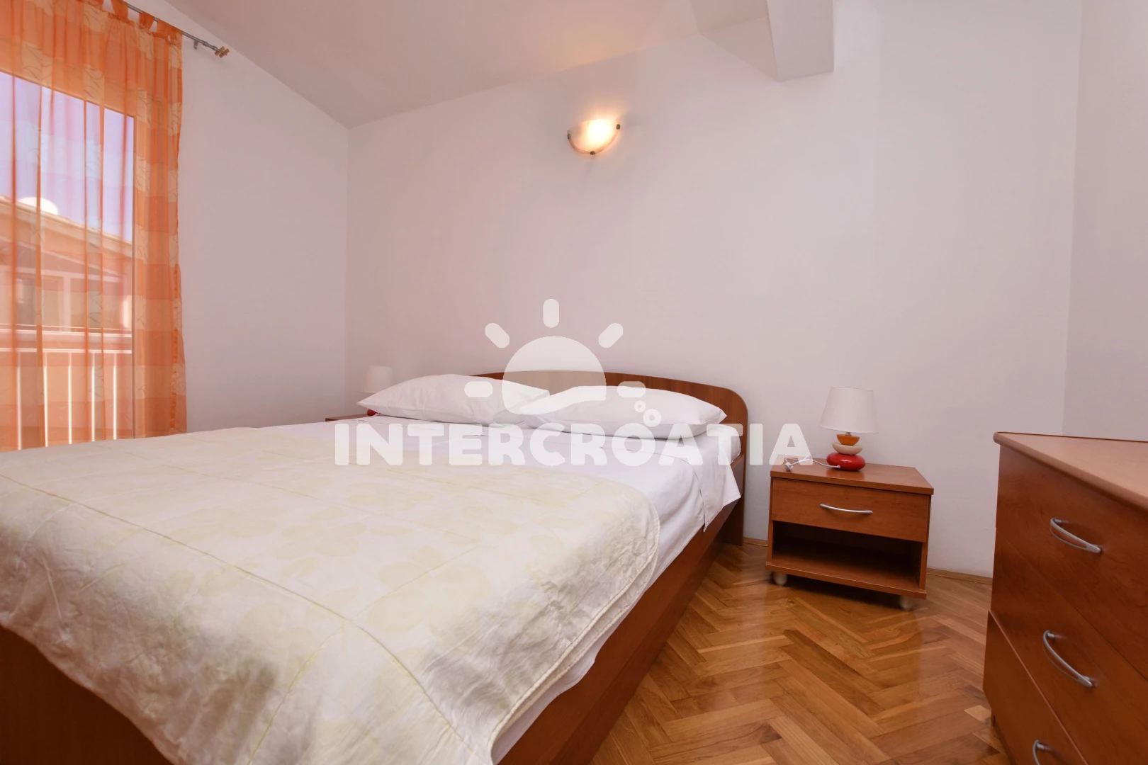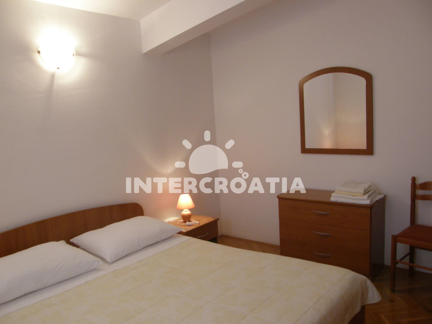 Apartmán (65 m2) s balkonem, posezením a výhledem na moře se nachází v podkroví domu. Apartmán má 2 ložnice a je vhodný pro až 5 osob. Obývací pokoj je spojený s kuchyní. Kuchyňská linka je vybavena sporákem s troubou, digestoří, nádobím a lednicí s mrazákem. Obývací pokoj s jídelním stolem, pohovkou (rozložitelná na extra lůžko pro 1 osobu), televizí se satelitním programem, klimatizací a vstupem na balkon. První i druhá ložnice je vybavena vždy s jedním dvoulůžkem. Koupelna se sprchovým koutem, umyvadlem, pračkou a wc. Hostům je k dispozici parkování u objektu zdarma.