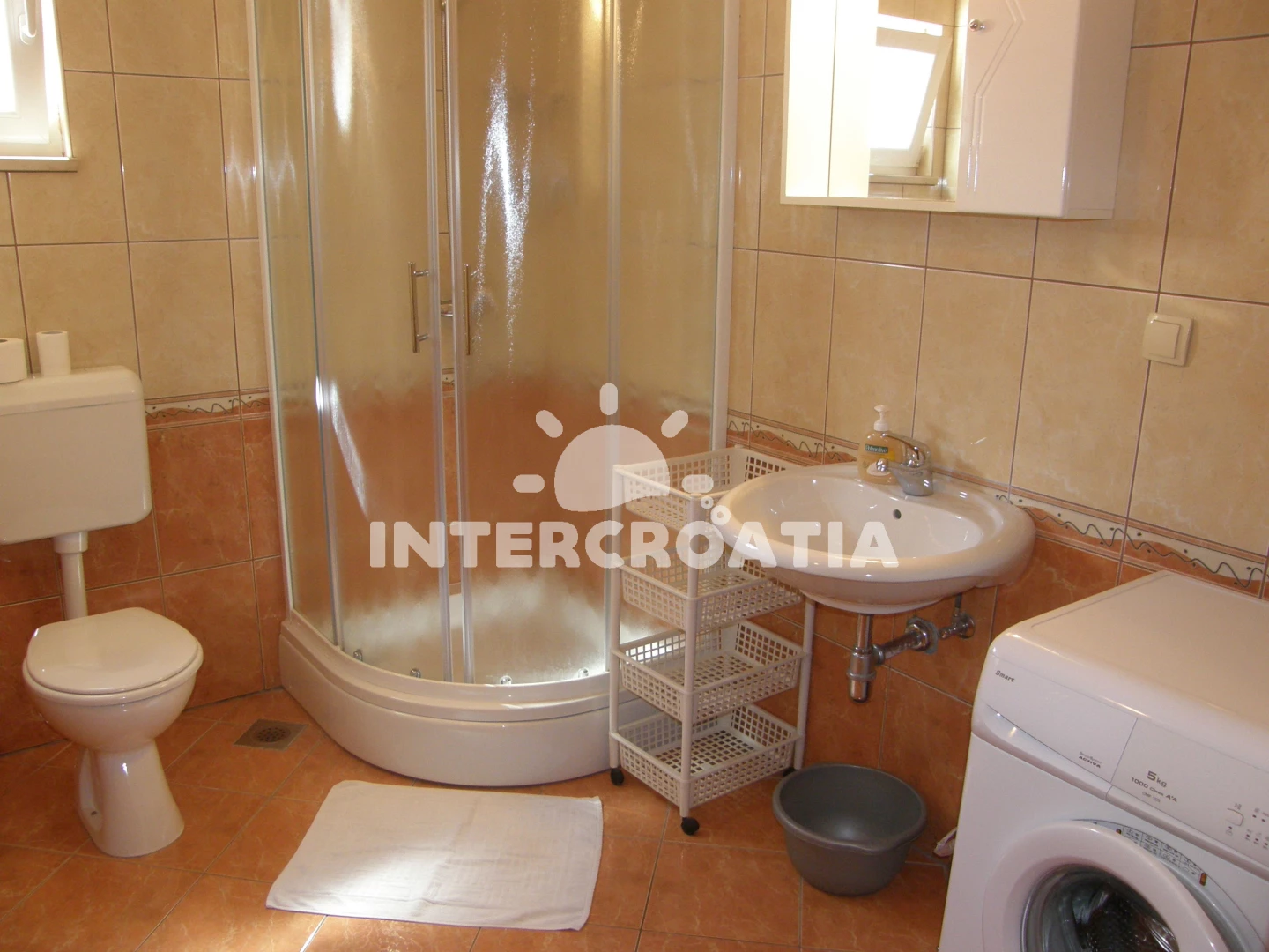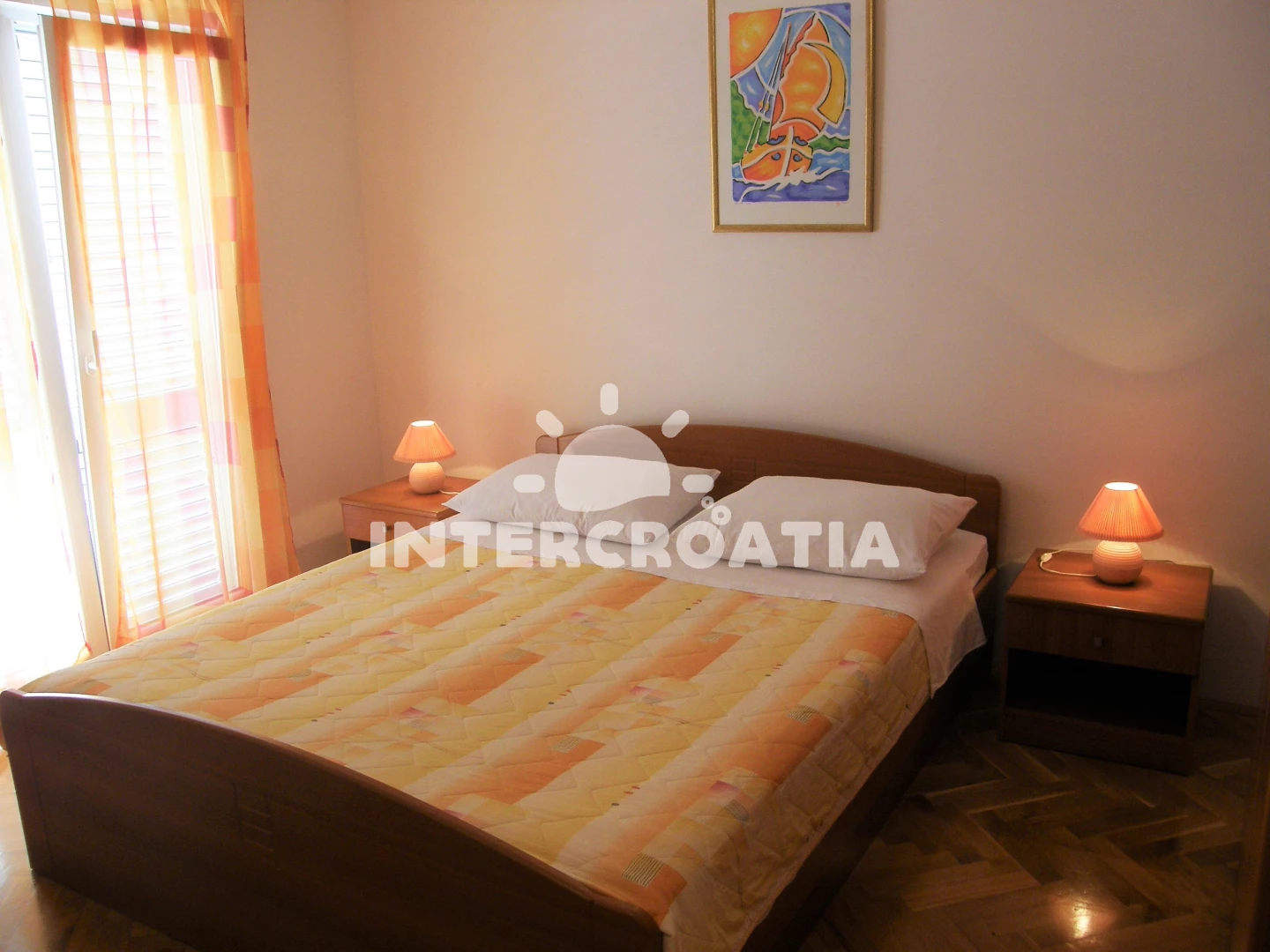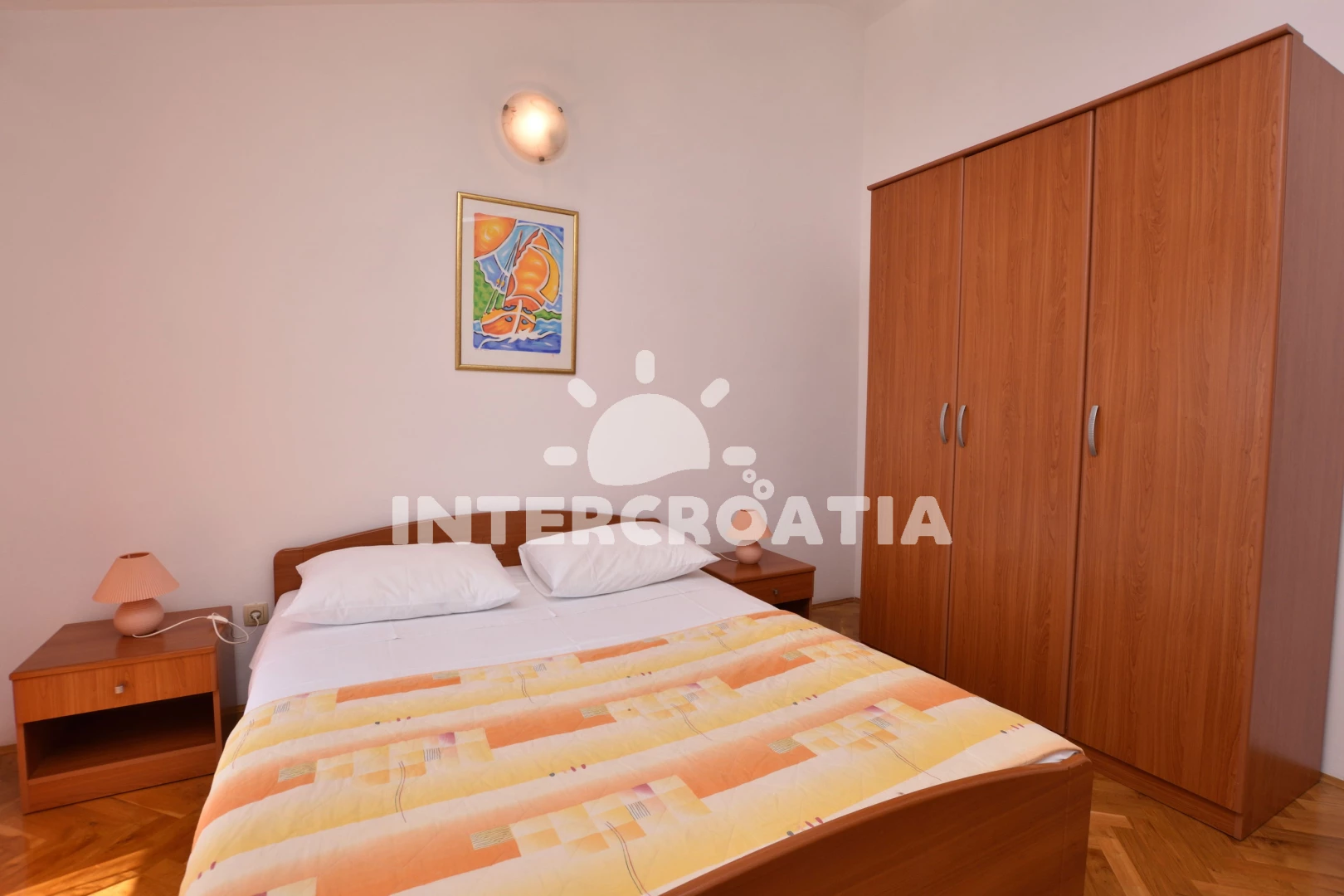 Apartmán (65 m2) s balkonem, posezením a výhledem na moře se nachází v podkroví domu. Apartmán má 2 ložnice a je vhodný pro až 5 osob. Obývací pokoj je spojený s kuchyní. Kuchyňská linka je vybavena sporákem s troubou, digestoří, nádobím a lednicí s mrazákem. Obývací pokoj s jídelním stolem, pohovkou (rozložitelná na extra lůžko pro 1 osobu), televizí se satelitním programem, klimatizací a vstupem na balkon. První i druhá ložnice je vybavena vždy s jedním dvoulůžkem. Koupelna se sprchovým koutem, umyvadlem, pračkou a wc. Hostům je k dispozici parkování u objektu zdarma.