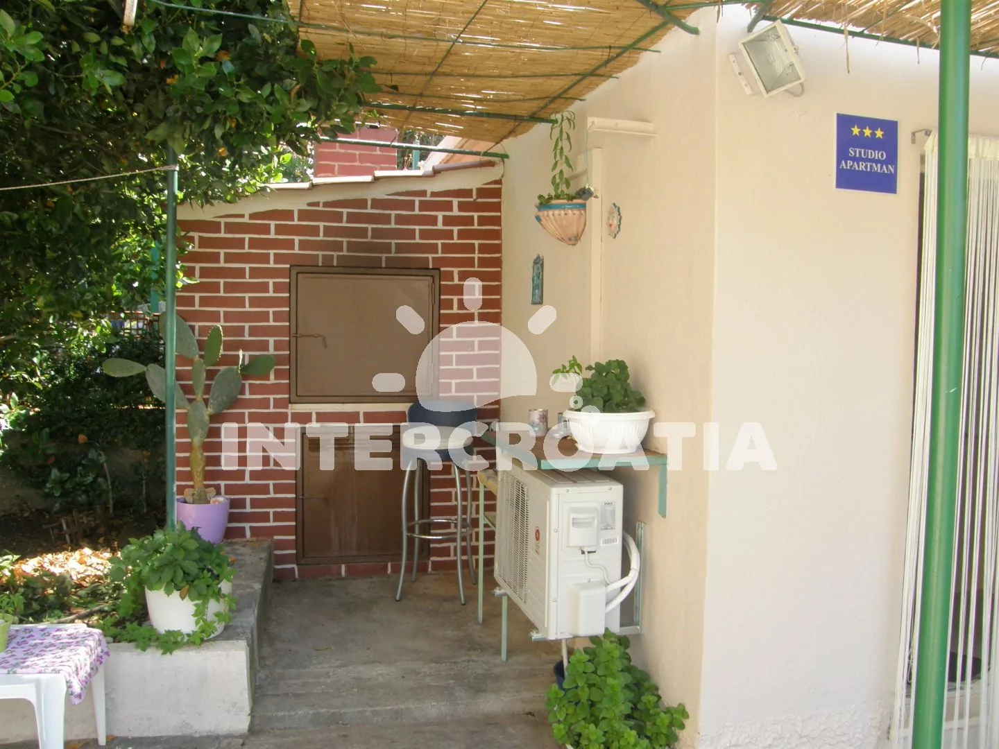Apartmán typu studio pro dvě osoby se nachází v přízemí domu. Kuchyňský kout s elektrickým dvouplotýnkovým sporákem, nádobím, rychlovarnou konvicí, lednicí a jídelním stolem. Obývací část s televizí se satelitním programem a manželskou postelí. Koupelna se sprchovým koutem, umyvadlem a wc. K dispozici WiFi, klimatizace a venkovní posezení na terase.