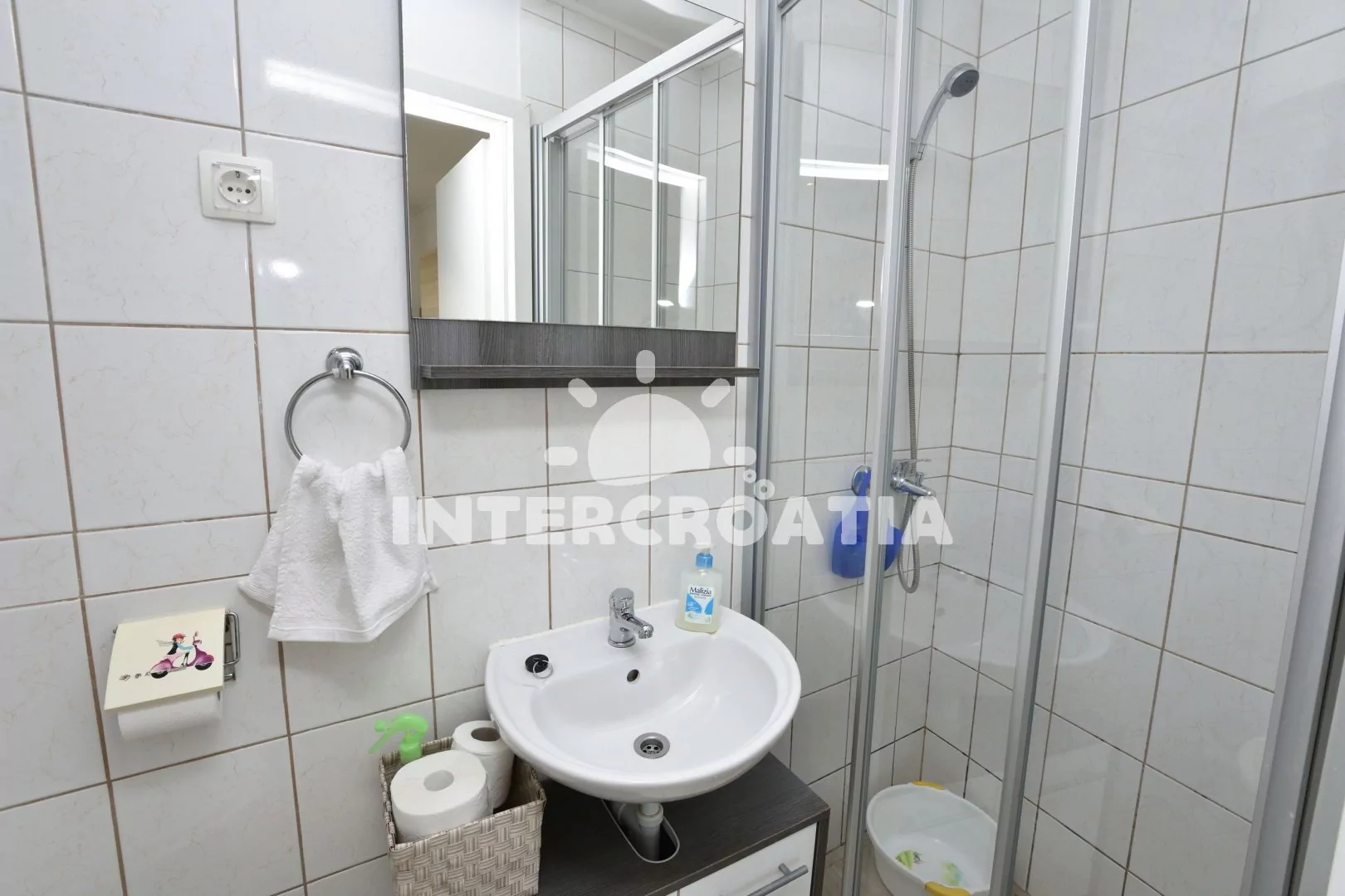 Vzdálenosti: Moře 85 m, pláž (skalnatá a oblázková) 120 m, centrum 450 m, market 120 m, pošta 410 m, lékárna 360 m, nemocnice 1 km, restaurace 380 m, směnárna 430 m, banka 460 m, přístav 1 950 m, potápěčský klub 930 m, půjčovna kol 530 m, půjčovna motorových člunů 380 m, tenisové kurty 575 m, mini golf 635 m, diskotéka 1 350 m, bar 115 m, čerpací stanice 300 m, veřejná doprava 385 m, trajekt (Split) 60 km, letiště (Split) 30 km.