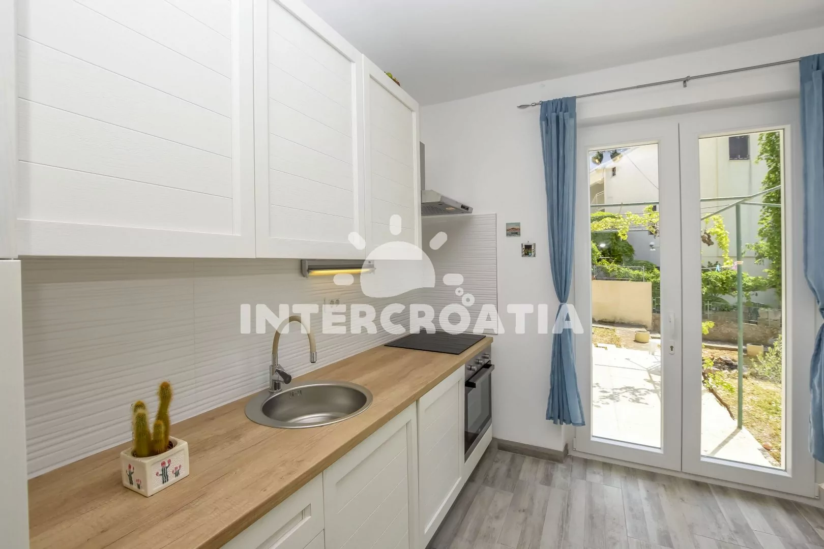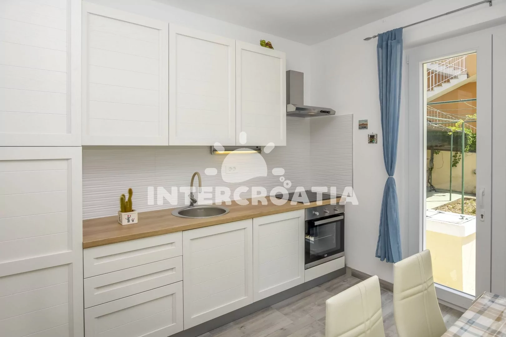 Apartmán (55 m2) pro 4 až 6 osob s terasou a posezením se nachází ve zvýšeném přízemí domu. Kuchyň s jídelním stolem pro 5 osob, kuchyňskou linou s varnou deskou, digestoří, vestavěnou troubou, myčkou na nádobí, rychlovarnou konvicí, kávovarem, nádobím, lednicí s mrazákem, klimatizací a vstupem na terasu. Obývací pokoj s pohovkou (extra lůžko pro 2 osoby), psacím stolem a televizí se satelitním programem. První ložnice s jedním dvoulůžkem. Druhá ložnice s dvěma jednolůžky. Koupelna se sprchovým koutem, umyvadlem a wc. Hostům je k dispozici parkování u objektu zdarma.