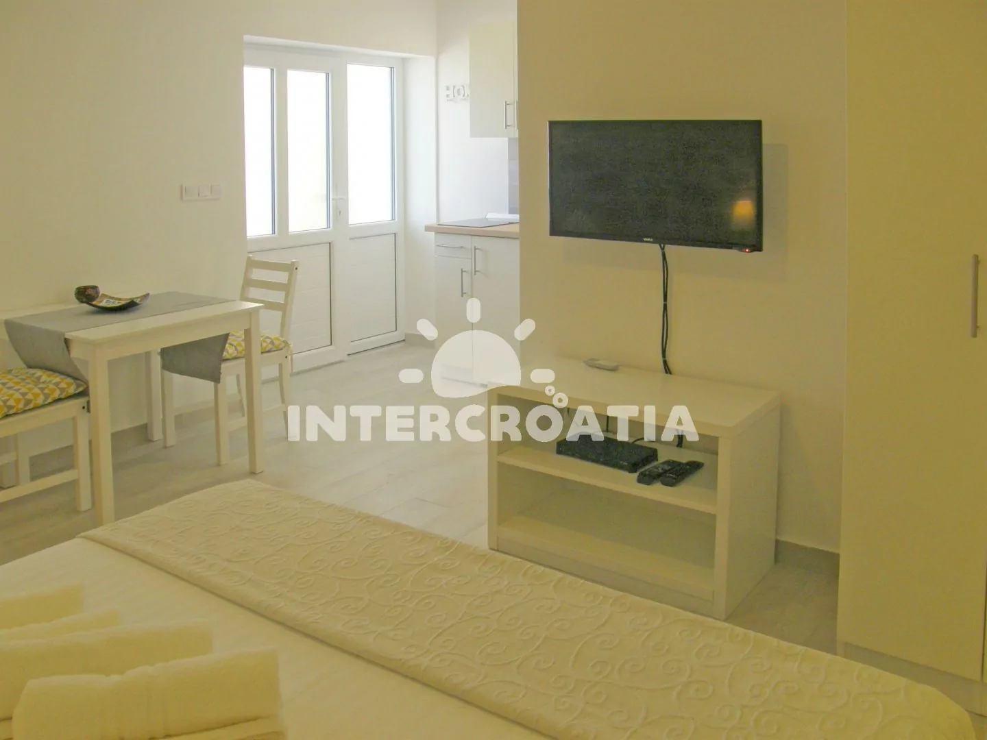 Moderně zařízený apartmán v přízemí domu nabízí ubytování pro 2 osoby. Kuchyňský kout je vybaven nádobím, dvouplotýnkovým elektrickým vařičem, rychlovarnou konvicí, chladničkou a jídelním stolem. Obývací část s jedním manželským dvoulůžkem a televizí se satelitním programem. Koupelna se sprchovým koutem, umyvadlem a wc. K dispozici: WiFi, klimatizace a terasa s posezením.