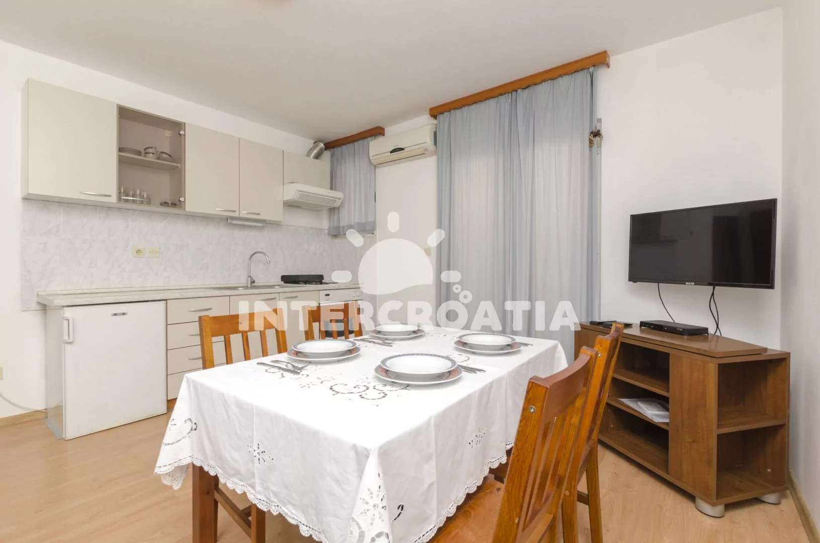 Vzdálenosti: Moře 250 m, pláž (oblázková a větší kamení) 250 m, obchod 60 m, centrum 150 m, pošta 150 m, lékárna 130 m, zdravotní středisko 1300 m, restaurace 200 m, směnárna 130 m, banka 200 m, bar 250 m, půjčovna kol 250 m, půjčovna motorových člunů 230 m, potápěčský klub 650 m, tenisové kurty 300 m, minigolf 370 m, diskotéka 1600 m, čerpací stanice 140 m, veřejná doprava 100 m, přístav 2200 m, trajekt 60 km (Split), letiště 30 km (Split).