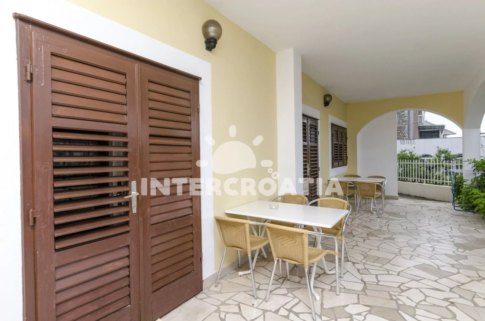 Apartmán s terasou a posezením je vhodný pro 2 až 4 osoby. Nachází se v přízemí objektu. Obývací pokoj je oddělený od kuchyňského koutu. Kuchyňská linka s elektrickým dvouplotýnkovým sporákem, rychlovarnou konvicí, kávovarem, nádobím a lednicí s mrazákem. Obývací pokoj s jídelním stolem pro 2 osoby, televizí se satelitním programem, rozložitelnou rohovou pohovkou (extra lůžko pro 2 osoby) a vstupem na terasu. Ložnice s jedním dvoulůžkem. Koupelna se sprchovým koutem, umyvadlem a wc. Hostům je k dispozici parkování u objektu zdarma.