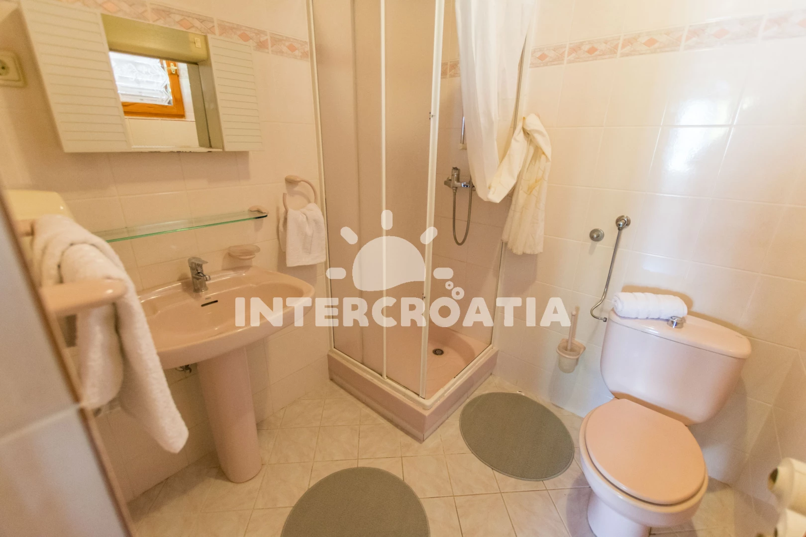 Vzdálenosti: Moře 260 m, pláž (oblázková a větší kamení) 500 m, centrum 555 m, market 100 m, pošta 320 m, lékárna 365 m, nemocnice 1 km, restaurace 400 m, směnárna 350 m, banka 325 m, přístav 2,08 km, potápěčský klub 815 m, půjčovna motorových člunů 455 m, půjčovna kol 350 m, tenisové kurty 510 m, minigolf 590 m, park Plitvice 45 km, nejbližší národní park Krka, diskotéka 1,350 km, bar 100 m, čerpací stanice 120 m, veřejná doprava 315 m, trajekt (Split) 60 km, letiště (Split) 30 km.