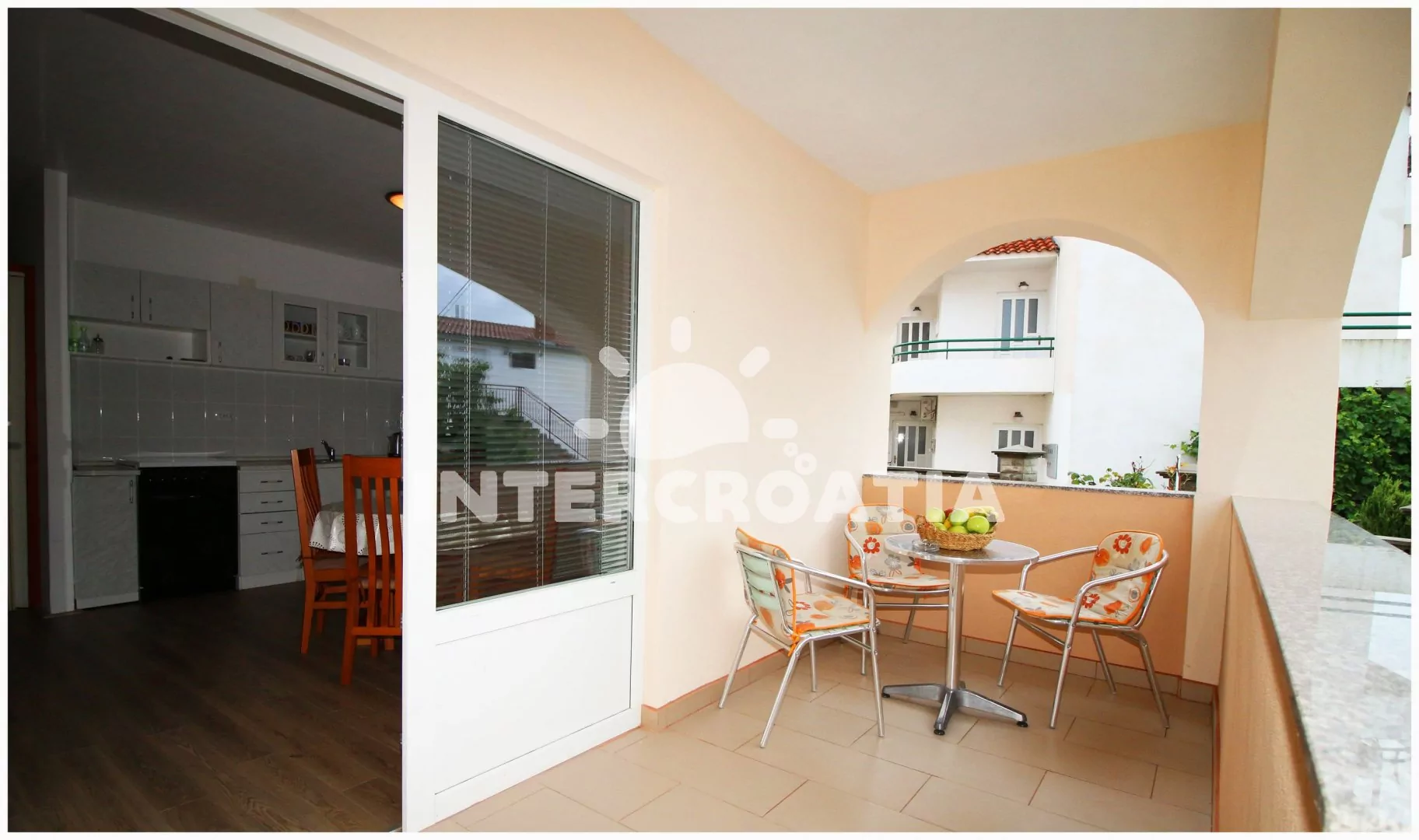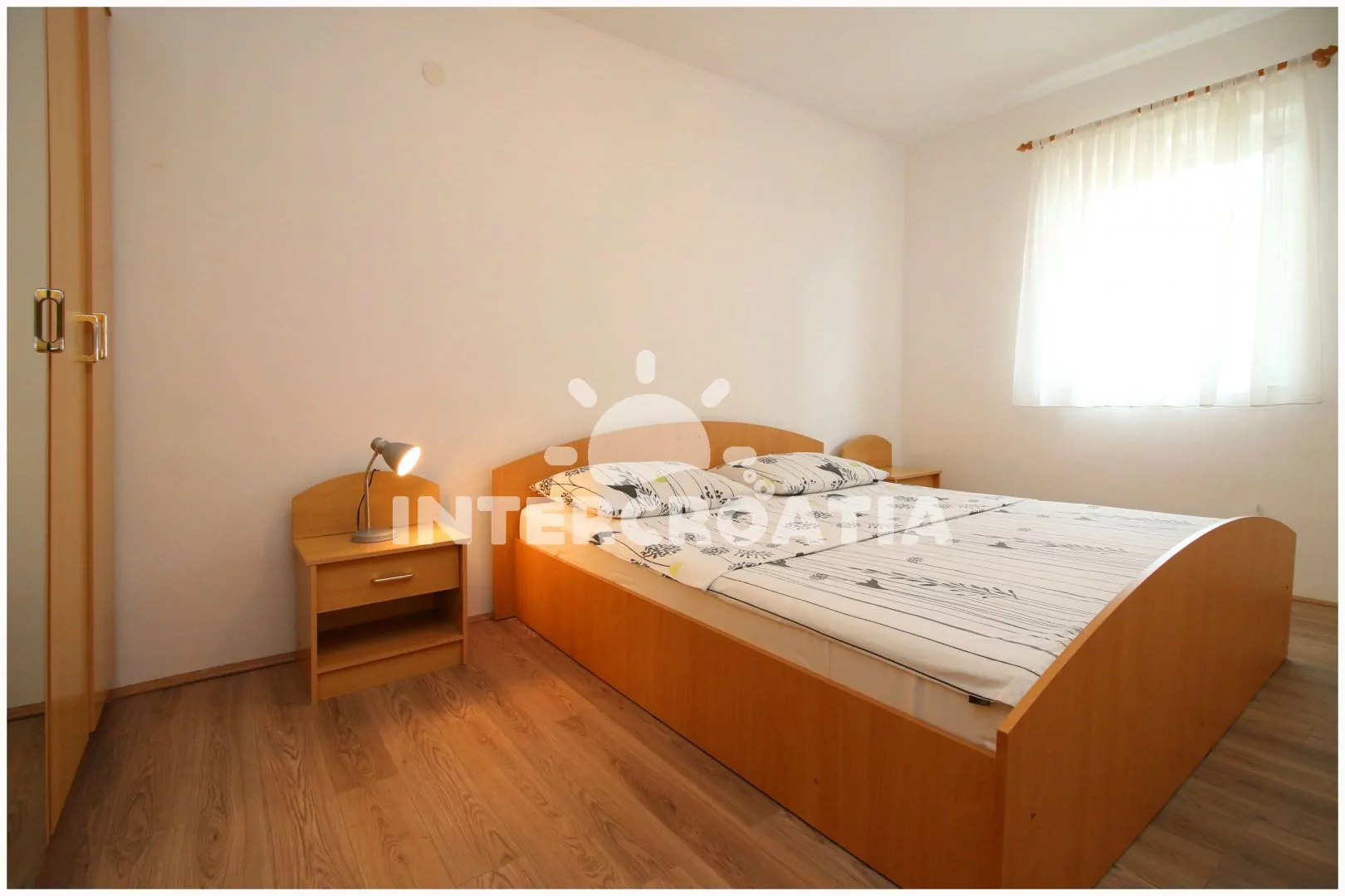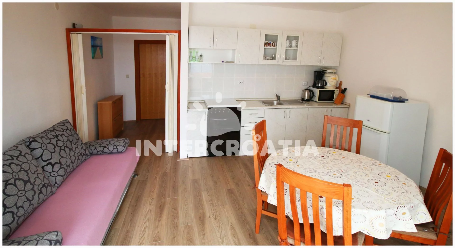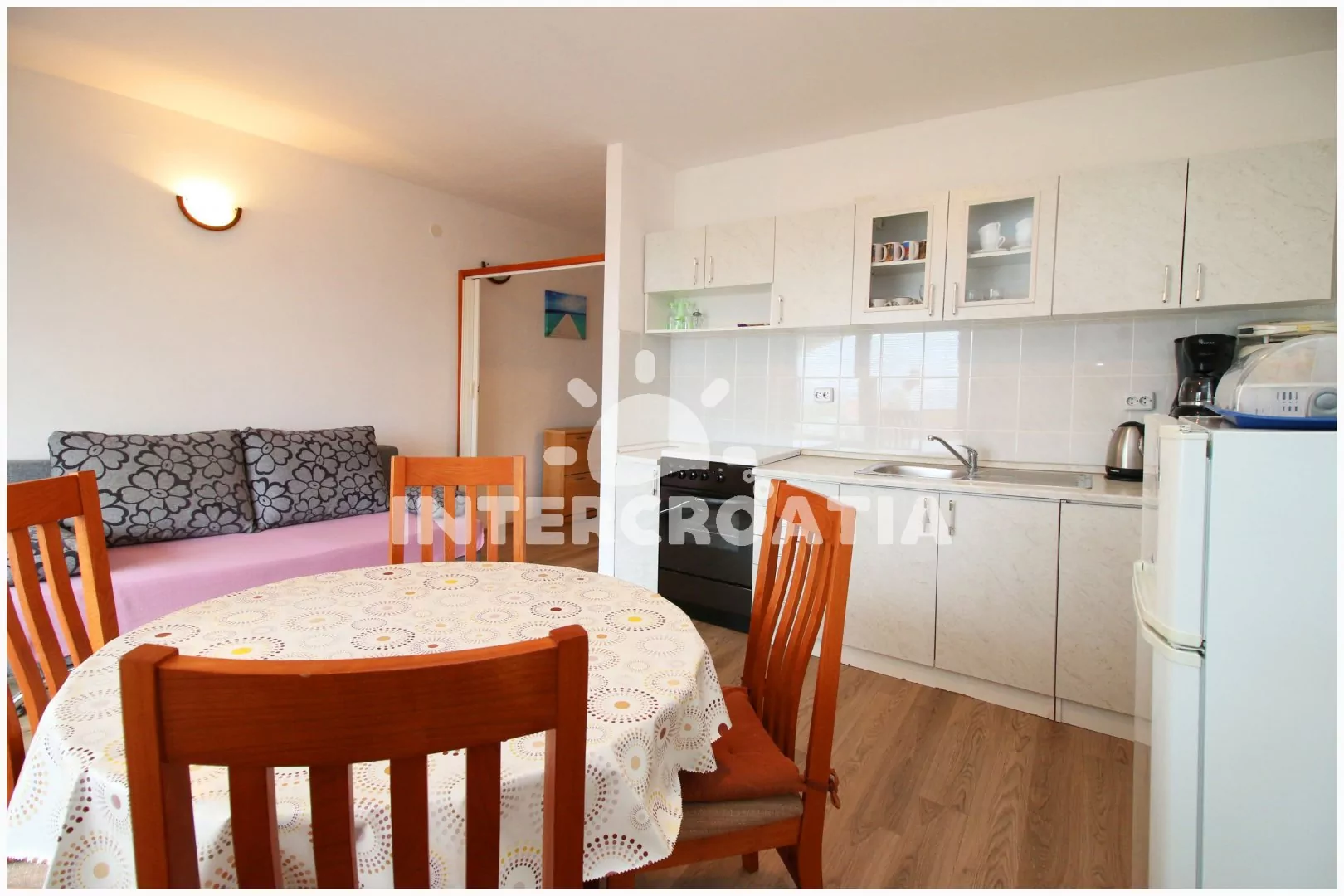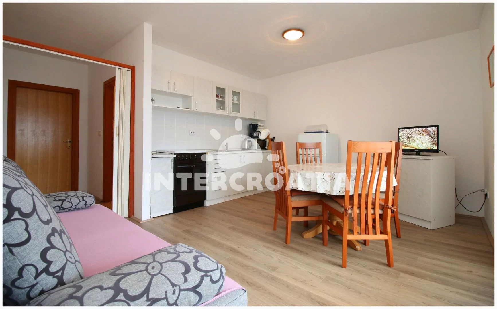 Apartmán s výhledem na moře a balkonem s posezením je vhodný pro 4 osoby, nachází se v přízemí vilky. Obývací pokoj je spojený s kuchyní. Kuchyňská linka se sporákem, troubou, rychlovarnou konvicí, mikrovlnnou troubou, kávovarem, toustovačem, nádobím a lednicí s mrazákem. Obývací pokoj s jídelním stolem pro 4 osoby, televizí se satelitním programem, rozložitelnou pohovkou (extra lůžko pro 2 osoby), klimatizací a vstupem na balkon. Ložnice je vybavena jedním dvoulůžkem. Koupelna se sprchovým koutem umyvadlem, fénem a wc. Hostům je k dispozici parkování u objektu zdarma.