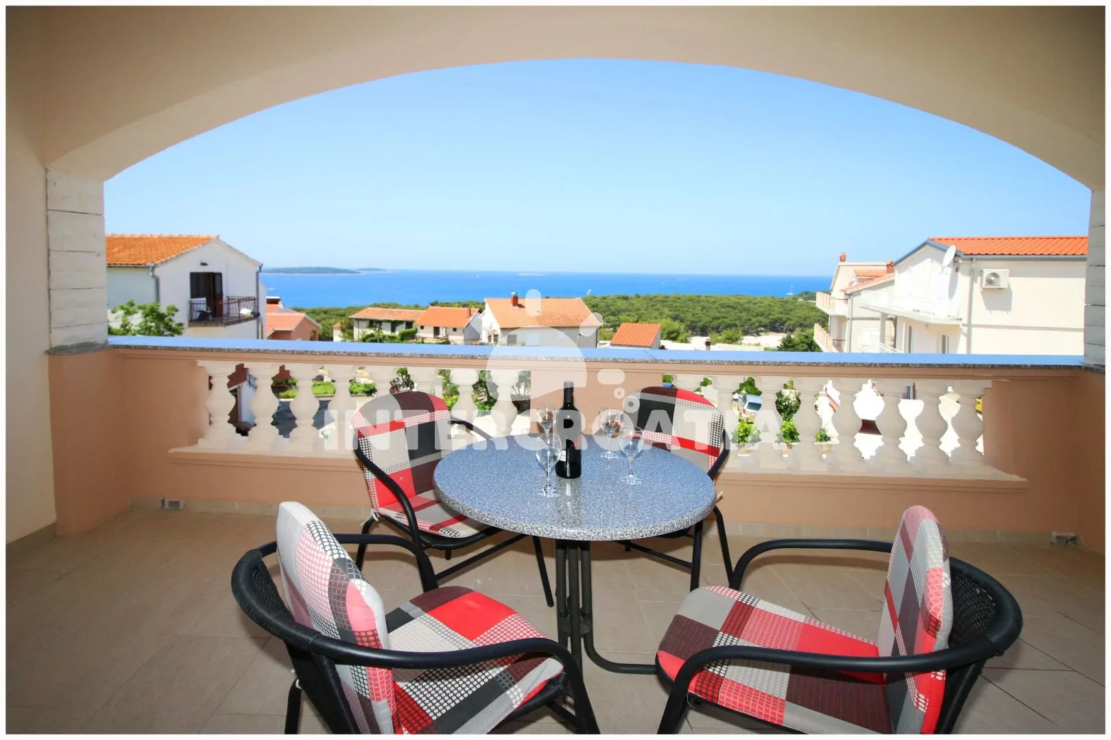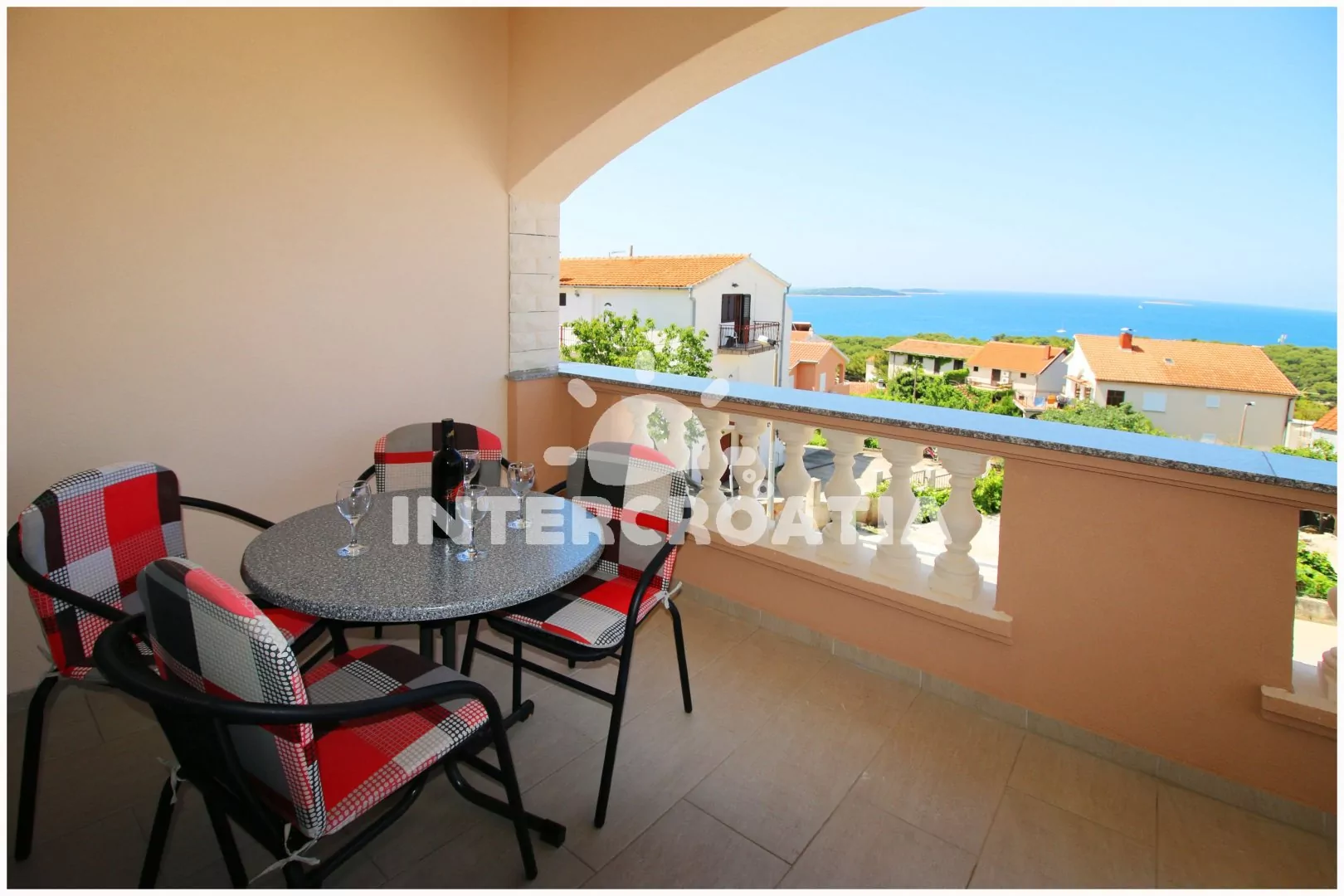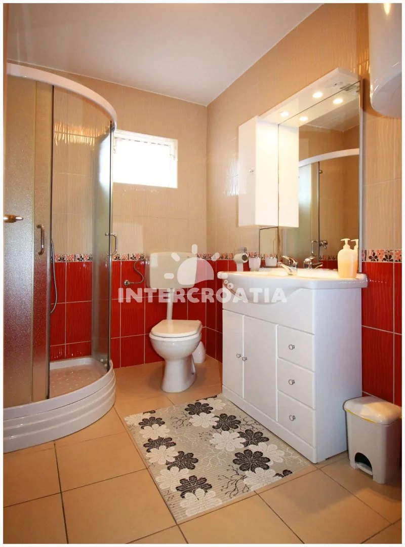 Apartmán s výhledem na moře a balkonem s posezením je vhodný pro 6 osob, nachází se v prvním patře vilky. Obývací pokoj je spojený s kuchyní. Kuchyňská linka se sporákem, troubou, rychlovarnou konvicí, mikrovlnnou troubou, kávovarem, toustovačem, nádobím a lednicí s mrazákem. Obývací pokoj s jídelním stolem pro 6 osob, televizí se satelitním programem, rozložitelnou pohovkou (extra lůžko pro 2 osoby), klimatizací a vstupem na balkon. První i druhá ložnice je vybavena vždy s jedním dvoulůžkem. Koupelna se sprchovým koutem umyvadlem, fénem a wc. Dále samostatné wc s umyvadlem. Hostům je k dispozici parkování u objektu zdarma.