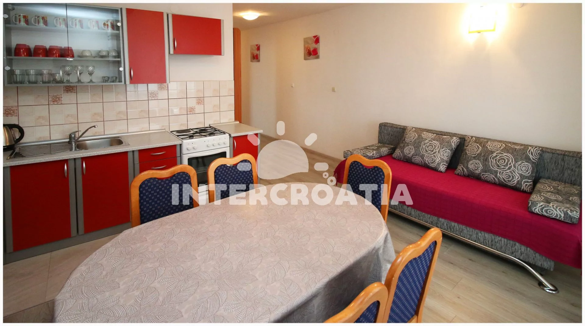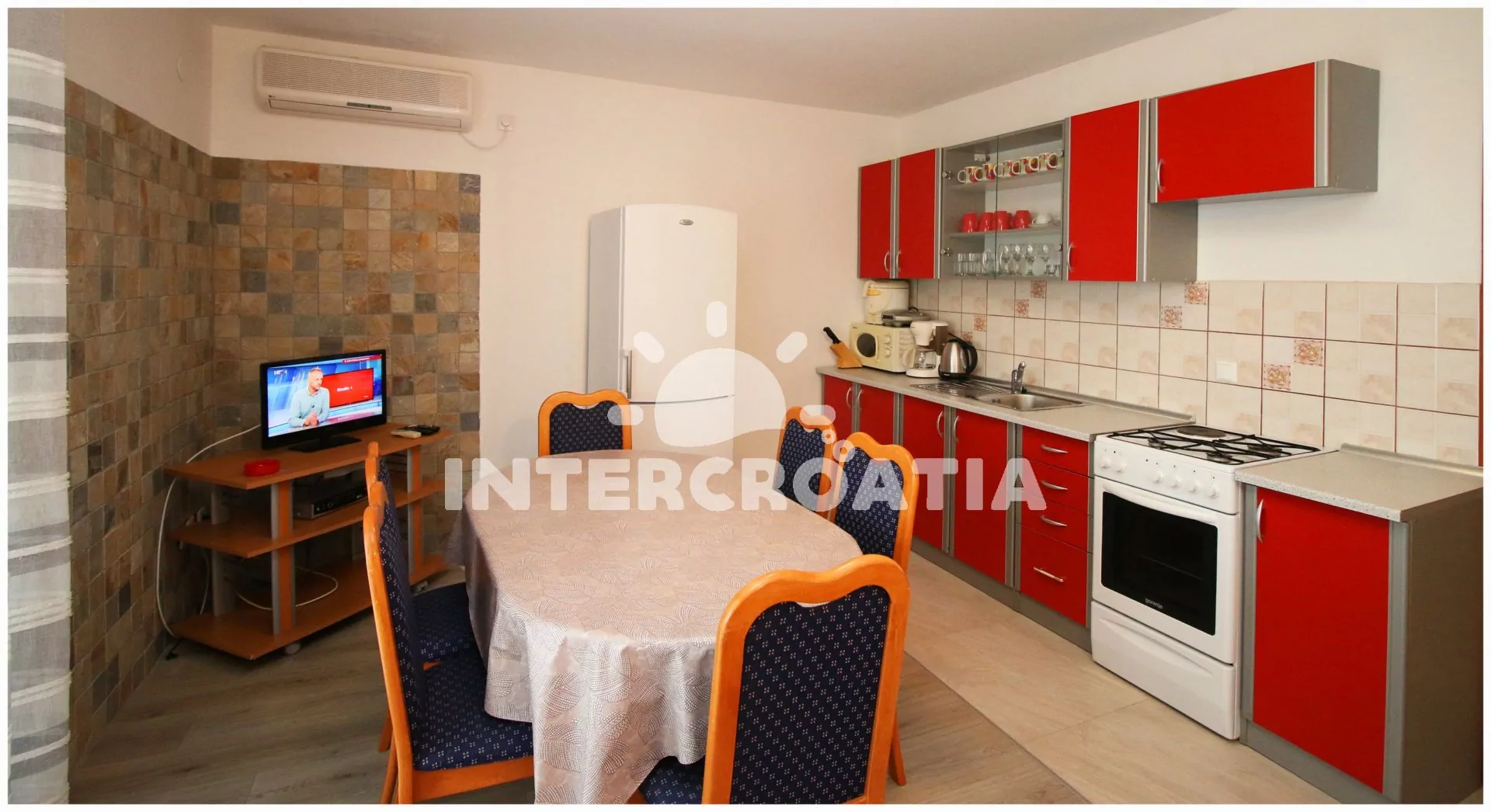 Apartmán s výhledem na moře a balkonem s posezením je vhodný pro 6 osob, nachází se v prvním patře vilky. Obývací pokoj je spojený s kuchyní. Kuchyňská linka se sporákem, troubou, rychlovarnou…