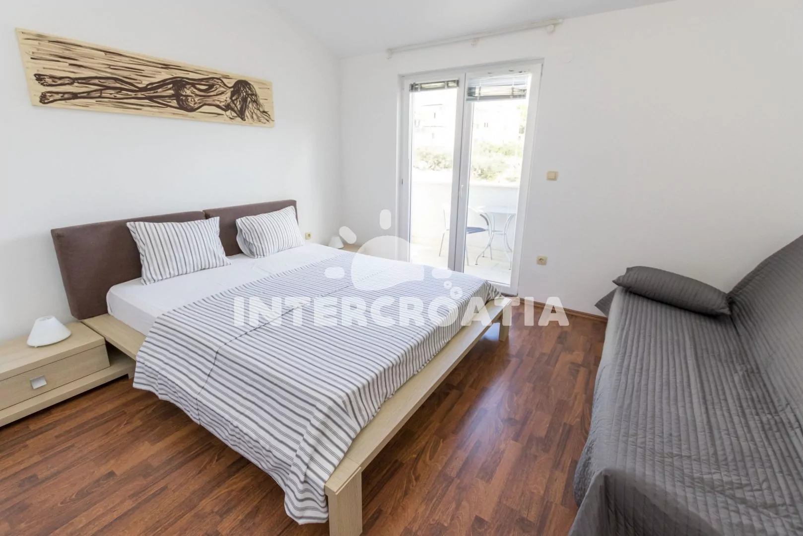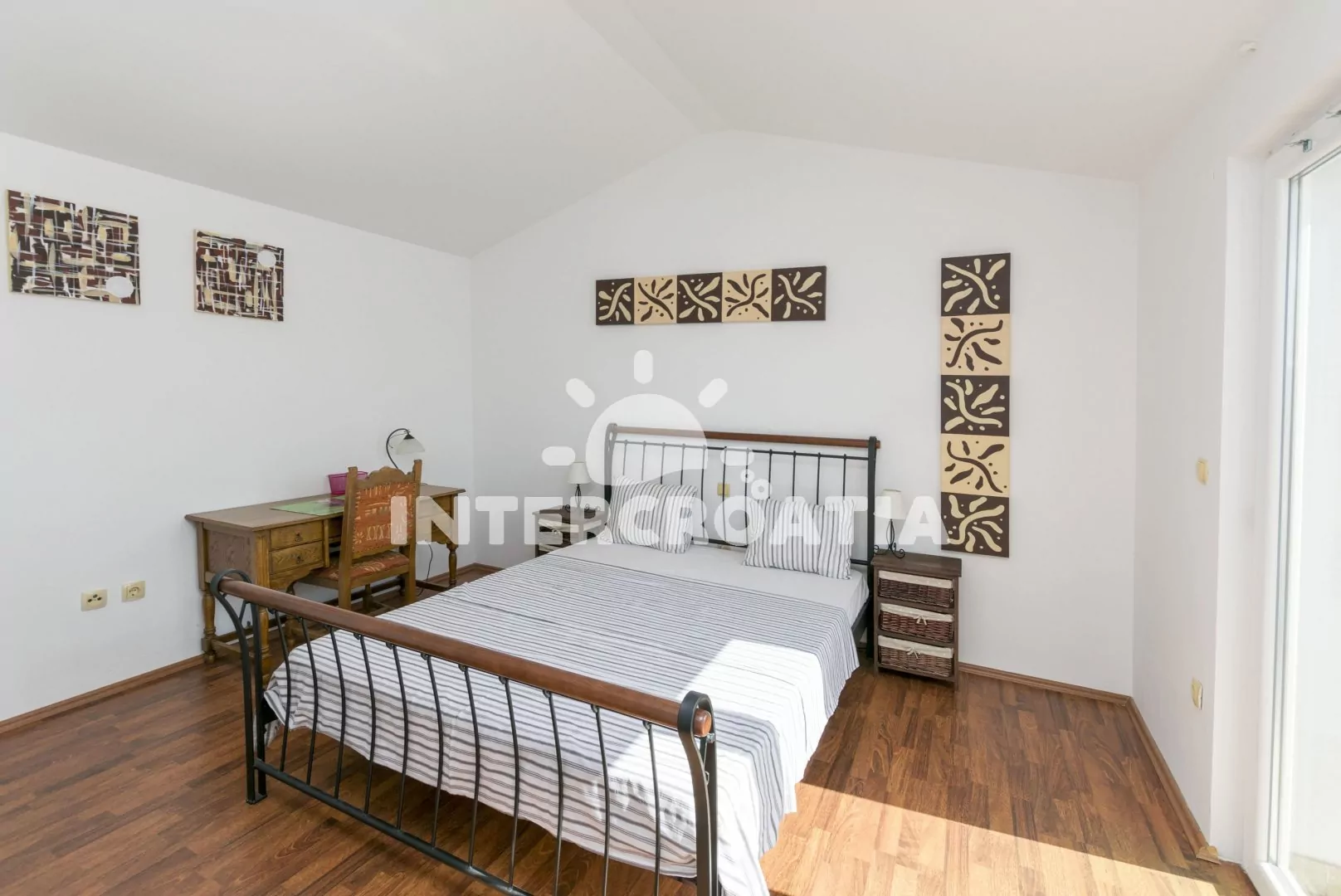 Luxusně zařízený podkrovní apartmán (90 m2) s terasou, venkovním posezením a výhledem na moře. Apartmán je vhodný pro 4 až 6 osob. Obývací pokoj je spojený s kuchyní. Kuchyňská linka je vybavena sklokeramickou varnou deskou, vestavěnou troubou, myčkou na nádobí, rychlovarnou konvicí, toustovačem, nádobím a lednicí s mrazákem. Obývací pokoj s jídelním stolem pro 6 osob, sedací soupravou, pohovkou, televizí se satelitním programem, klimatizací, francouzskými okny a vstupem na terasu. První ložnice je vybavena jedním dvoulůžkem a vstupem na balkon. Druhá ložnice s jedním dvoulůžkem, pohovkou (rozložitelná na extra lůžko pro 2 osoby) a vstupem na balkon. Koupelna se sprchovou vanou, umyvadlem a wc. Hostům je k dispozici parkování u objektu zdarma.