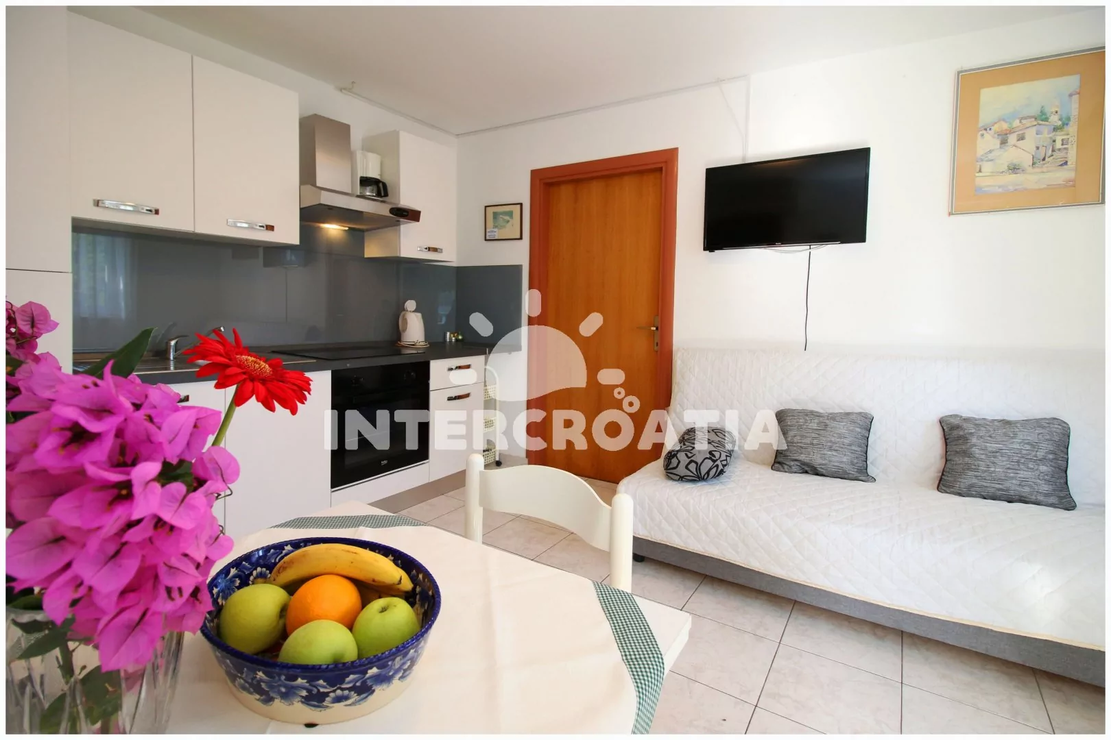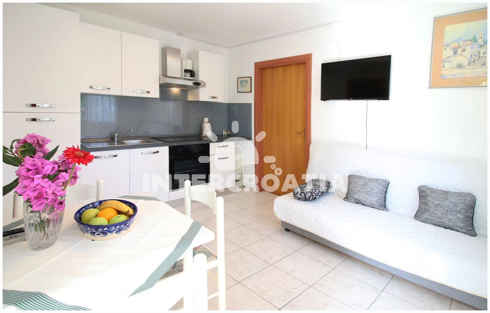 Apartmán s výhledem na moře se nachází v prvním patře vily a je vhodný pro 2 až 3 osoby. Obývací pokoj je spojený s kuchyní. Kuchyňská linka je vybavena dvouplotýnkovým sporákem, rychlovarnou konvicí…