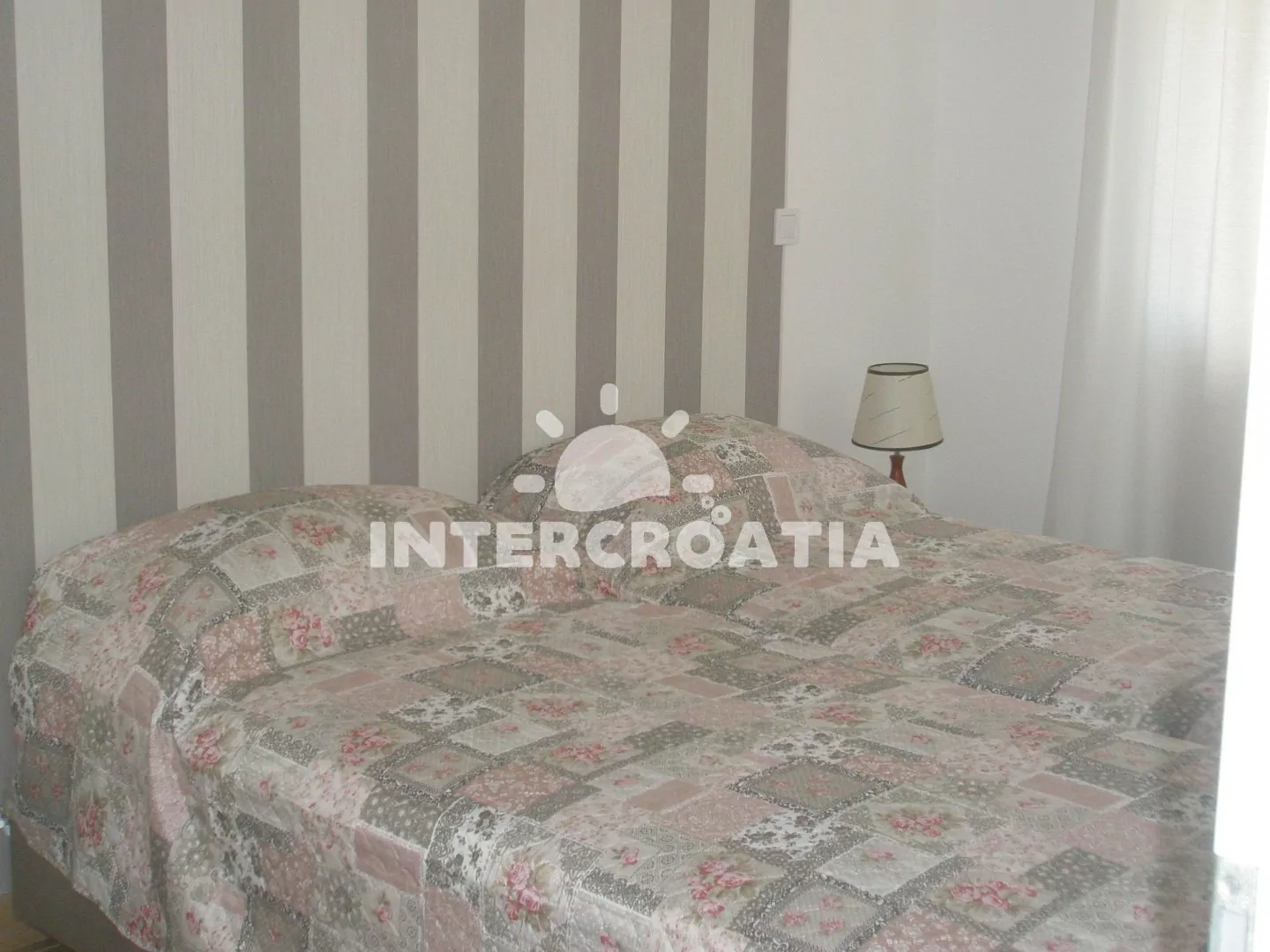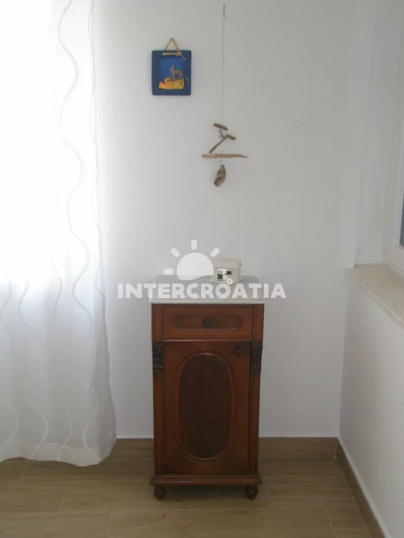 Apartmán (70 m2) s terasou a výhledem na moře se nachází v přízemí domu. Apartmán má 2 ložnice a je vhodný pro 4 osoby. Obývací pokoj je spojený s kuchyní. Kuchyňská linka je vybavena sklokeramickou varnou deskou, vestavěnou troubou, myčkou na nádobí, kávovarem, nádobím a lednicí s mrazákem. Obývací pokoj s jídelním stolem pro 4 osoby, pohovkou, televizí se satelitním programem, klimatizací a vstupem na terasu. První i druhá ložnice je vybavena vždy s jedním dvoulůžkem. Koupelna se sprchovým koutem, umyvadlem, pračkou, fénem a wc. Hostům je k dispozici parkování u objektu zdarma.