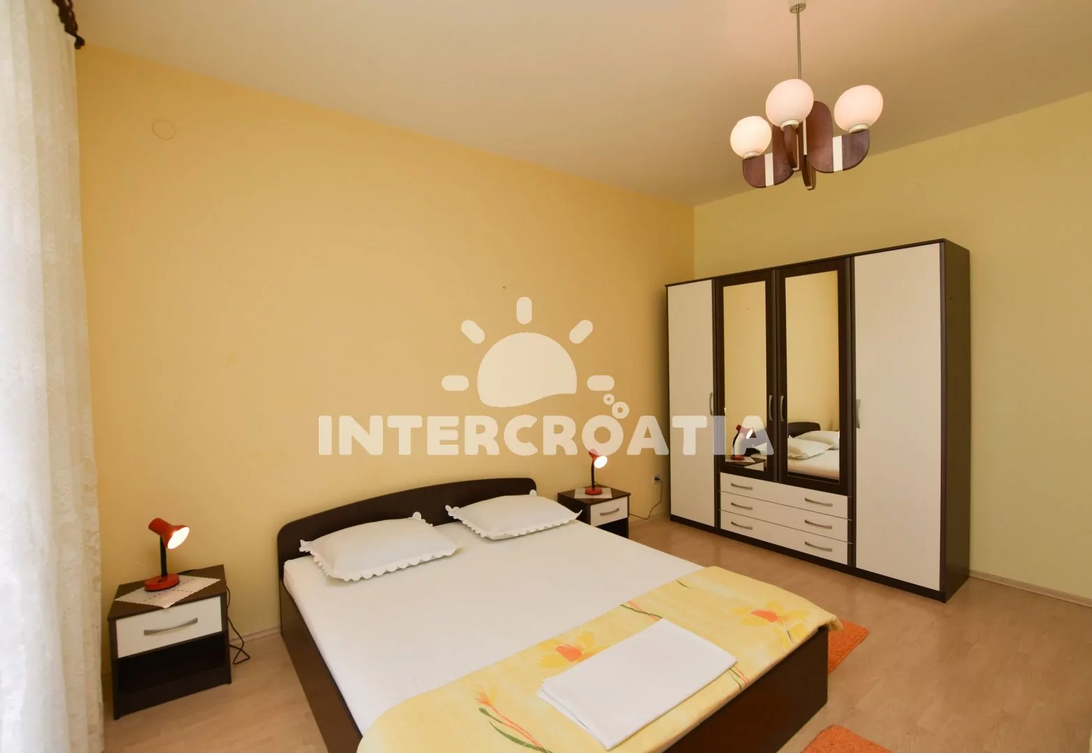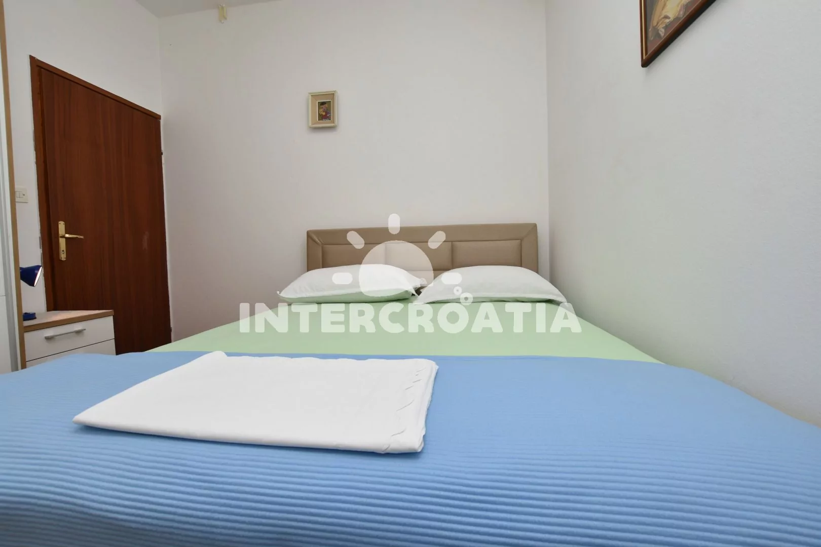 Apartmán (55 m2) s terasou a venkovním posezením se nachází v přízemí domu. Apartmán má 2 ložnice a je vhodný pro 4 osoby. Obývací pokoj je spojený s kuchyní. Kuchyňská linka je vybavena sporákem s troubou, digestoří, rychlovarnou konvicí, kávovarem, nádobím a lednicí s mrazákem. Obývací pokoj s jídelním stolem pro 4 osoby, pohovkou, televizí se satelitním programem, klimatizací a vstupem na terasu. První i druhá ložnice je vybavena vždy s jedním dvoulůžkem. Koupelna se sprchovým koutem, umyvadlem, pračkou a wc. Hostům je k dispozici parkování u objektu zdarma.