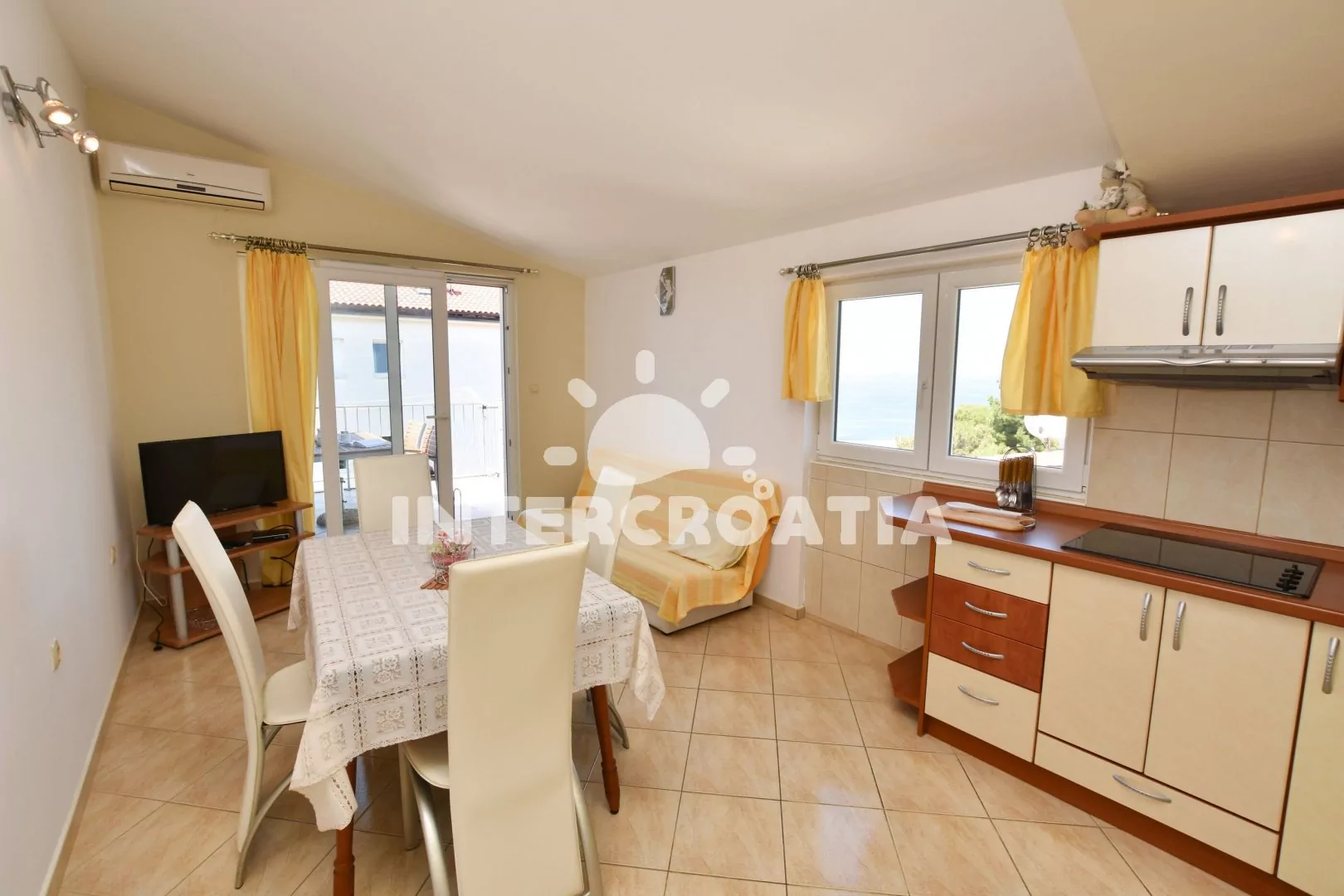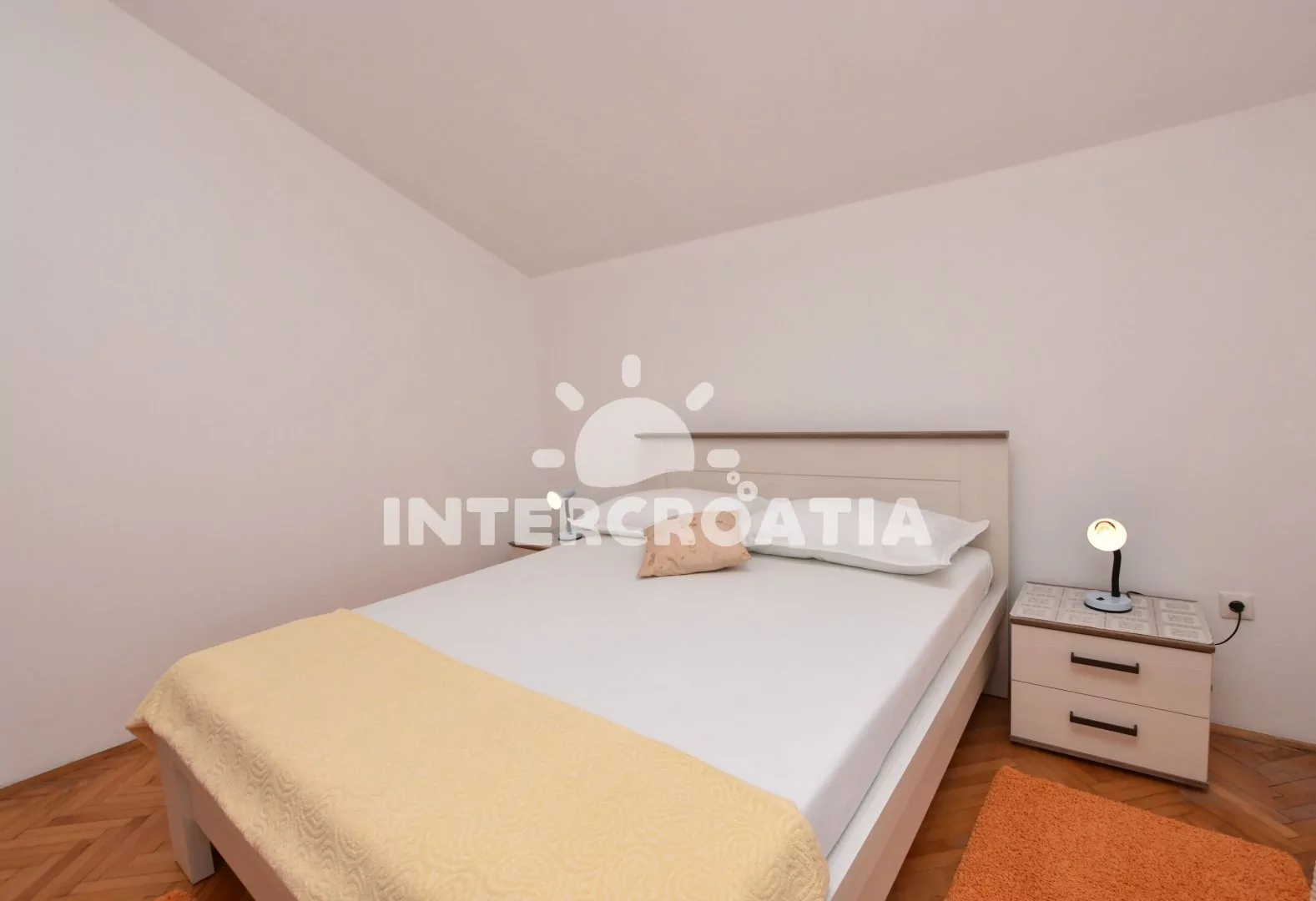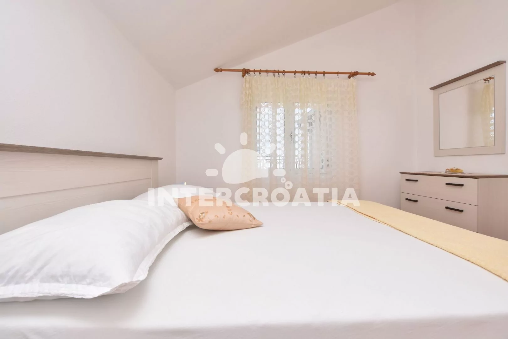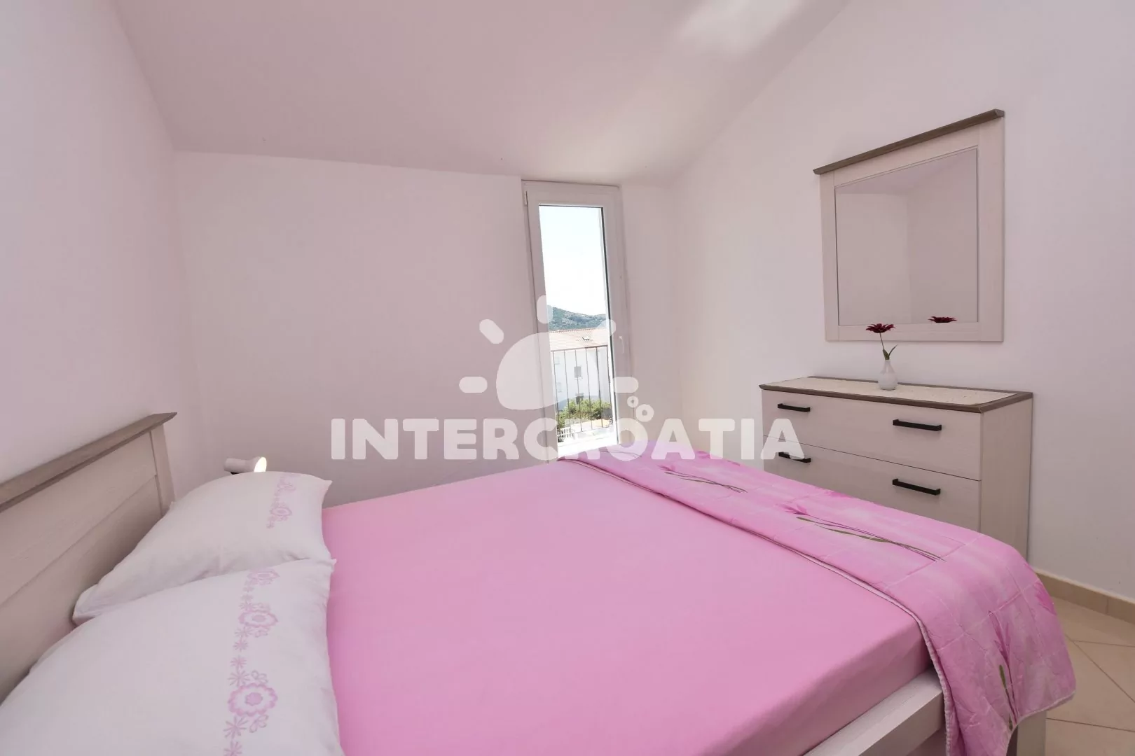 Podkrovní apartmán (55 m2) s terasou, posezením a výhledem na moře. Apartmán má 2 ložnicemi a je vhodný pro 4 osoby. Obývací pokoj je spojený s kuchyní. Kuchyňská linka je vybavena sklokeramickou varnou deskou, digestoří, rychlovarnou konvicí, kávovarem, nádobím a lednicí s mrazákem. Obývací pokoj s jídelním stolem pro 4 osoby, pohovkou, televizí se satelitním programem, klimatizací a vstupem na terasu. První i druhá ložnice je vybavena vždy s jedním dvoulůžkem. Koupelna se sprchovým koutem, umyvadlem a wc. Hostům je k dispozici parkování u objektu zdarma.