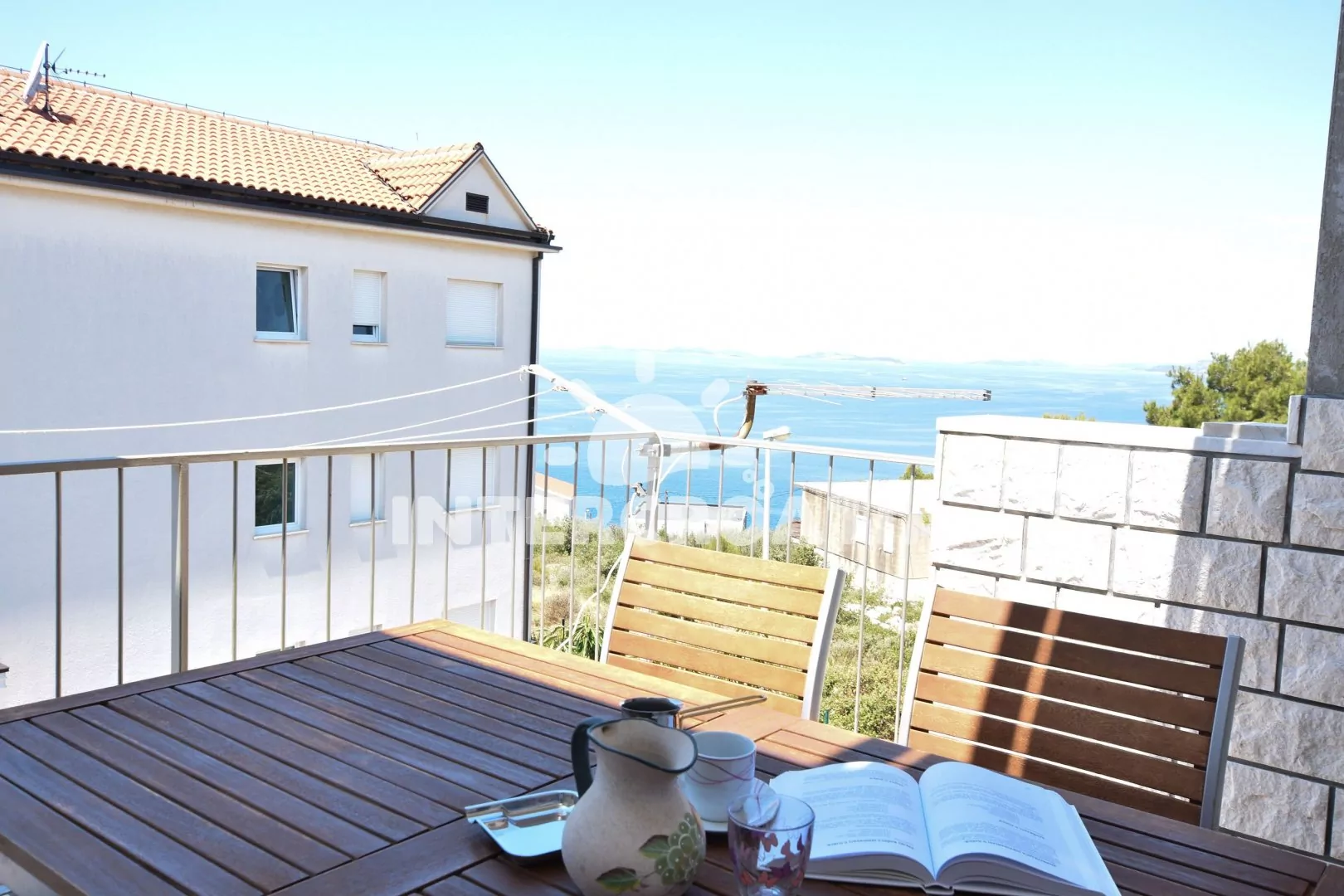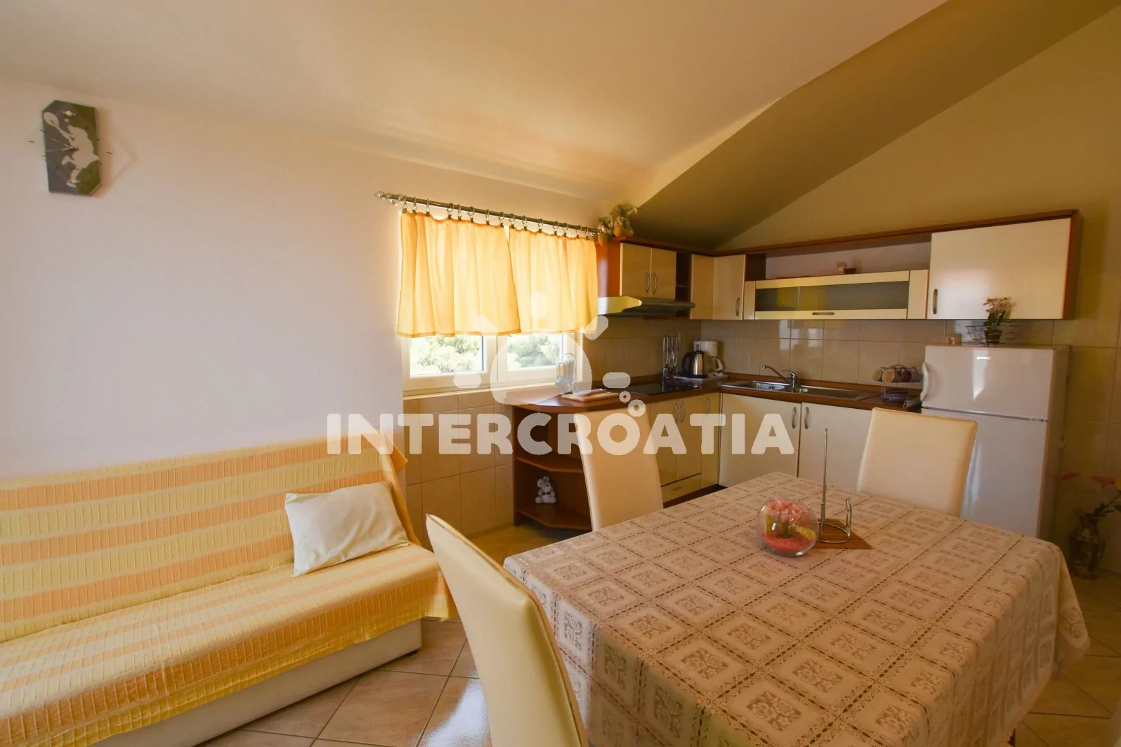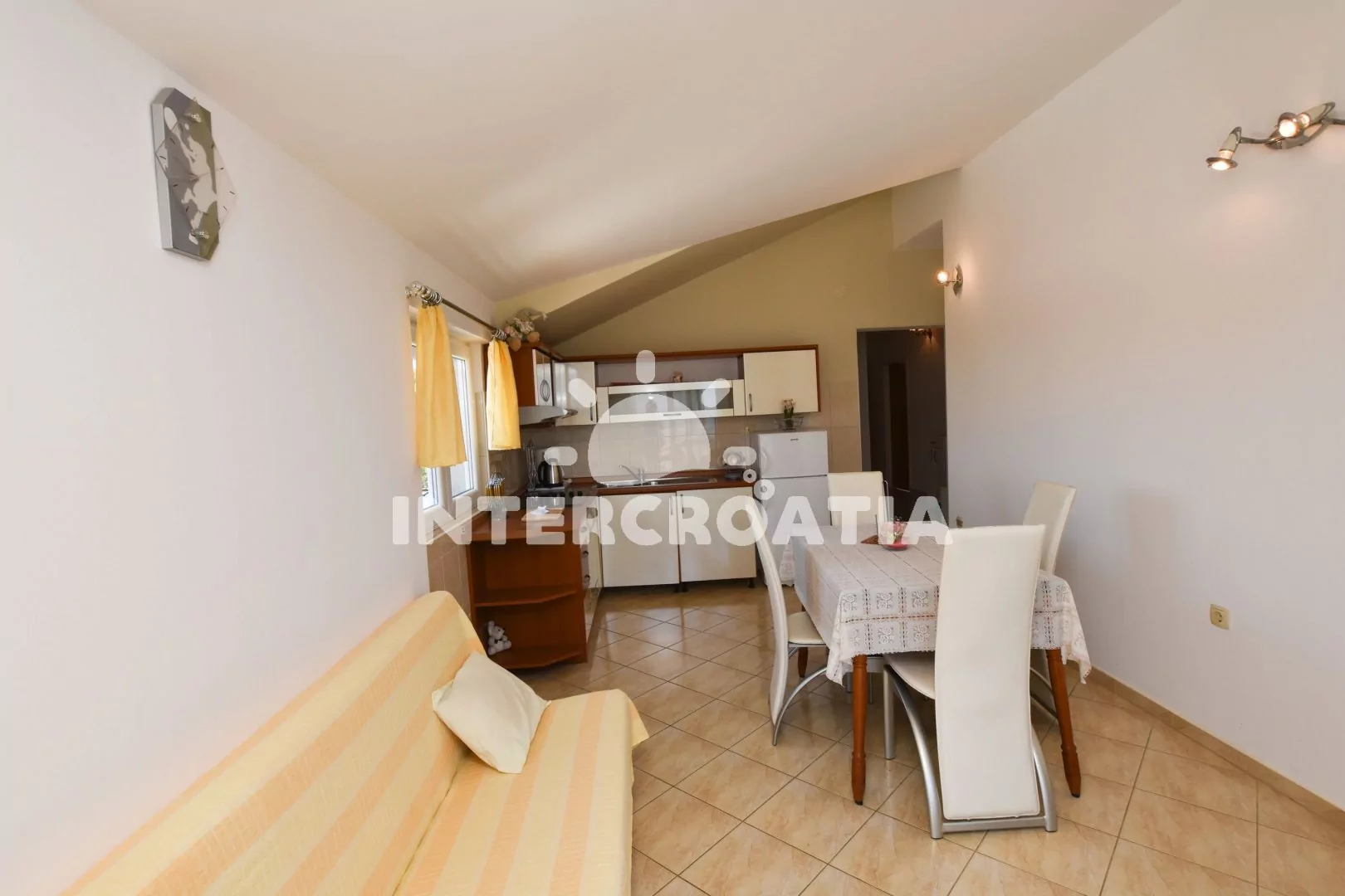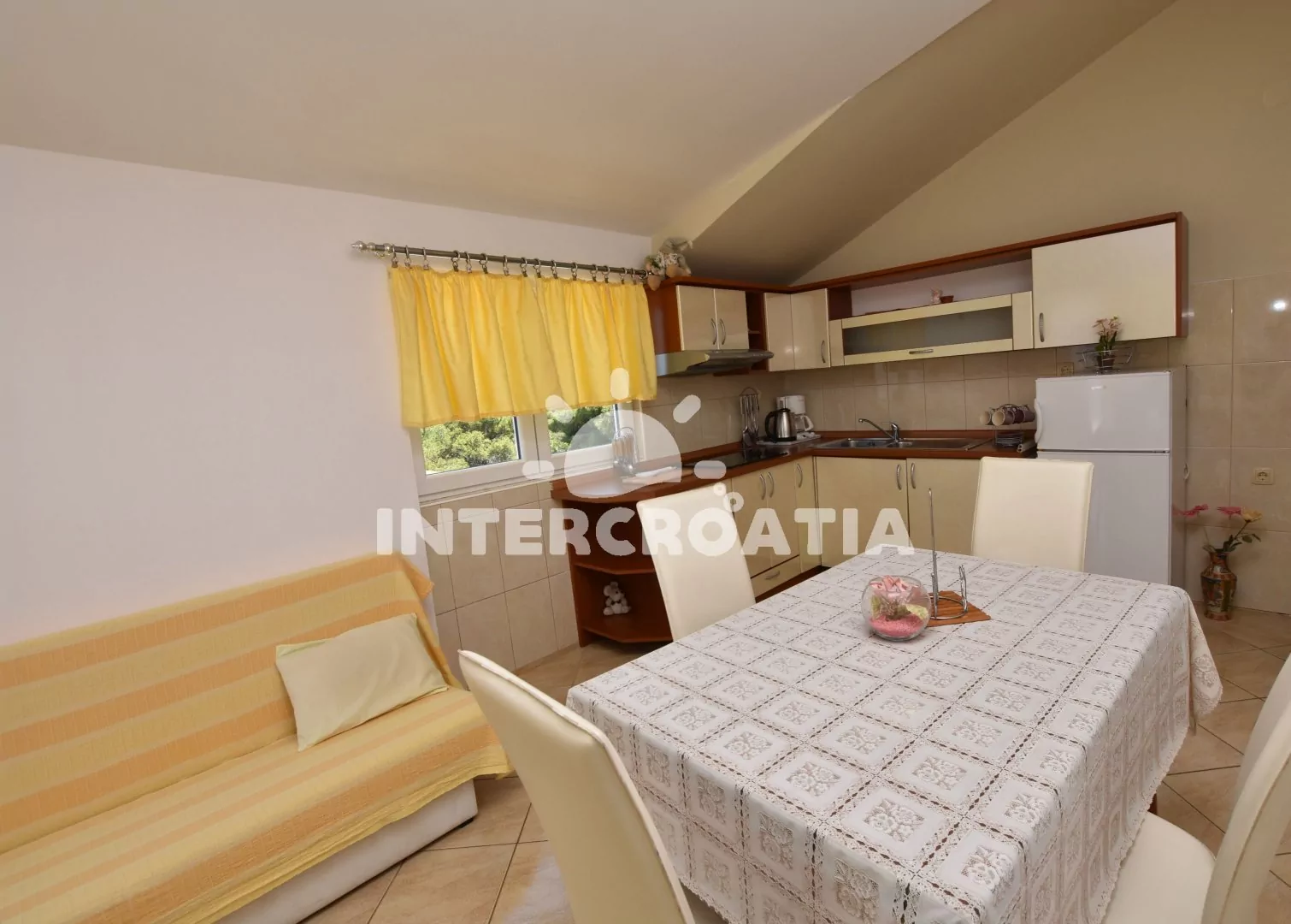 Podkrovní apartmán (55 m2) s terasou, posezením a výhledem na moře. Apartmán má 2 ložnicemi a je vhodný pro 4 osoby. Obývací pokoj je spojený s kuchyní. Kuchyňská linka je vybavena sklokeramickou varnou deskou, digestoří, rychlovarnou konvicí, kávovarem, nádobím a lednicí s mrazákem. Obývací pokoj s jídelním stolem pro 4 osoby, pohovkou, televizí se satelitním programem, klimatizací a vstupem na terasu. První i druhá ložnice je vybavena vždy s jedním dvoulůžkem. Koupelna se sprchovým koutem, umyvadlem a wc. Hostům je k dispozici parkování u objektu zdarma.