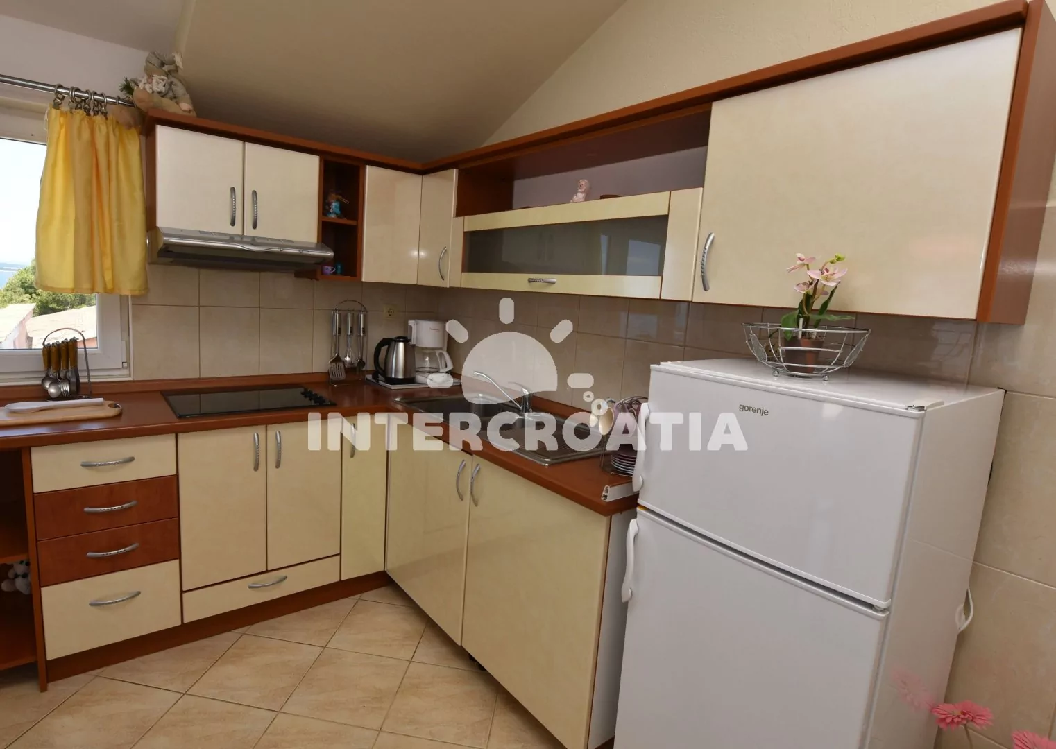 Podkrovní apartmán (55 m2) s terasou, posezením a výhledem na moře. Apartmán má 2 ložnicemi a je vhodný pro 4 osoby. Obývací pokoj je spojený s kuchyní. Kuchyňská linka je vybavena sklokeramickou…