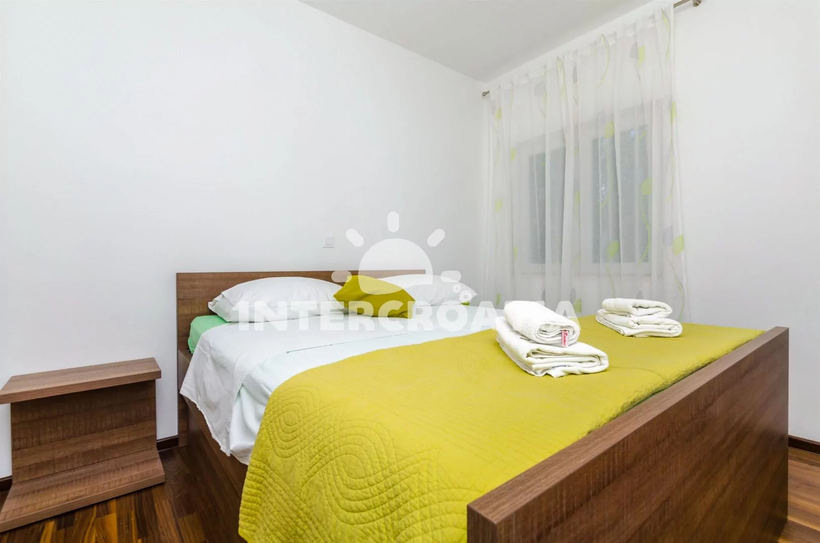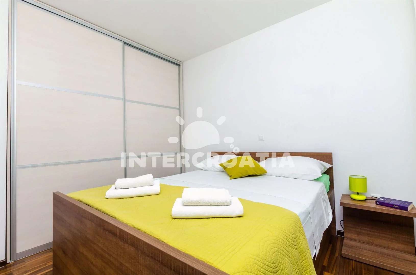 Apartmán (70 m2) s balkonem, venkovním posezením a výhledem do ulice se nachází v 1. patře domu. Apartmán má 2 ložnice a je vhodný pro až 4 osoby. Kuchyňská linka je vybavena sklokeramickou varnou deskou, digestoří, vestavěnou troubou, myčkou na nádobí, rychlovarnou konvicí, nádobím a lednicí s mrazákem. Obývací pokoj s jídelním stolem, pohovkou, televizí se satelitním programem, rádiem, klimatizací a vstupem na balkon. První i druhá ložnice je vybavena vždy s jedním dvoulůžkem. Koupelna se sprchovým koutem, umyvadlem, pračkou a wc. Hostům je k dispozici parkování u objektu zdarma.