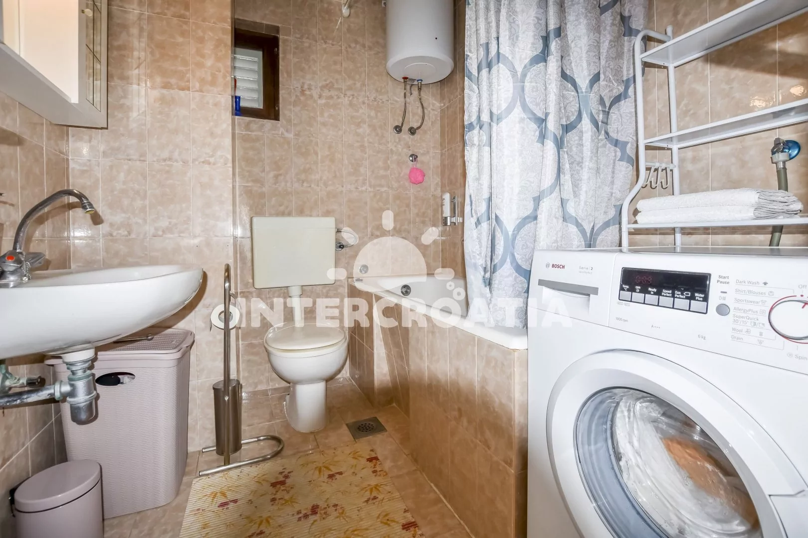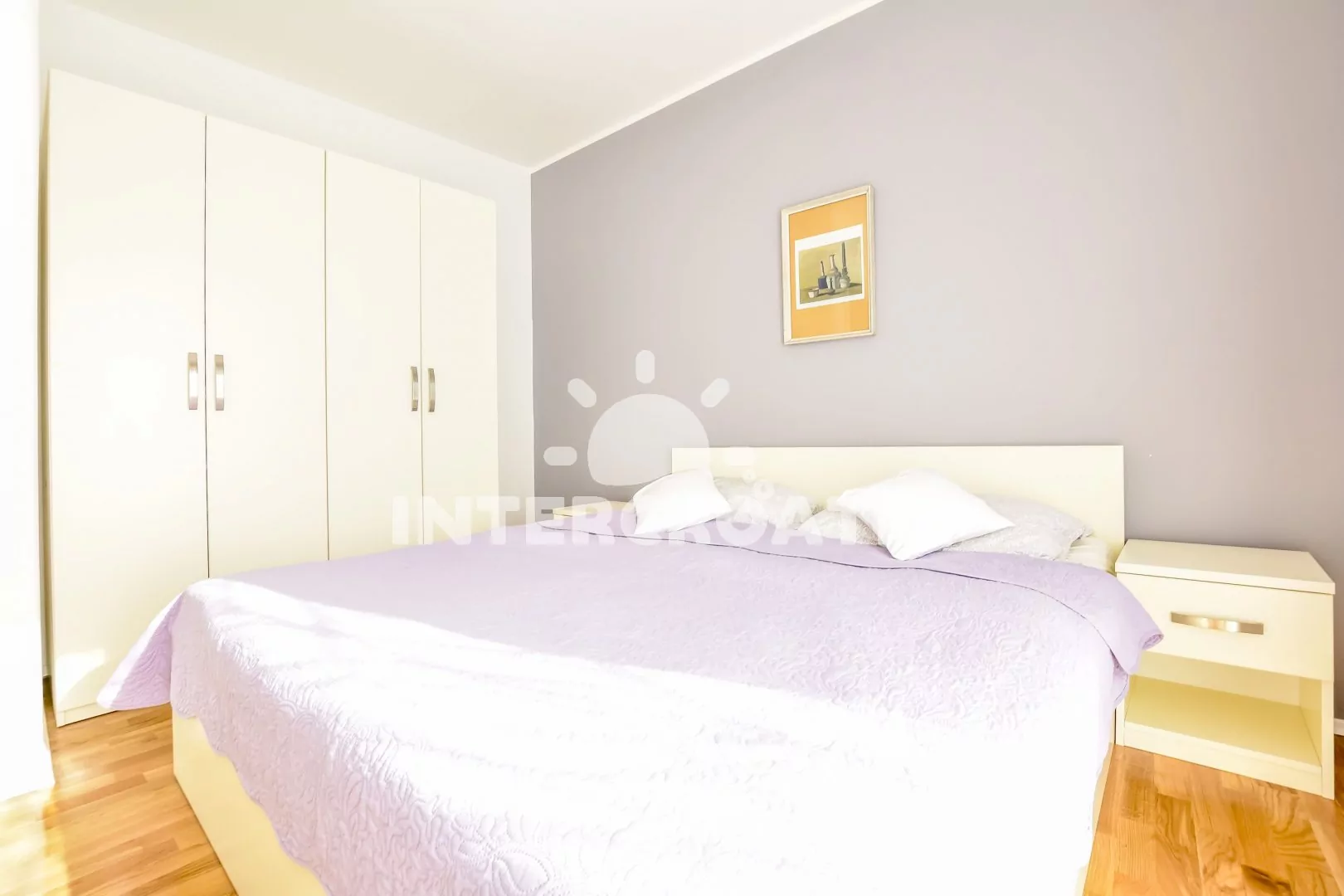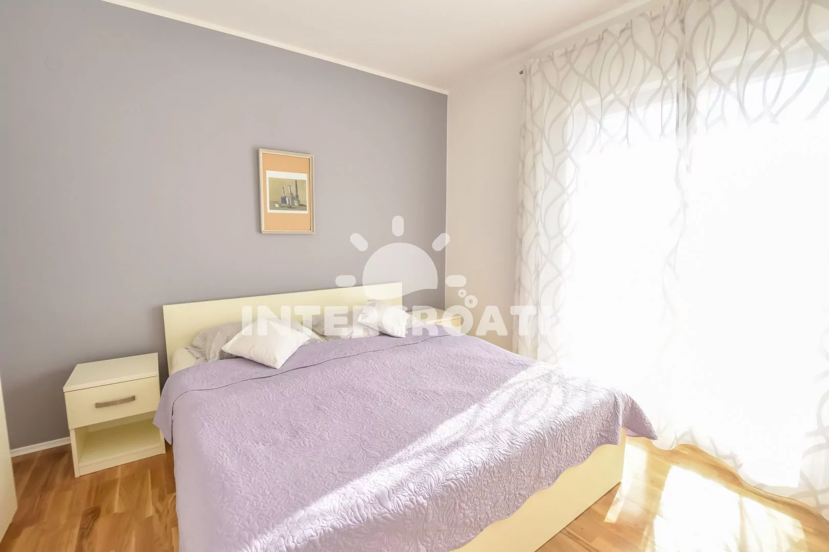 Apartmán (45 m2) s balkonem, terasou a výhledem na moře se nachází v 1. patře domu. Apartmán má 1 ložnici a je vhodný pro 2 až 4 osoby. Obývací pokoj je spojený s kuchyní. Kuchyňská linka je vybavena sklokeramickou varnou deskou, digestoří, vestavěnou troubou, myčkou na nádobí, rychlovarnou konvicí, kávovarem, nádobím a lednicí s mrazákem. Obývací pokoj s jídelním stolem, pohovkou (rozložitelná na extra lůžko pro 2 osoby), televizí se satelitním programem, klimatizací a vstupem na balkon. Ložnice s jedním dvoulůžkem. Koupelna s vanou, umyvadlem, pračkou a wc. Hostům je k dispozici parkování pro automobily 500 - 1000 m od objektu zdarma.