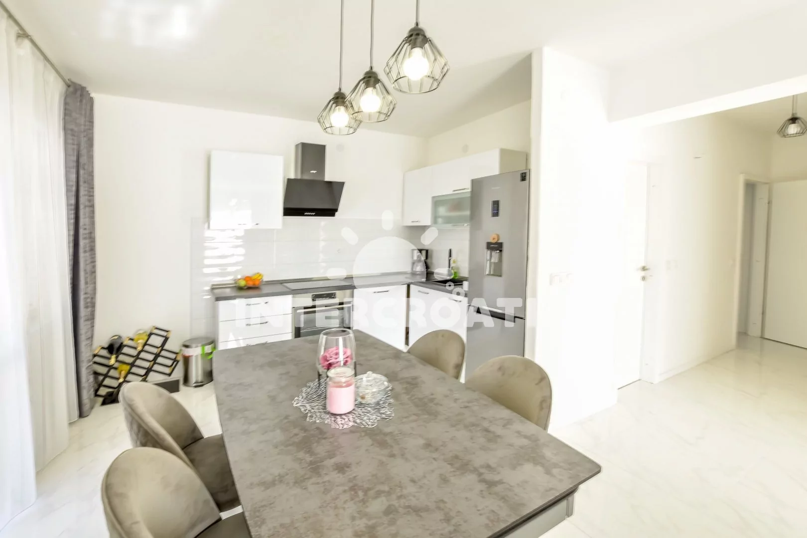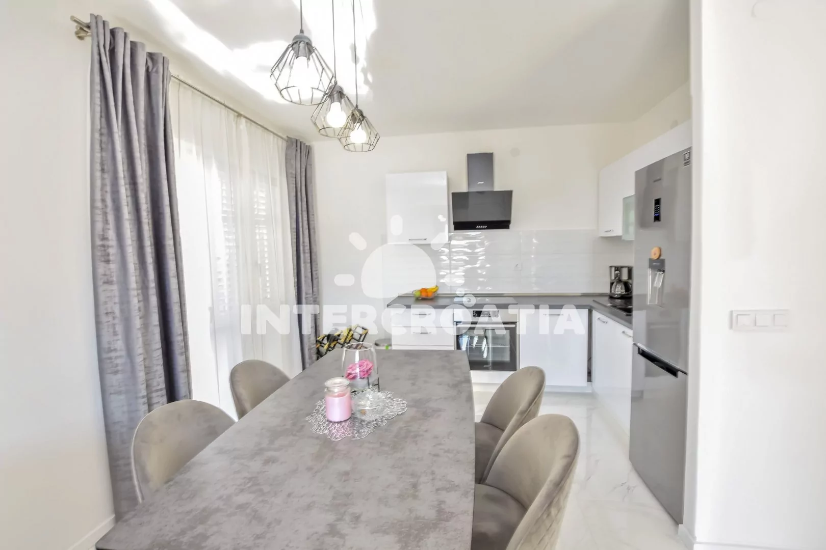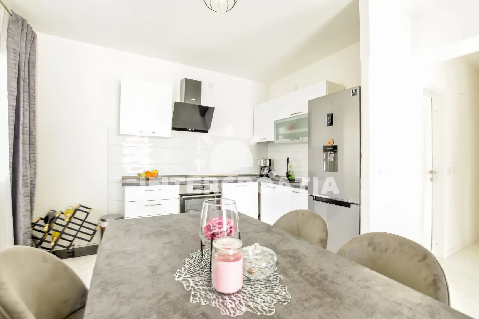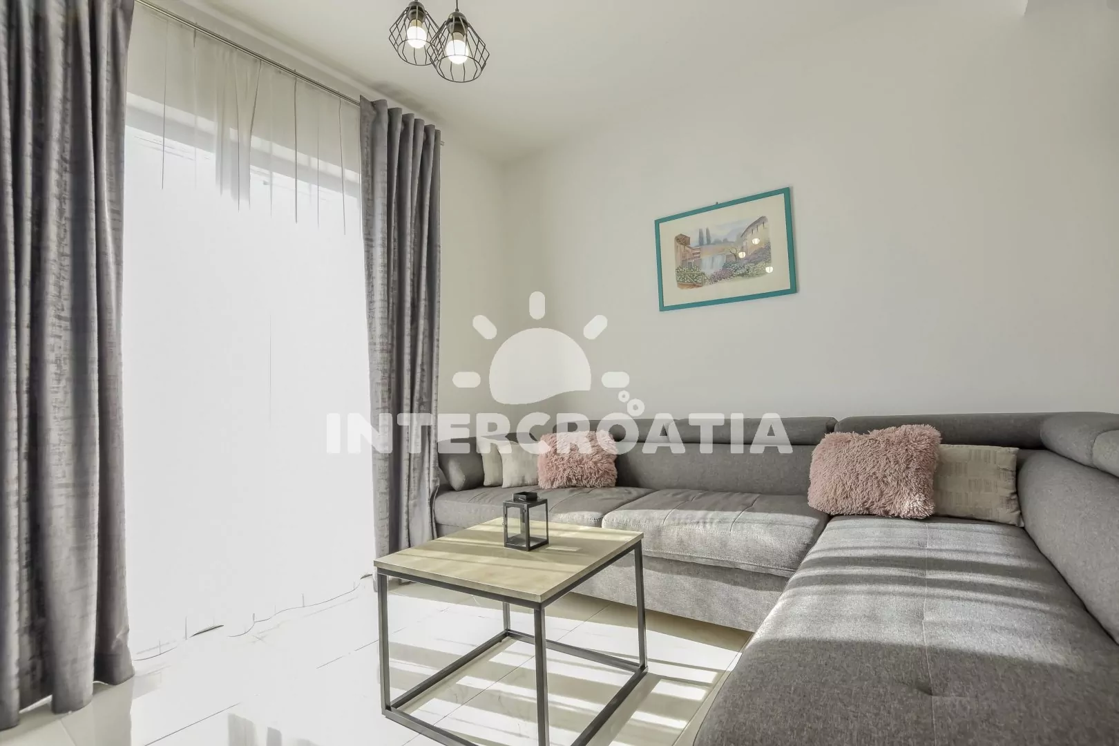 Apartmán (45 m2) s balkonem, terasou a výhledem na moře se nachází v 1. patře domu. Apartmán má 1 ložnici a je vhodný pro 2 až 4 osoby. Obývací pokoj je spojený s kuchyní. Kuchyňská linka je vybavena sklokeramickou varnou deskou, digestoří, vestavěnou troubou, myčkou na nádobí, rychlovarnou konvicí, kávovarem, nádobím a lednicí s mrazákem. Obývací pokoj s jídelním stolem, pohovkou (rozložitelná na extra lůžko pro 2 osoby), televizí se satelitním programem, klimatizací a vstupem na balkon. Ložnice s jedním dvoulůžkem. Koupelna s vanou, umyvadlem, pračkou a wc. Hostům je k dispozici parkování pro automobily 500 - 1000 m od objektu zdarma.