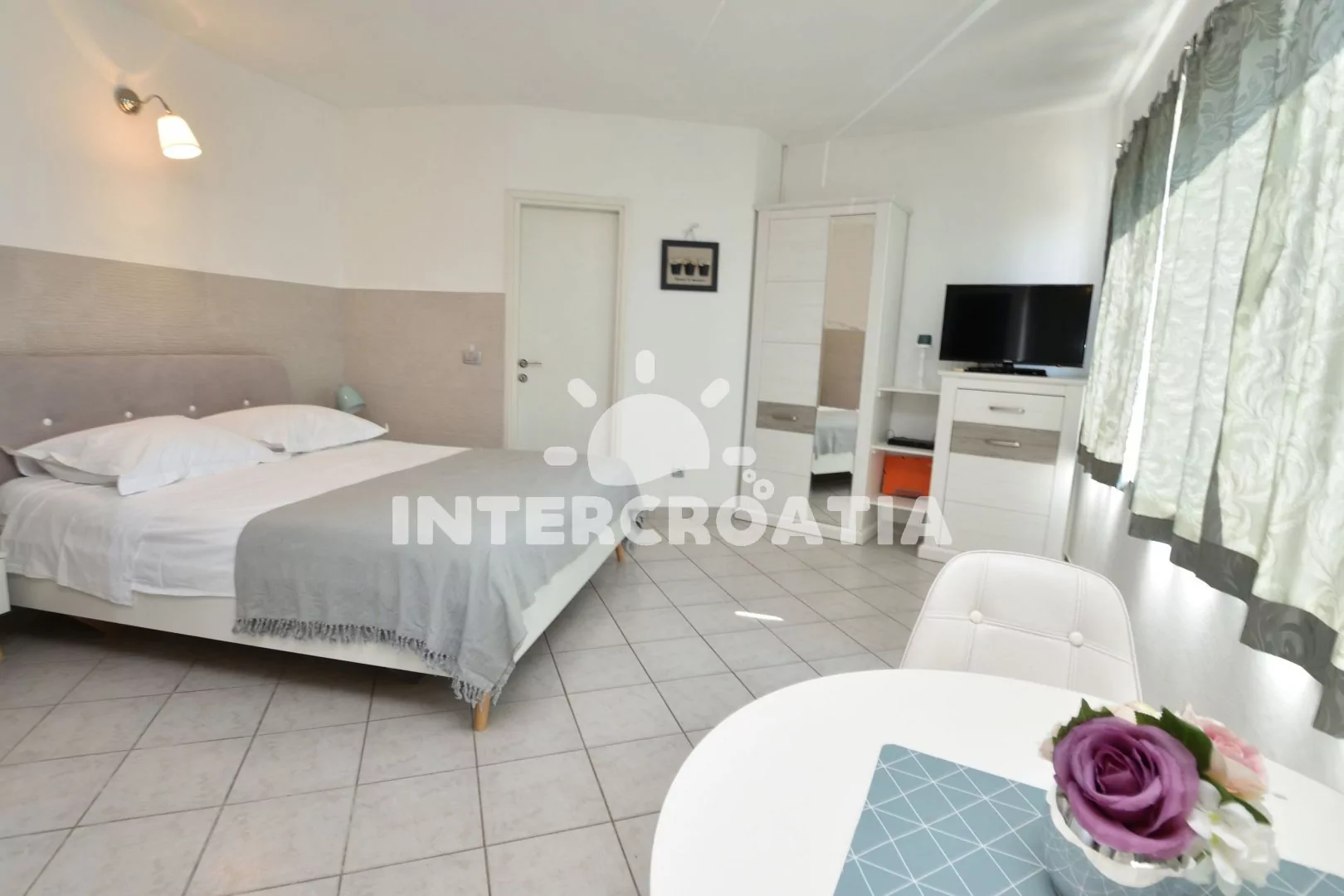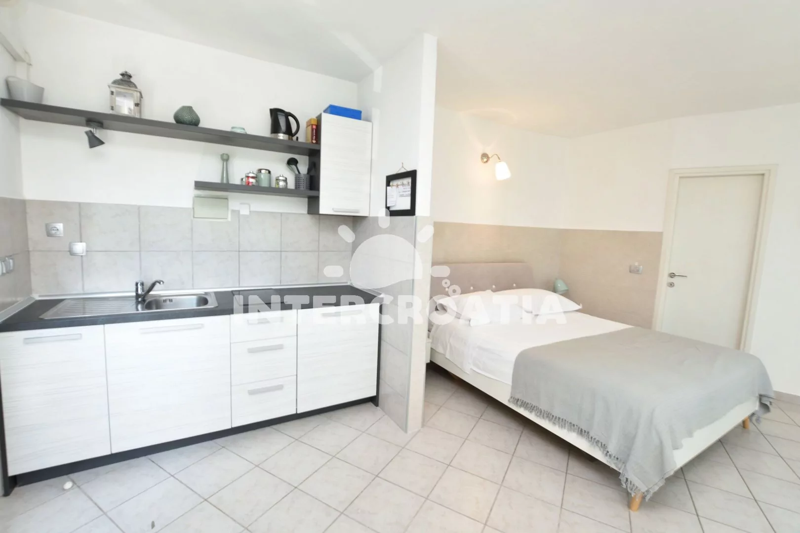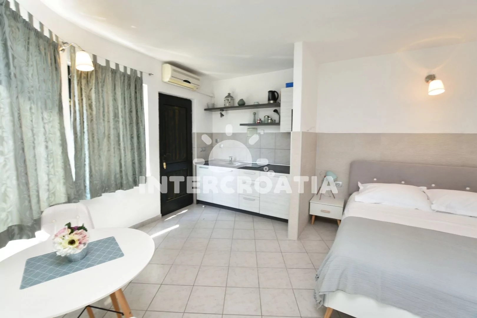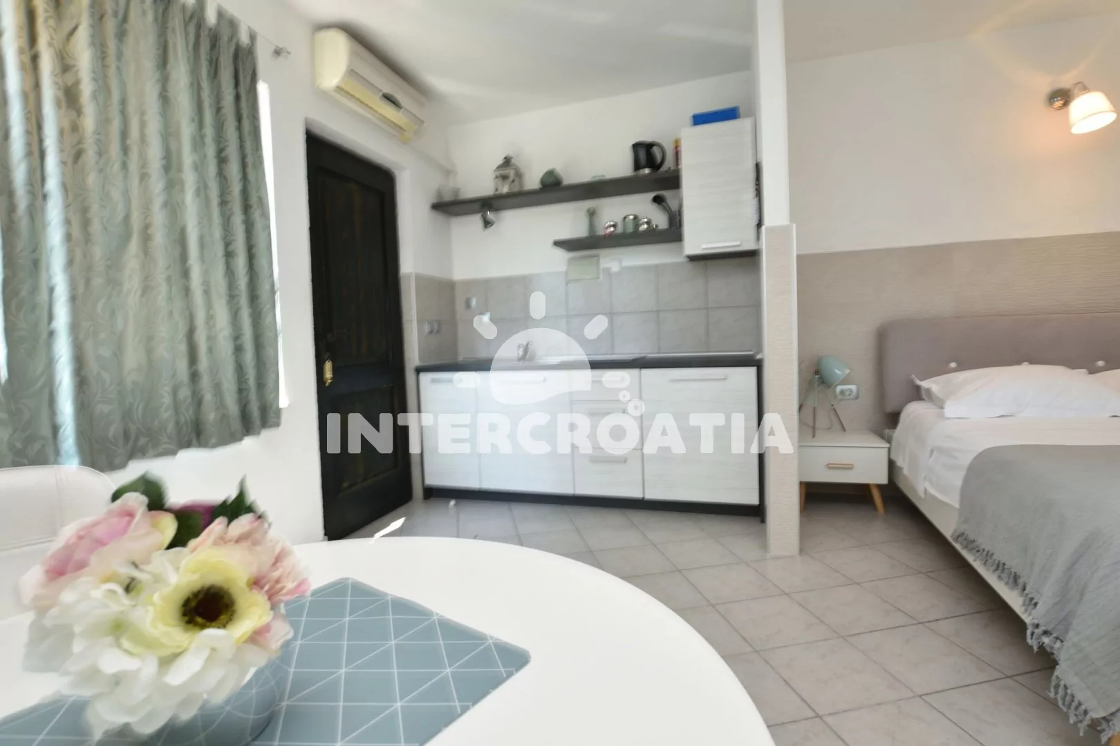 Apartmán (25 m2) typu studio s balkonem a výhledem na moře se nachází v 1. patře domu. Apartmán je vhodný pro 2 osoby. Obývací místnost je spojena s kuchyní. Kuchyňská linka je vybavena dvouplotýnkovým vařičem, rychlovarnou konvicí, kávovarem, nádobím a lednicí s mrazákem. Obývací místnost s jídelním stolem, dvoulůžkem, televizí se satelitním programem, klimatizací a vstupem na balkon. Koupelna se sprchovým koutem, umyvadlem, fénem a wc. Hostům je k dispozici parkování u objektu zdarma.