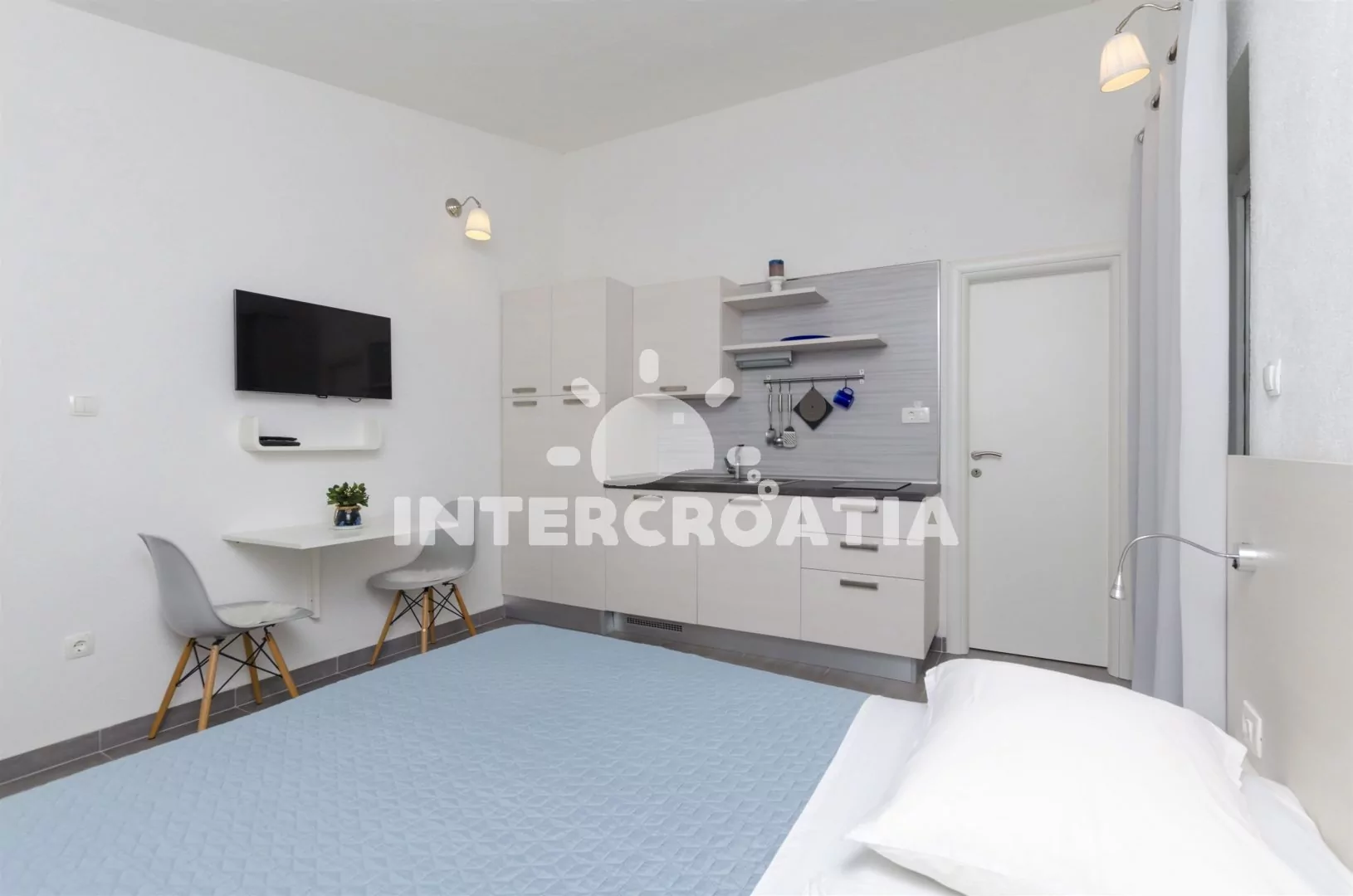 Podkrovní apartmán (25 m2) typu studio s balkonem a výhledem na moře. Apartmán je vhodný pro 2 osoby. Obývací místnost je spojena s kuchyní. Kuchyňská linka je vybavena dvouplotýnkovým vařičem, rychlovarnou konvicí, nádobím a lednicí s mrazákem. Obývací místnost s jídelním stolem, dvoulůžkem, televizí se satelitním programem, klimatizací a vstupem na balkon. Koupelna se sprchovým koutem, umyvadlem, fénem a wc. Hostům je k dispozici parkování u objektu zdarma.