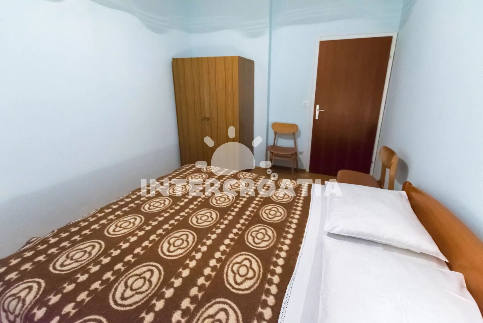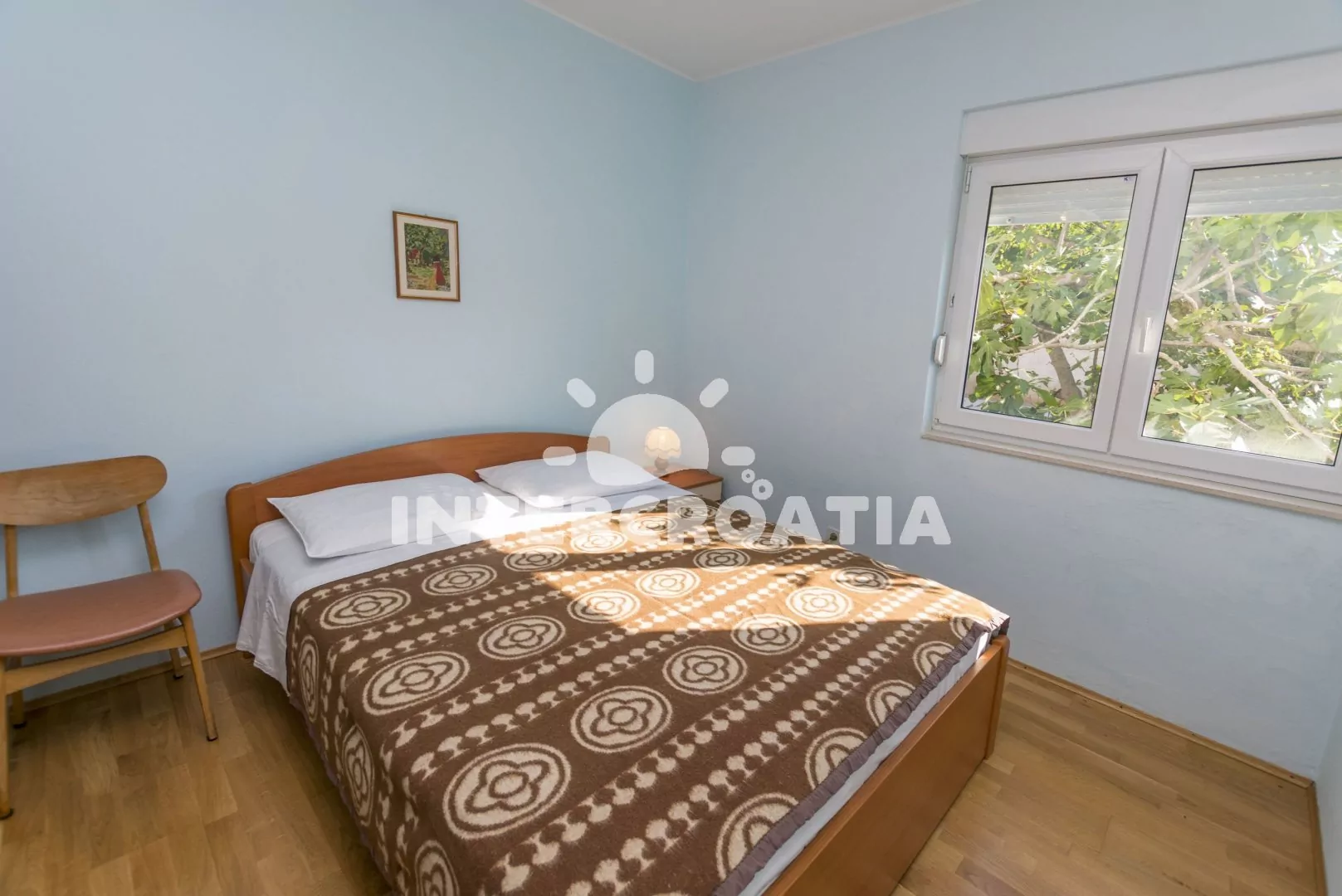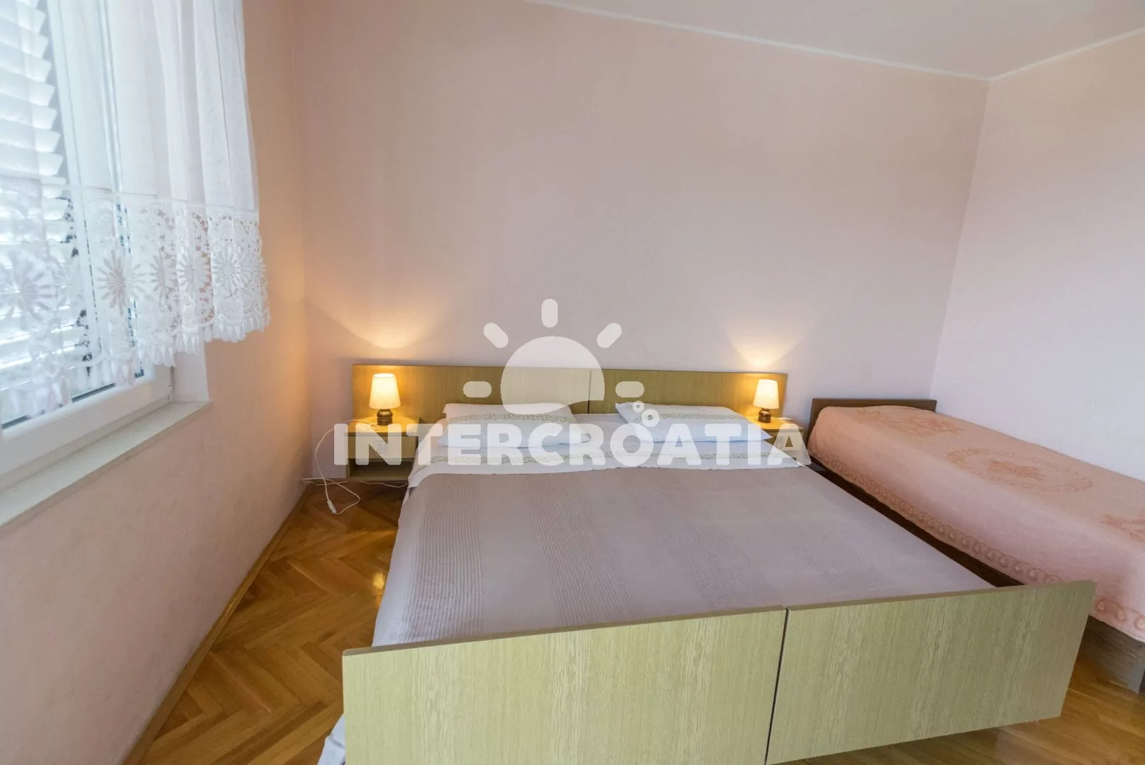 Apartmán (50 m2) s balkonem a výhledem na moře se nachází v 1. patře domu. Apartmán má 2 ložnice a je vhodný pro až 5 osob. Kuchyň s jídelním stolem a kuchyňskou linkou. Kuchyňská linka je vybavena sporákem s troubou, rychlovarnou konvicí, nádobím a lednicí s mrazákem. První ložnice s dvoulůžkem, jednolůžkem, klimatizací a vstupem na balkon. Druhá ložnice s dvoulůžkem. Koupelna se sprchovým koutem, umyvadlem a wc. Hostům je k dispozici parkování u objektu zdarma.