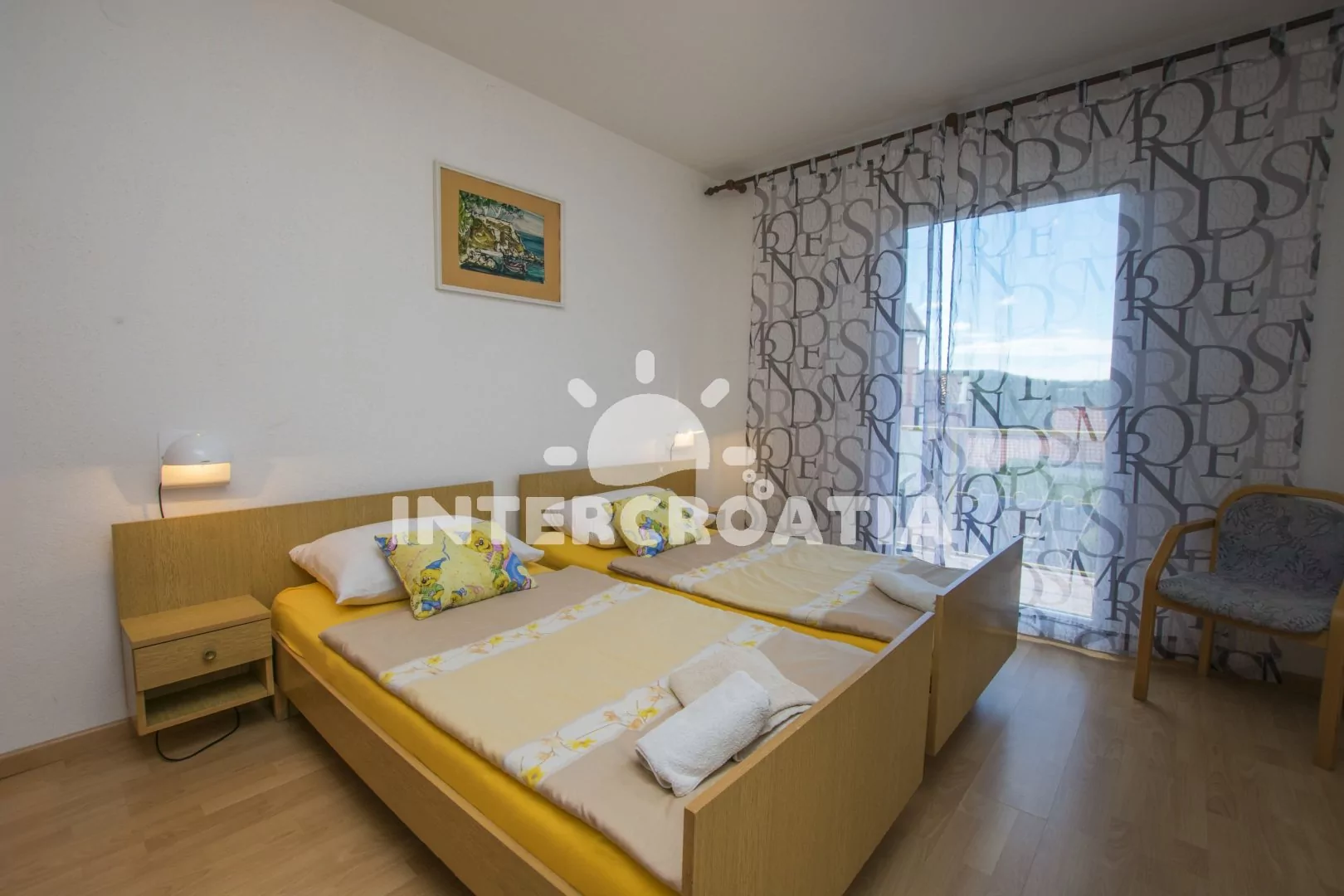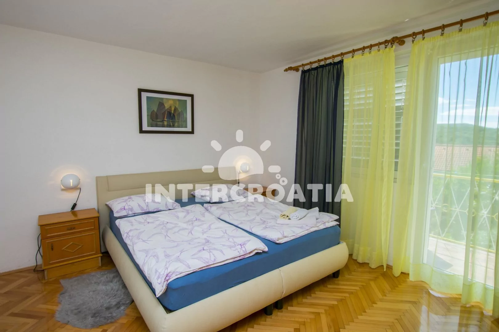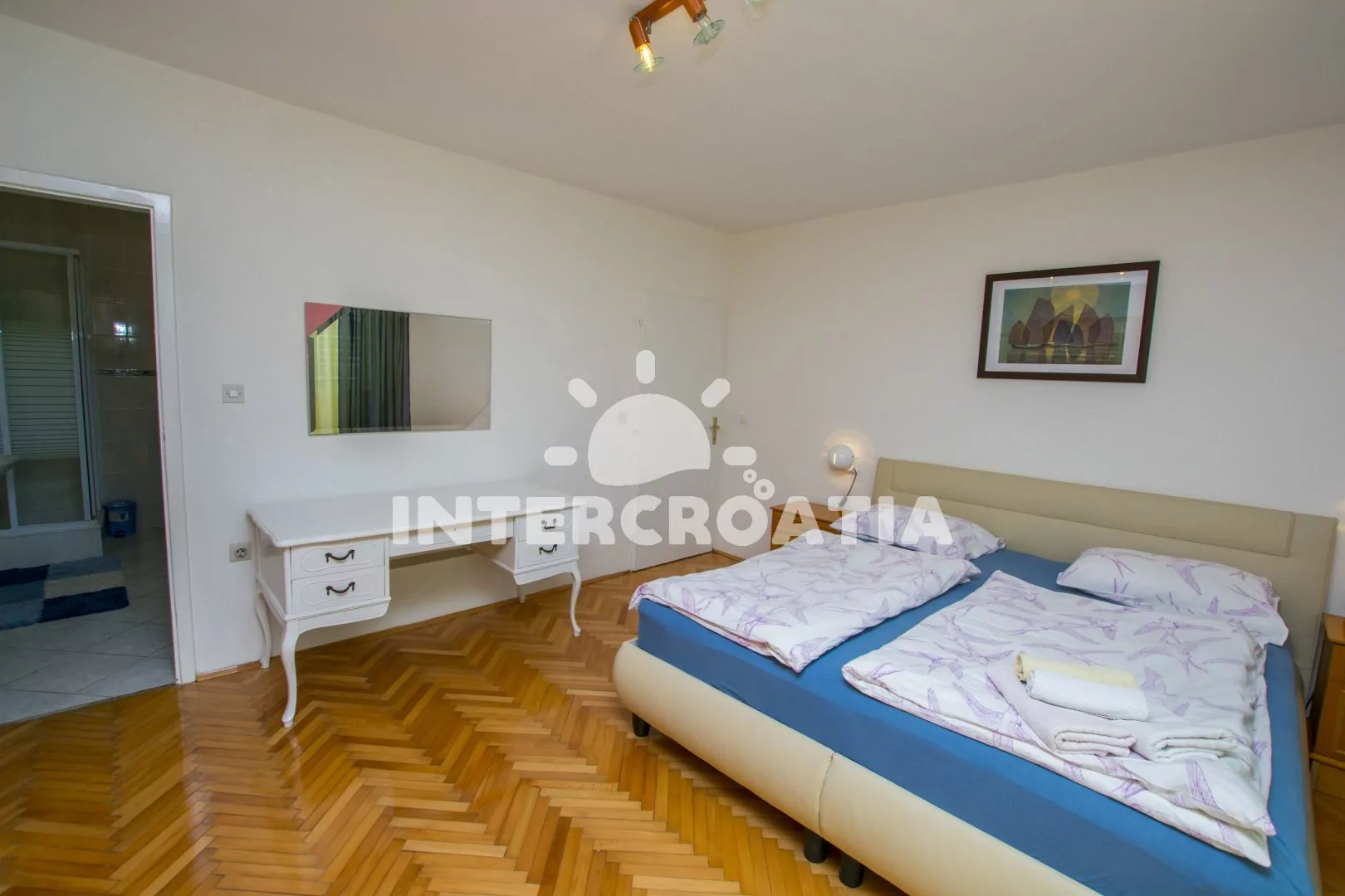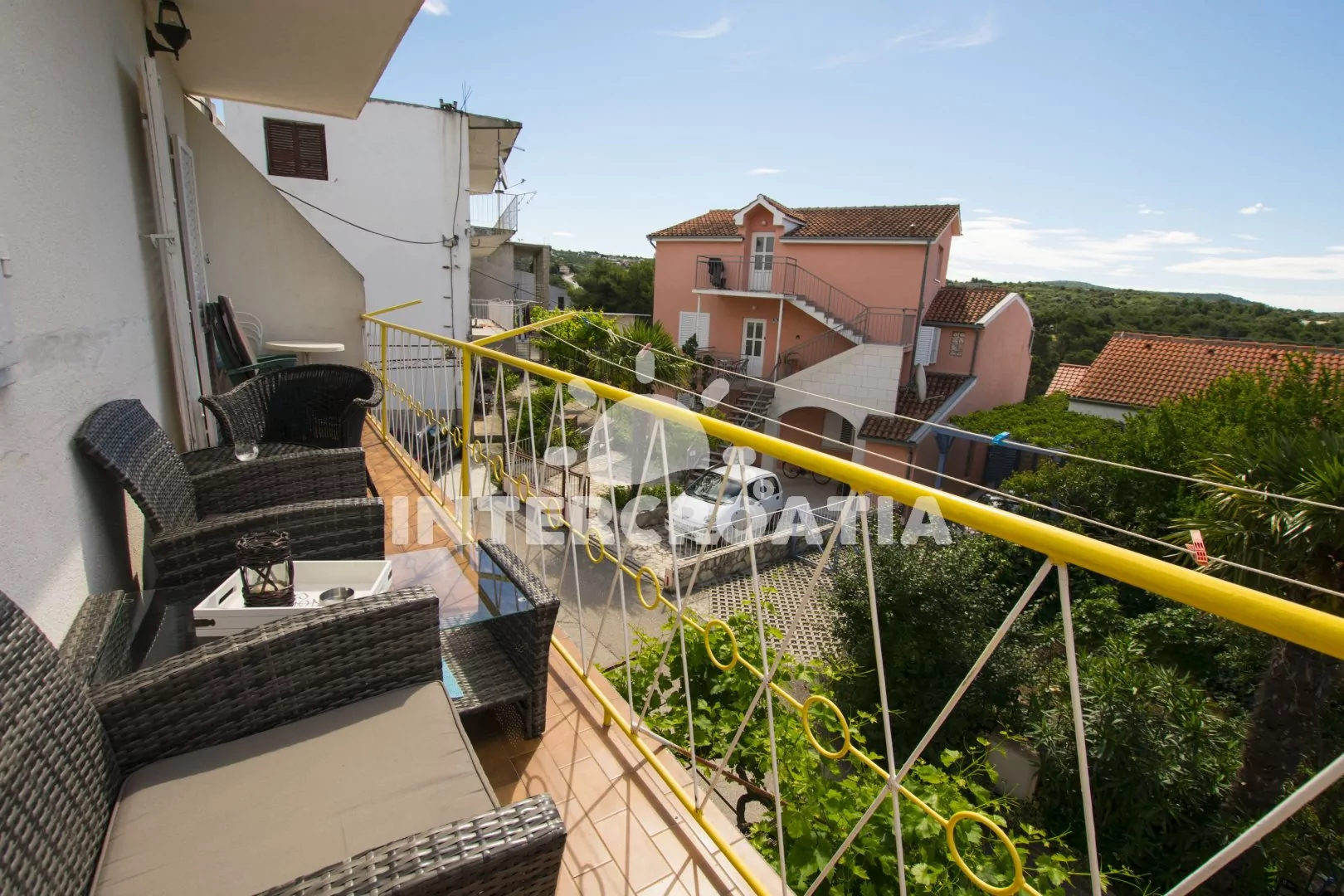 Apartmán (80 m2) s balkonem, posezením, výhledem do zahrady a částečně na moře se nachází ve 2. patře domu. Apartmán má 3 ložnice, 2 koupelny a je vhodný pro 6 až 7 osob. Obývací pokoj je spojený s kuchyní. Kuchyňská linka je vybavena sporákem s troubou, myčkou na nádobí, rychlovarnou konvicí, kávovarem, mikrovlnnou troubou, toustovačem, nádobím a lednicí s mrazákem. Obývací pokoj s jídelním stolem, pohovkou (rozložitelná na extra lůžko pro 1 osobu), televizí se satelitním programem a klimatizací. Koupelna se sprchovým koutem, umyvadlem, fénem a wc. Hostům je k dispozici parkování u objektu zdarma. První ložnice s dvěma jednolůžky a vstupem na balkon. Druhá ložnice s dvoulůžkem a vstupem na balkon. Třetí ložnice s dvoulůžkem. První koupelna se sprchovým koutem, umyvadlem a wc. Druhá koupelna s vanou, umyvadlem, pračkou, fénem, bidetem a wc. Hostům je k dispozici parkování u objektu zdarma.